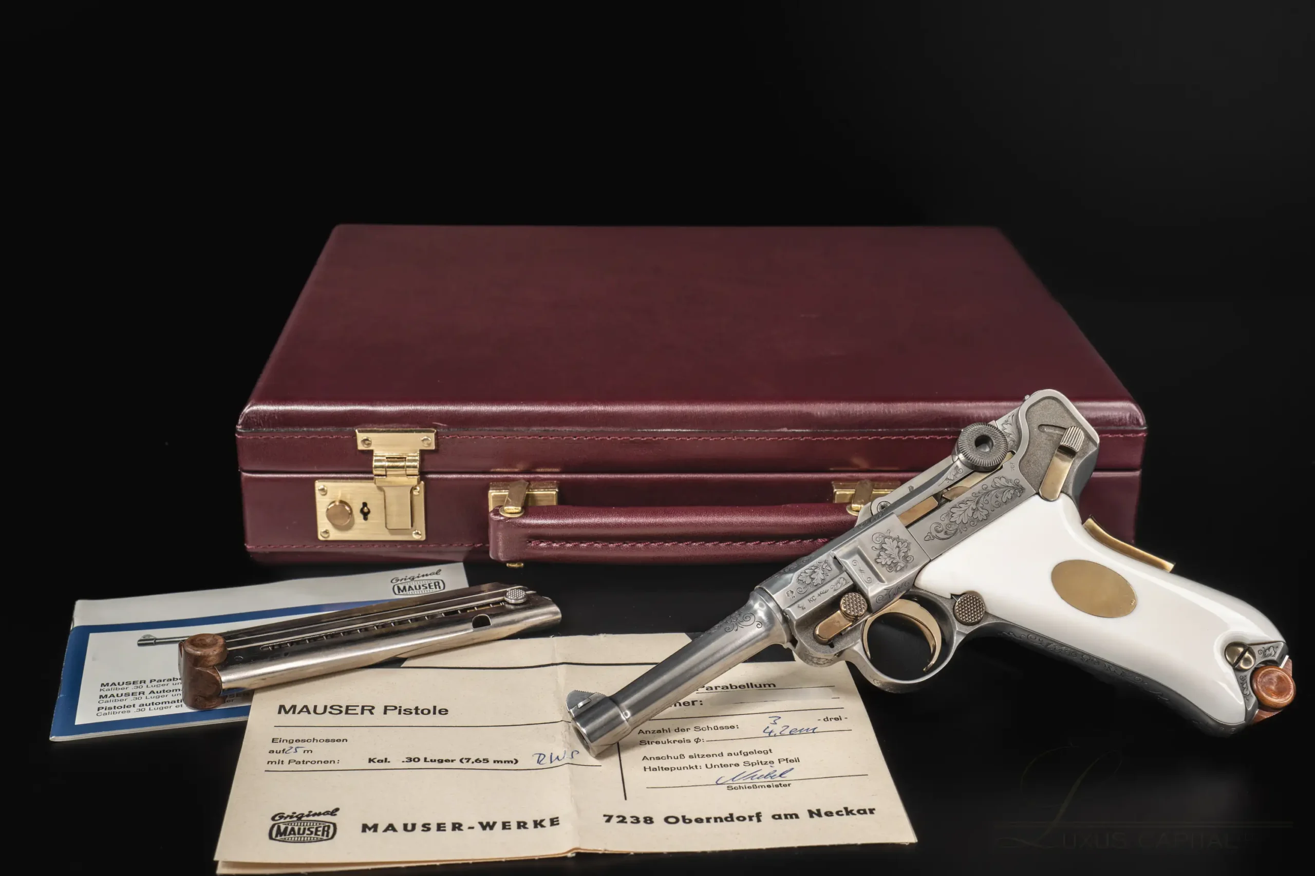 Accompanying the pistol is a period presentation case, along with factory documentation and accessories, further reinforcing its status as a curated exhibition piece rather than a standard commercial production firearm.