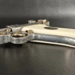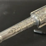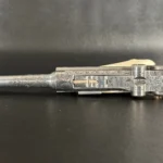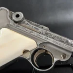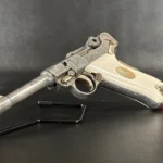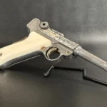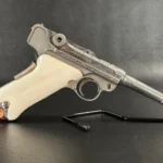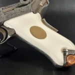 The detail doesn’t stop at the metal. The ivory grips, adorned with brass medallions, add warmth and balance to the Luger’s bold presence. Their smooth texture and natural tone contrast beautifully with the engraved steel, creating an interplay of color and material that’s both elegant and commanding. Every design element feels intentional—crafted not just to impress, but to endure.