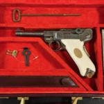 Presented in a classic Mauser red leather briefcase, this pistol is as much about presentation as preservation. The case itself is part of the story—a luxurious housing that underscores the Luger’s collectible value. Inside, the original paperwork provides the provenance and authenticity that serious collectors demand, grounding this beautiful firearm in its historical and artistic context.