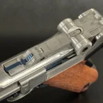 The Mauser P08 Luger, displayed at IWA, is a breathtaking fusion of heritage, artistry, and precision. With its 4-inch barrel and stainless steel finish, this pistol captures the timeless elegance of German engineering while showcasing the meticulous attention to detail that defines Mauser’s craftsmanship. The finely bordered engraving enhances the firearm’s surface with subtle sophistication, while the blue accents add a refined contrast that brings depth and character to its appearance.
