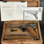 Presented in its custom Mauser wooden display case, this piece isn’t merely stored—it’s presented. The box itself is a work of craftsmanship, designed to protect and elevate, while the inclusion of the original Luger paperwork adds authenticity and historical context. Together, they complete the story of a firearm that’s as much art as engineering.