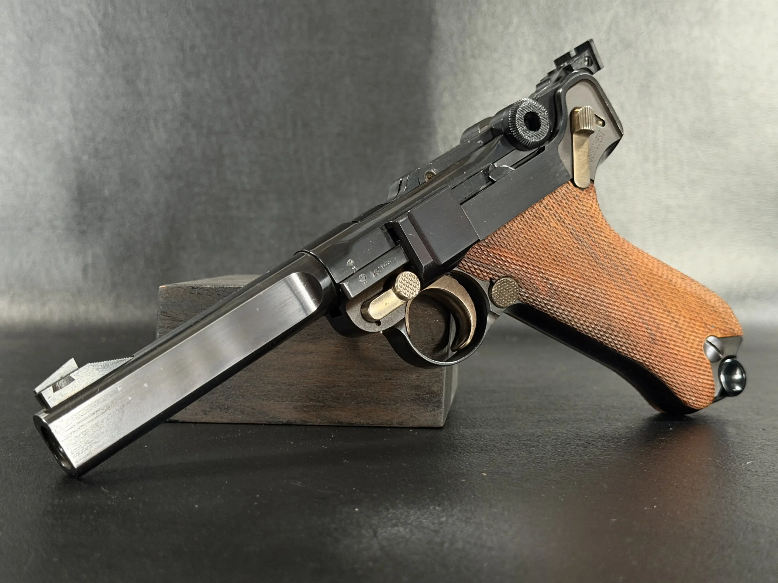 Chambered in .30 Luger, this example immediately distinguishes itself with its long, heavy profile and flat-sided bull barrel, an unmistakable hallmark of the Sport Modell configuration. The additional barrel mass shifts the pistol’s balance forward, dampening recoil and allowing for remarkably steady sight tracking. Paired with an adjustable rear target sight and elevated ramp front blade, the sight picture is clean, sharp, and highly tunable, designed for shooters who demand precision rather than speed.