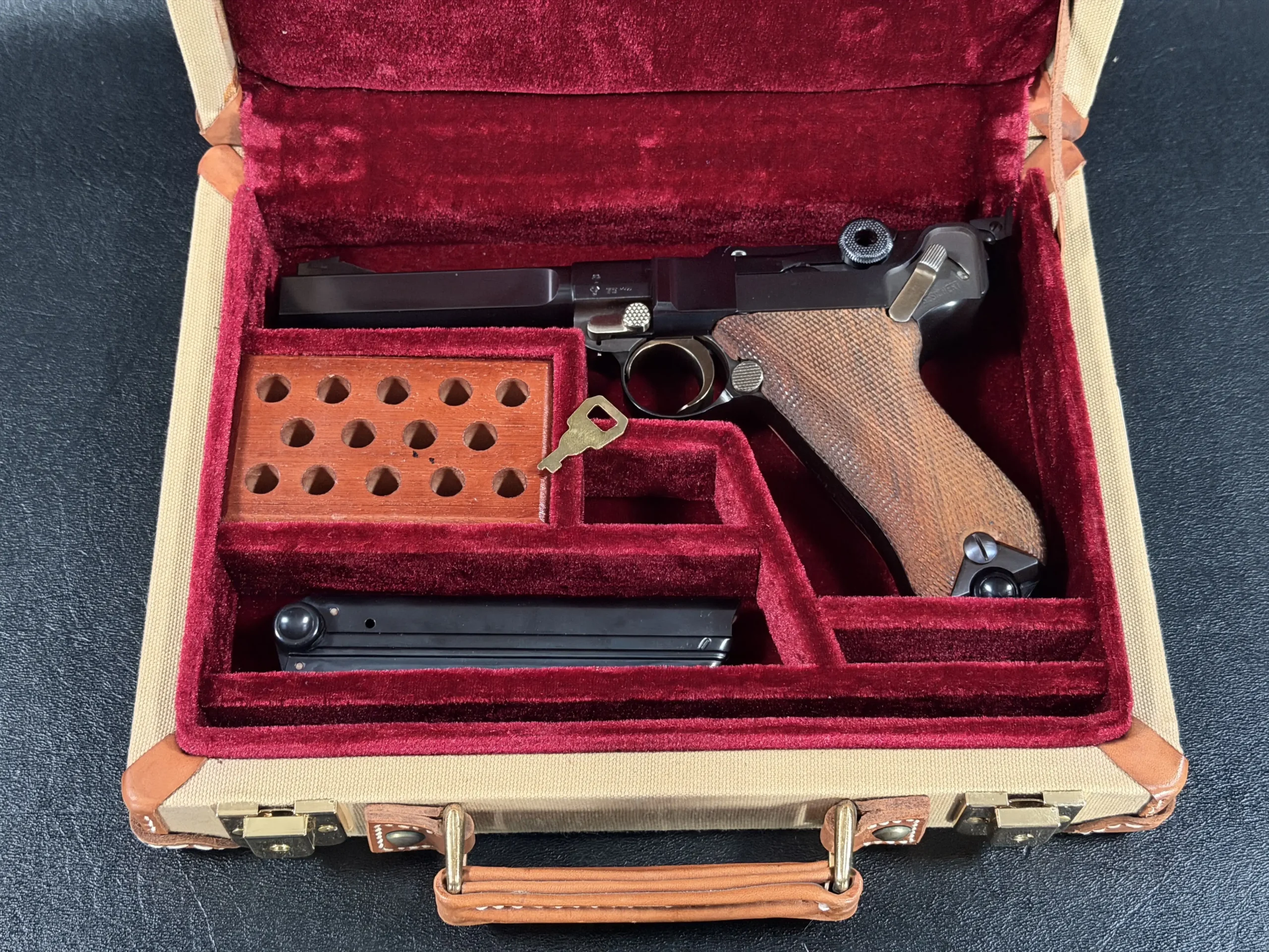 Accompanying the pistol is its factory presentation case, fitted in rich red velour and compartmentalized for accessories. The case includes a Mauser-marked loading tool, spare magazine storage, and correctly configured interior blocks, details that elevate the ensemble from a standalone firearm to a complete collector’s display set. The exterior canvas and leather trim maintain the understated elegance typical of period sporting cased Lugers.