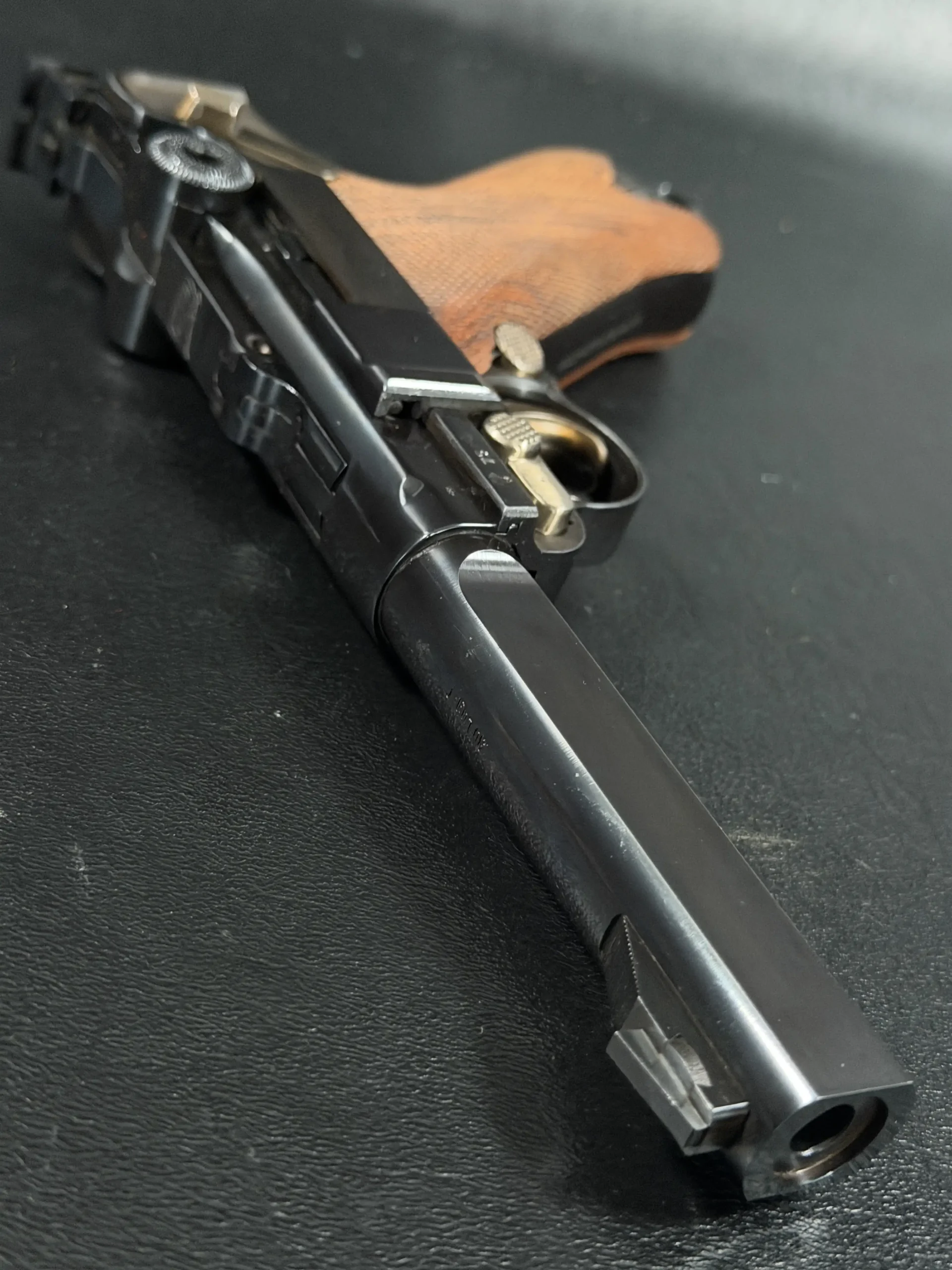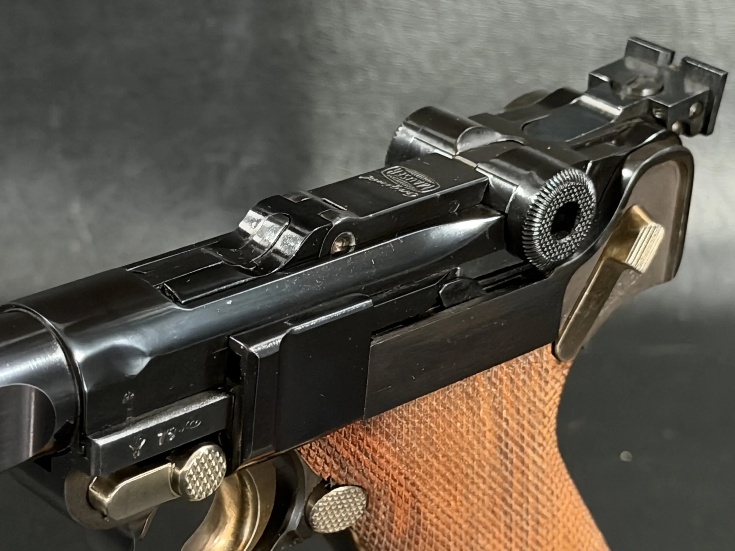 The checkered walnut grips are equally noteworthy, offering both warmth and tactile control. Their target-style contour fills the hand naturally, complementing the pistol’s forward-weighted geometry. In combination, grip angle, barrel mass, and sight radius create a shooting experience that feels deliberate and composed, exactly what Mauser intended for competitive and recreational precision work.