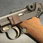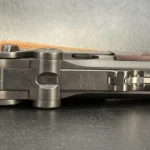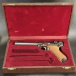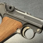 Unlike typical Mauser Parabellum models from the same period, this version does not include grip safety, setting it apart and highlighting its specialized design for sporting purposes. The pistol is complemented by elegant wooden grip plates that enhance its aesthetic appeal while providing a comfortable and secure hold.