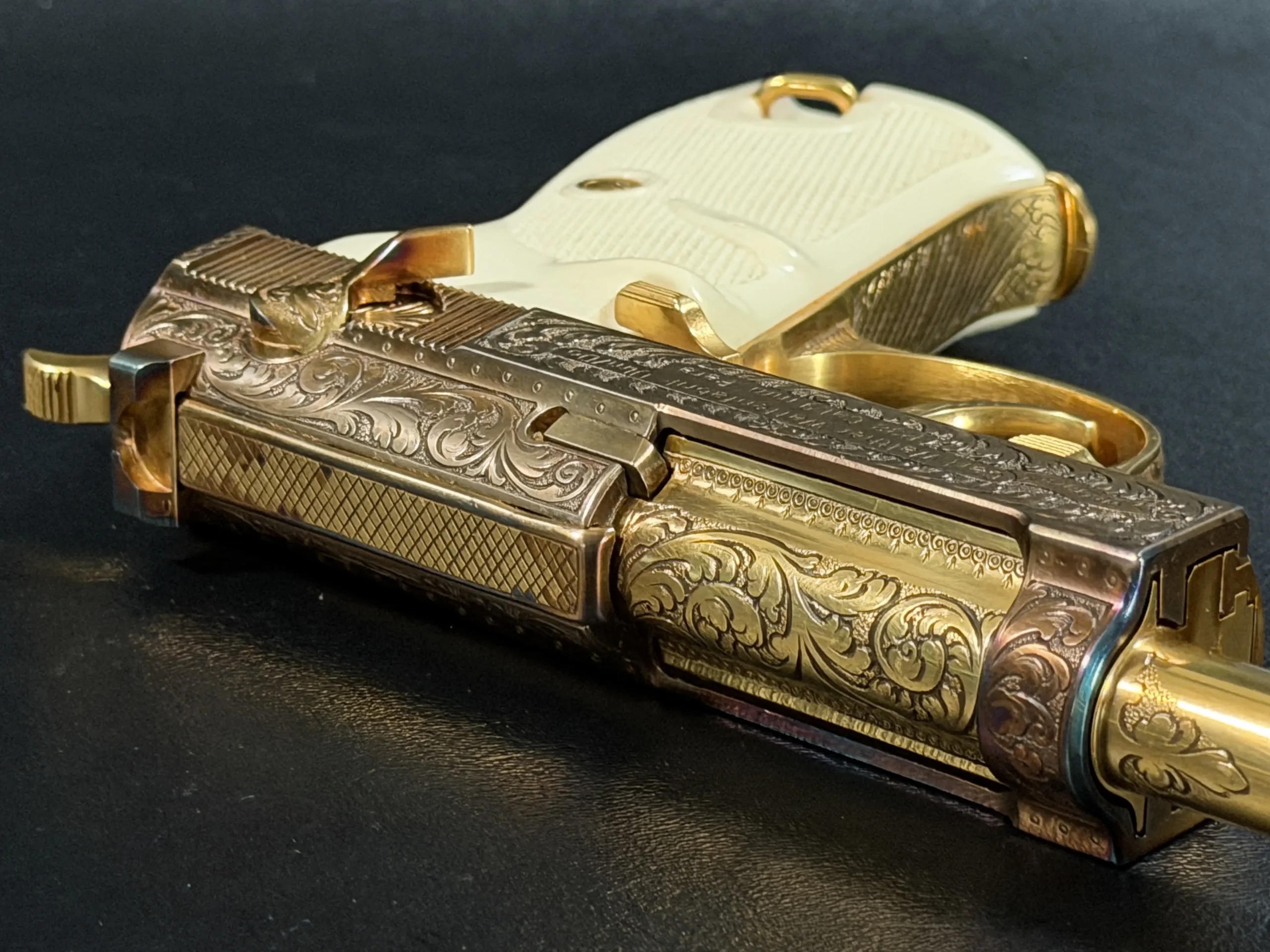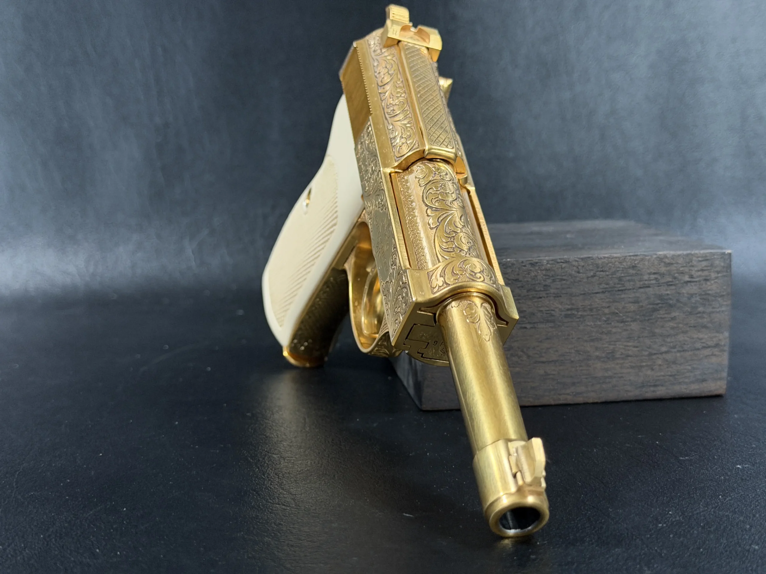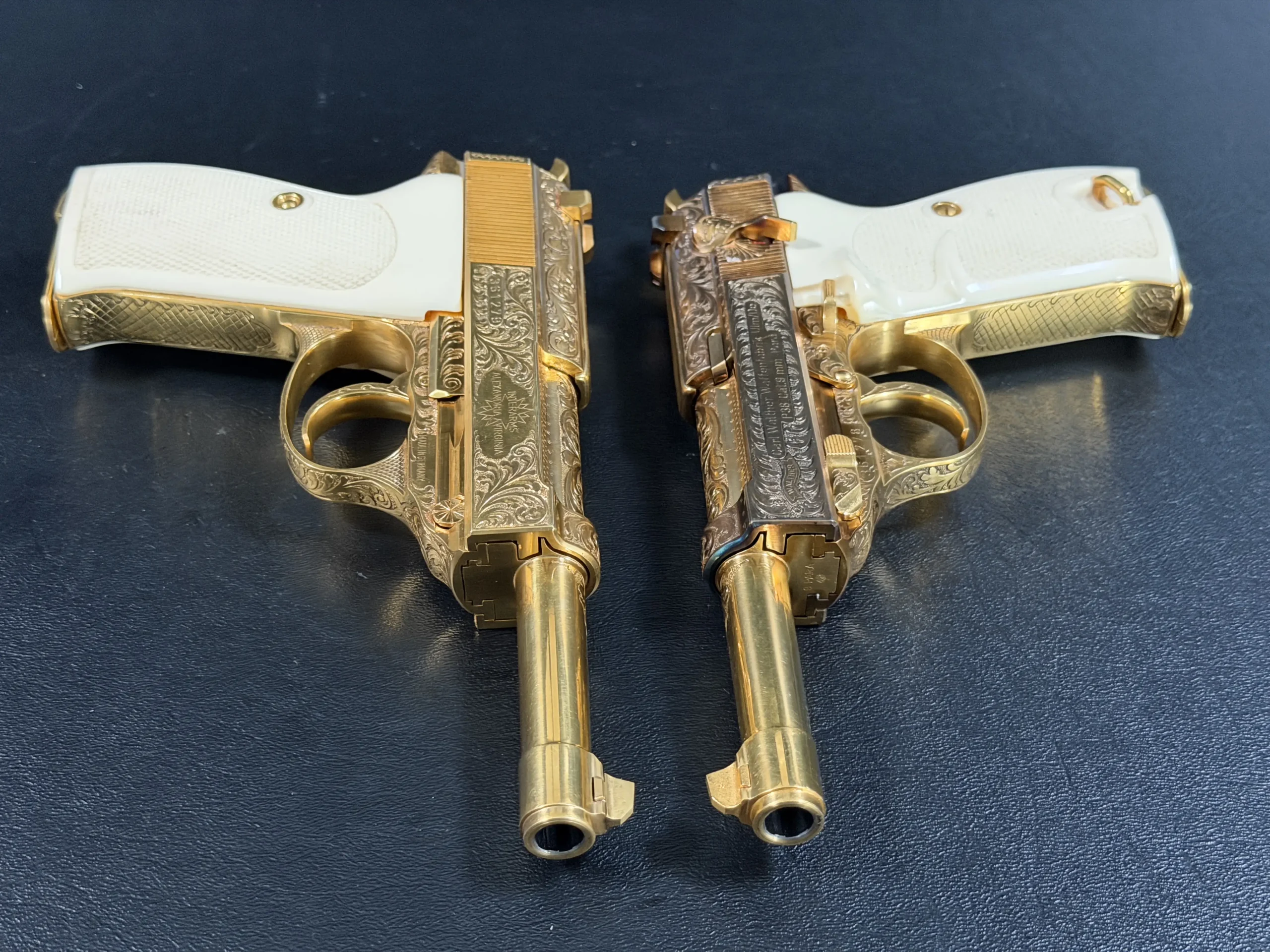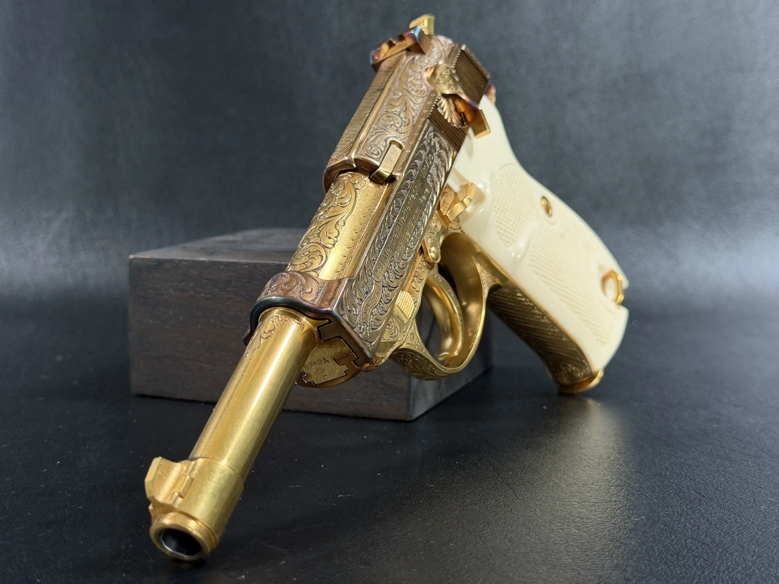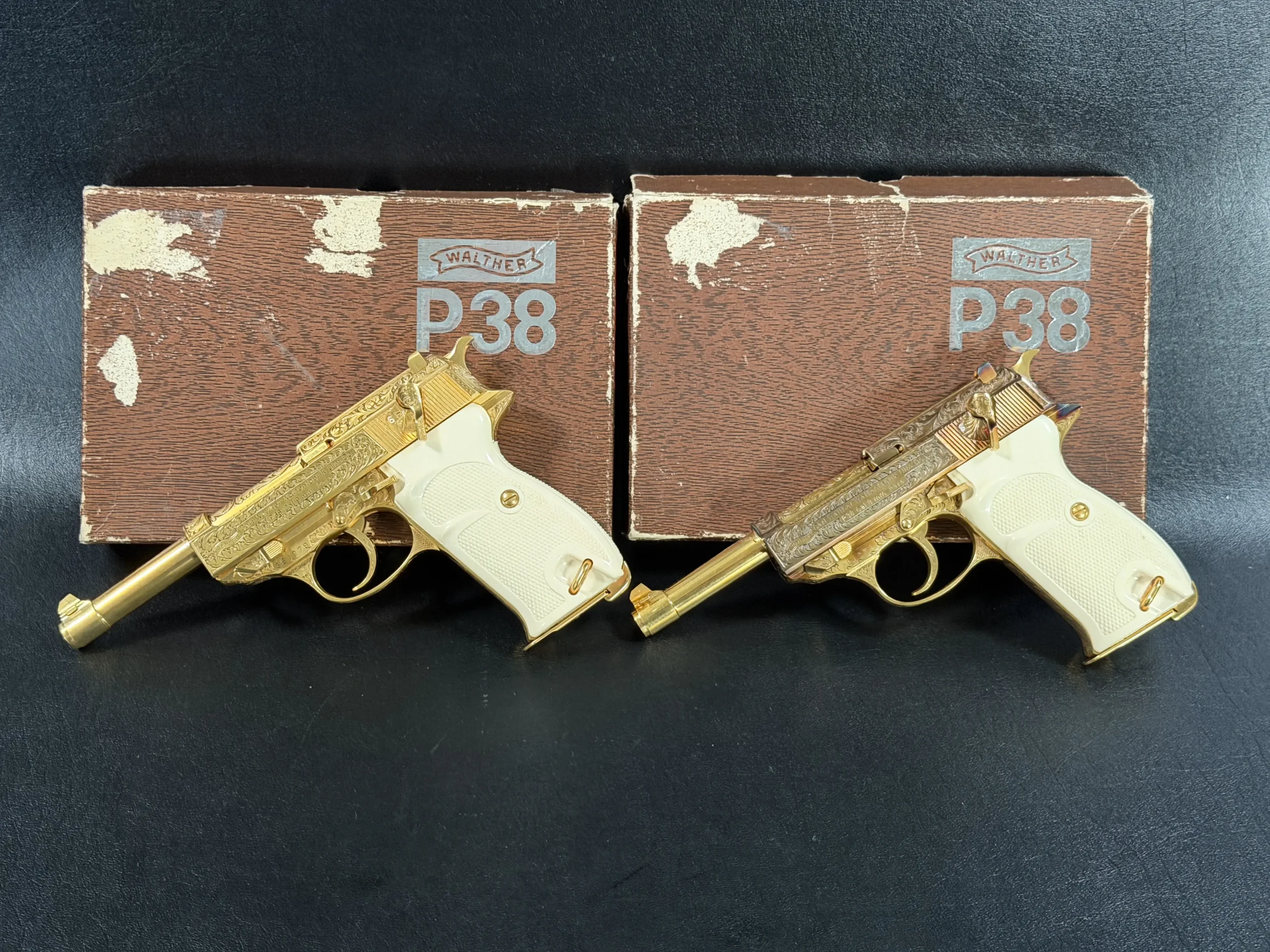 This extraordinary pair of Gold-Engraved Walther P38 pistols represents one of the most visually striking and historically compelling presentation-grade offerings ever produced for the P38 platform. Crafted in 9mm and finished with a fully gilded, hand-engraved aesthetic, the two pistols form a perfectly matched, consecutive set. This exceedingly rare configuration elevates them far beyond individual collectibles.