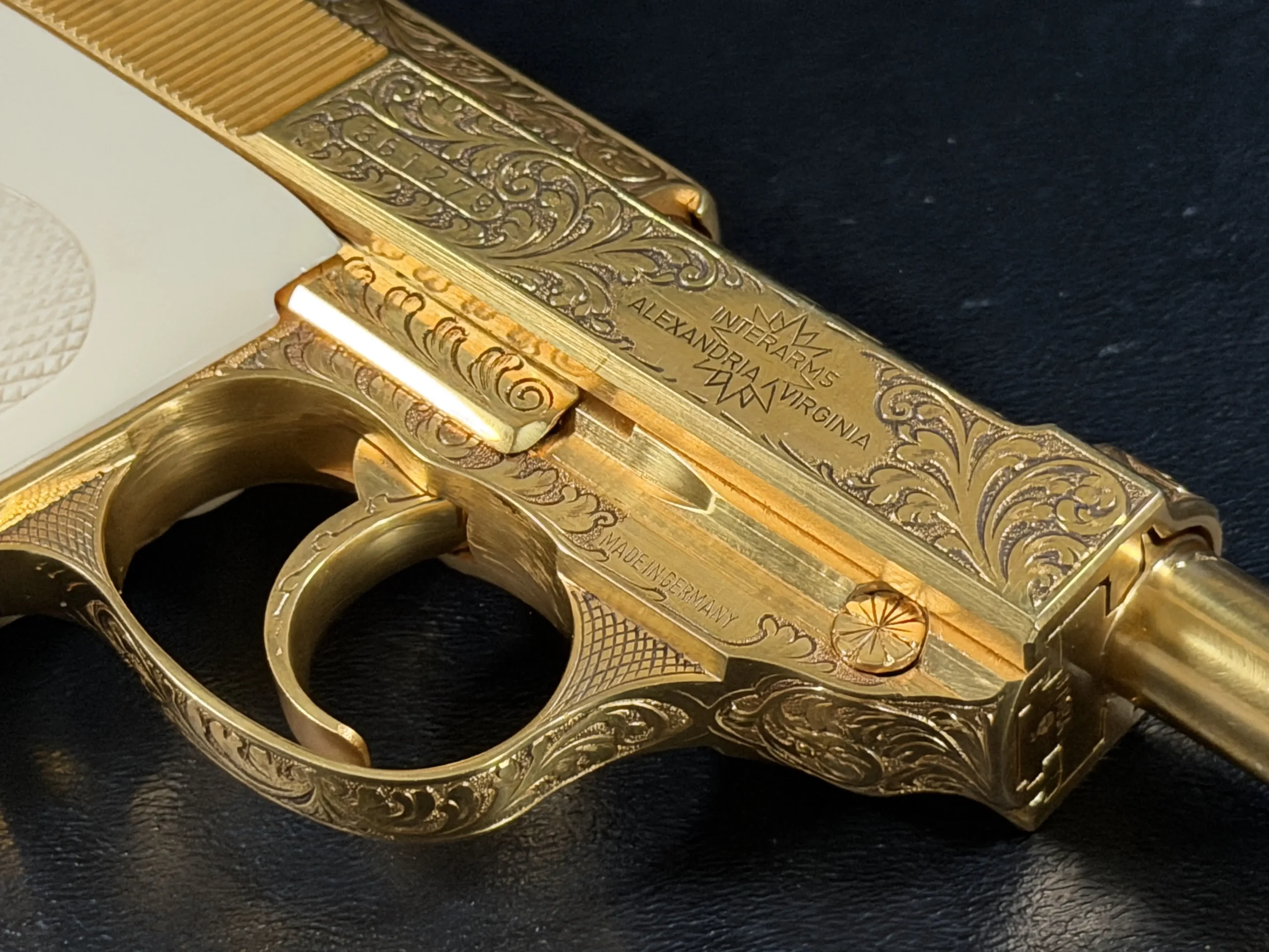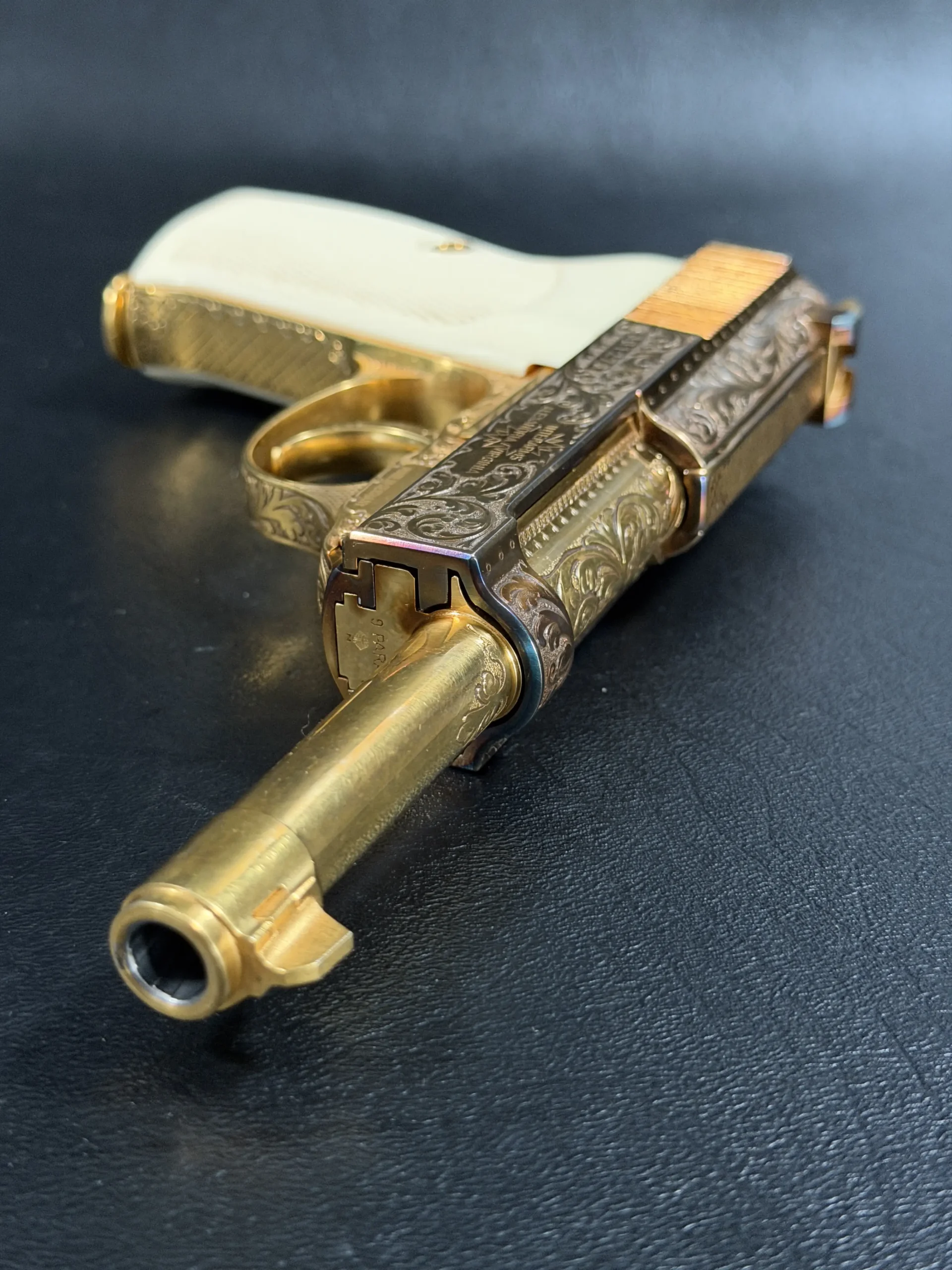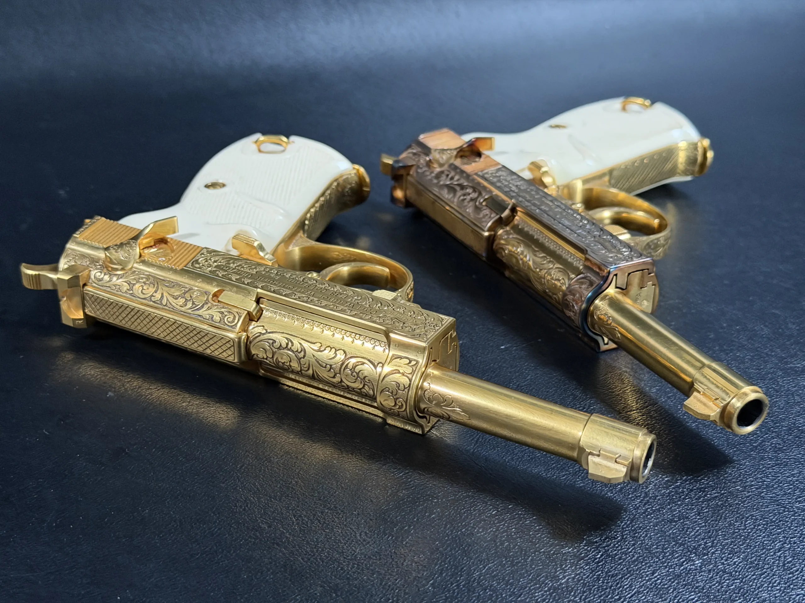 Viewed side by side, they reveal subtle differences in engraving tone and patina, one warmer, one slightly darker, giving the set a duality that feels intentional, almost artistic. Together, they showcase the full range of Walther’s post-war decorative craftsmanship: mirror-bright gold, ornate German scroll, fire-blued accents, and clean mechanical geometry beneath all the artistry.