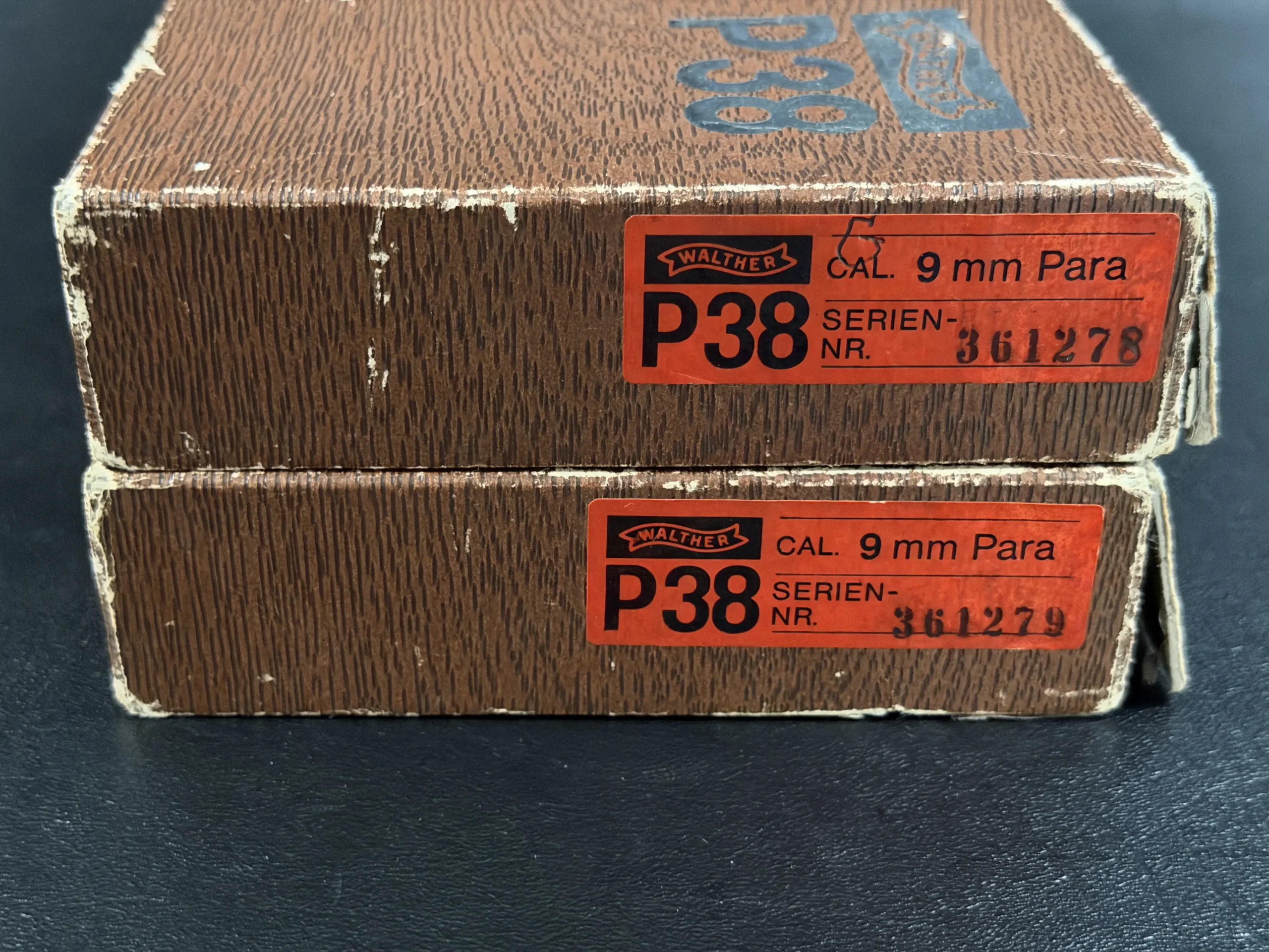 What makes this set truly special is not simply the engraving, nor the gold, nor the preservation of each pistol in its original Walther P38 factory-labeled box, though all of that matters. It’s the fact that they remain together, a matched pair from the day they left Ulm. Consecutive examples in any engraved Walther presentation series are difficult to find; a surviving pair of this caliber, in this condition, is exceptional.