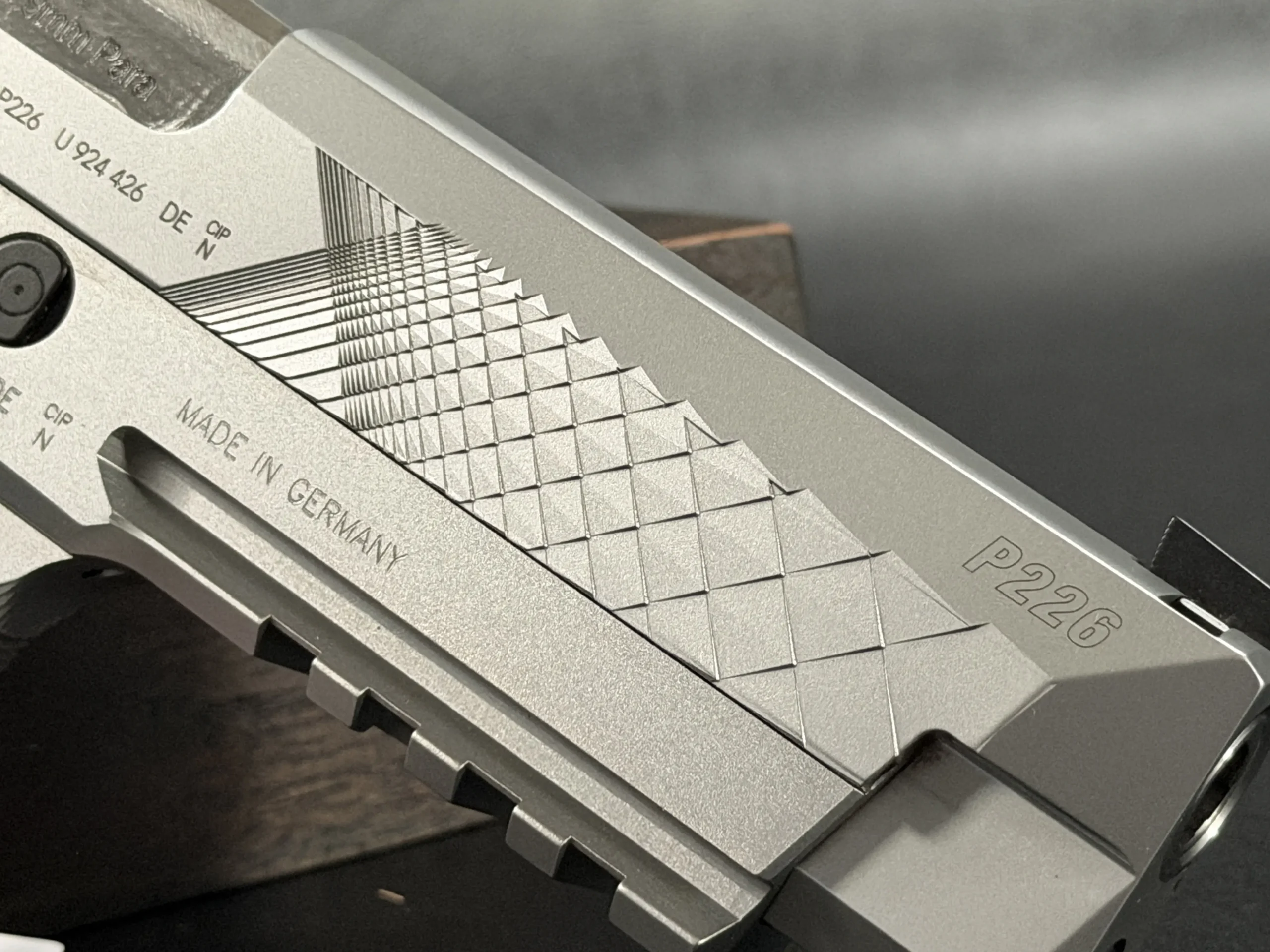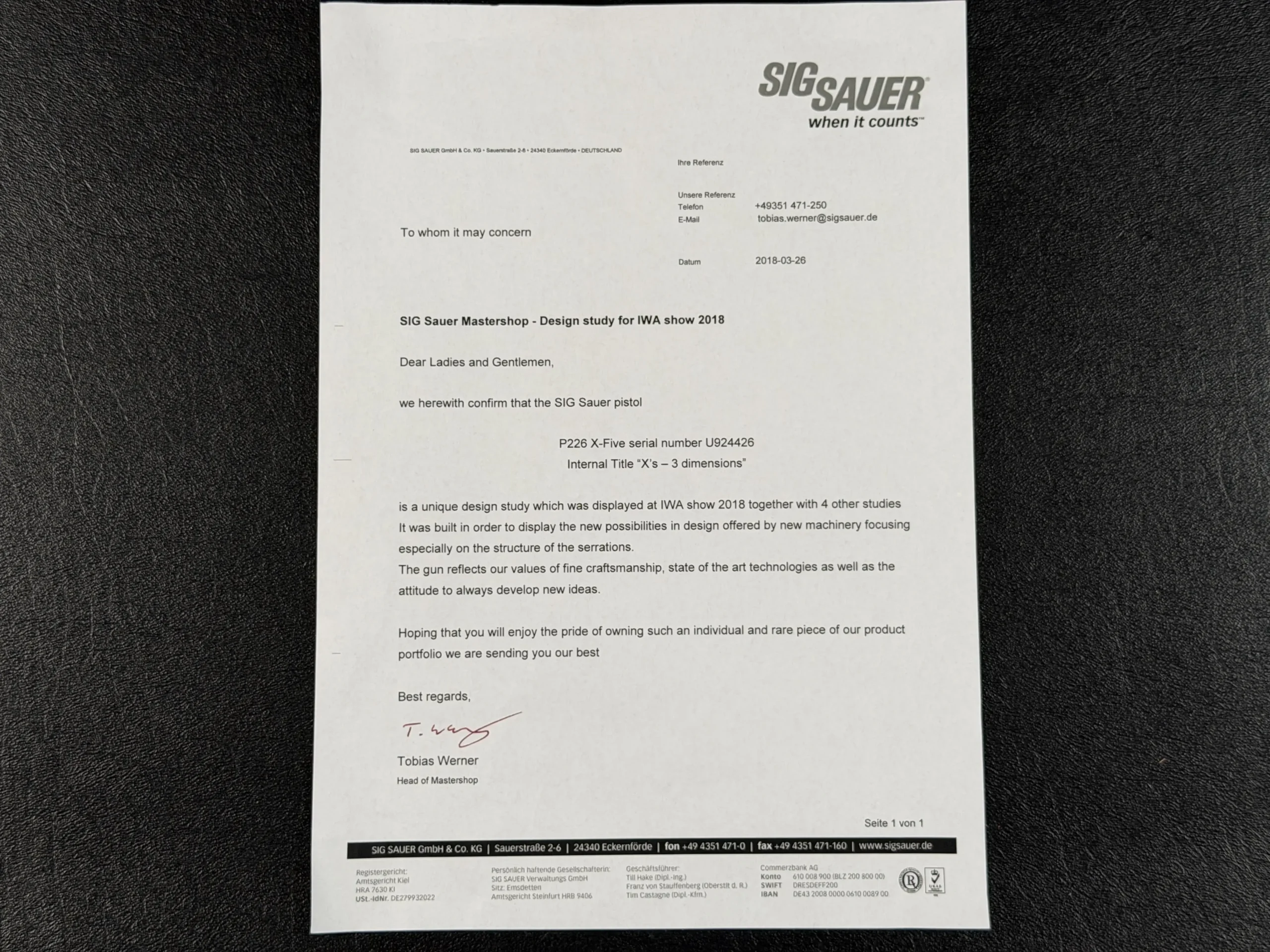 According to the accompanying SIG Sauer Mastershop letter, this pistol was developed as an internal project and displayed at the IWA Show 2018, presented alongside only a handful of other experimental studies. Its purpose was clear: to demonstrate new manufacturing capabilities, with particular emphasis on the structure, geometry, and visual depth of the slide serrations.
