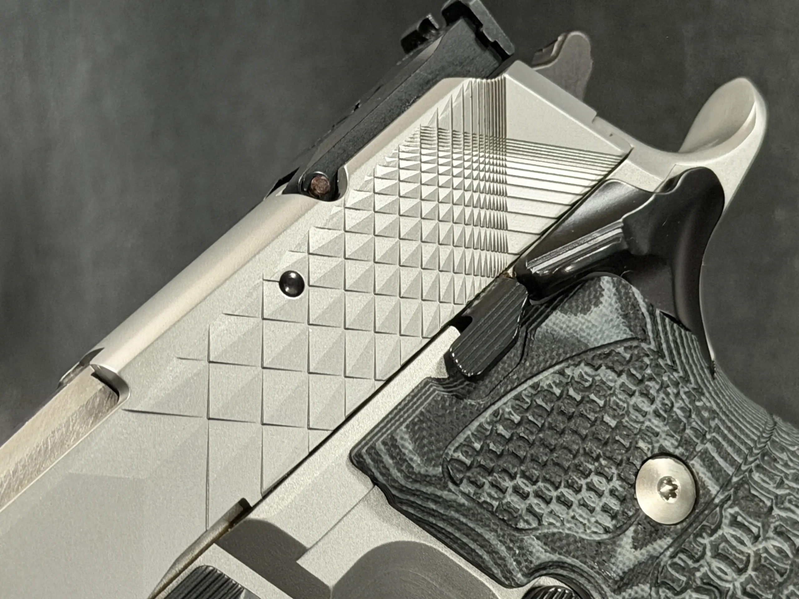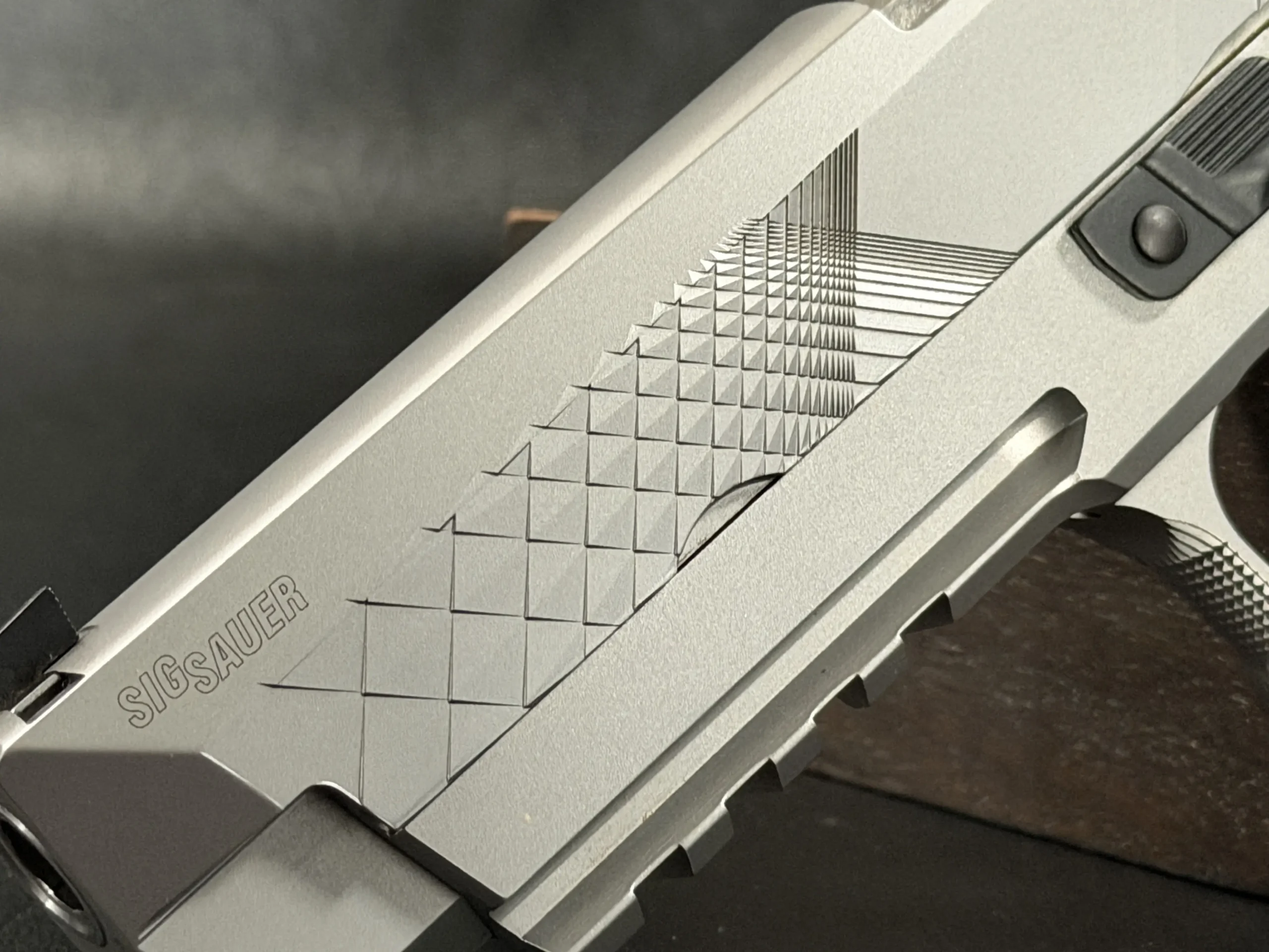 The result is striking. The slide features an intricate, multi-layered geometric pattern that shifts with light and angle, creating a true sense of dimensionality rather than surface decoration. This treatment is not cosmetic; it reflects a deliberate exploration of how form, texture, and machining precision can coexist on a functional firearm.
