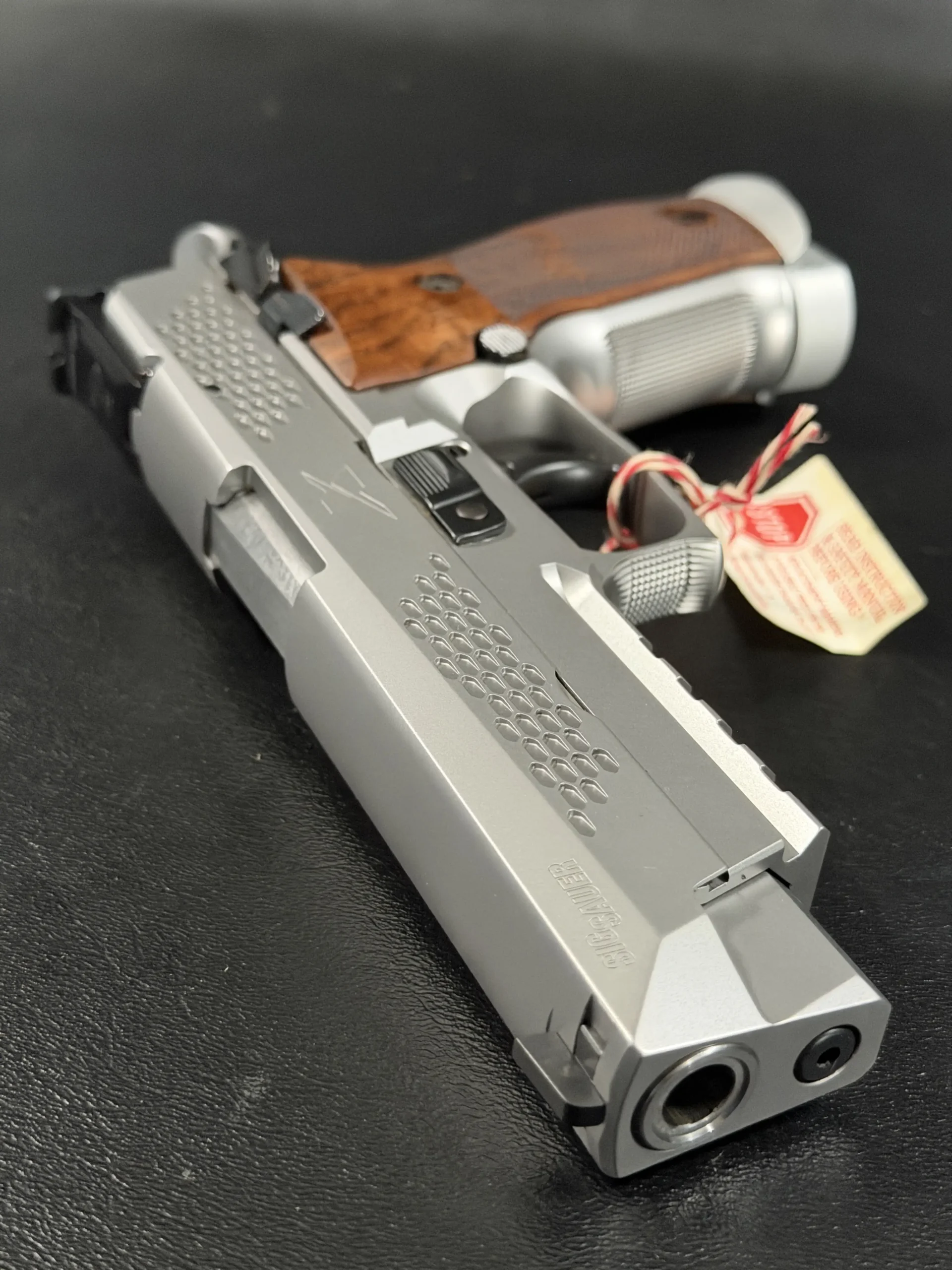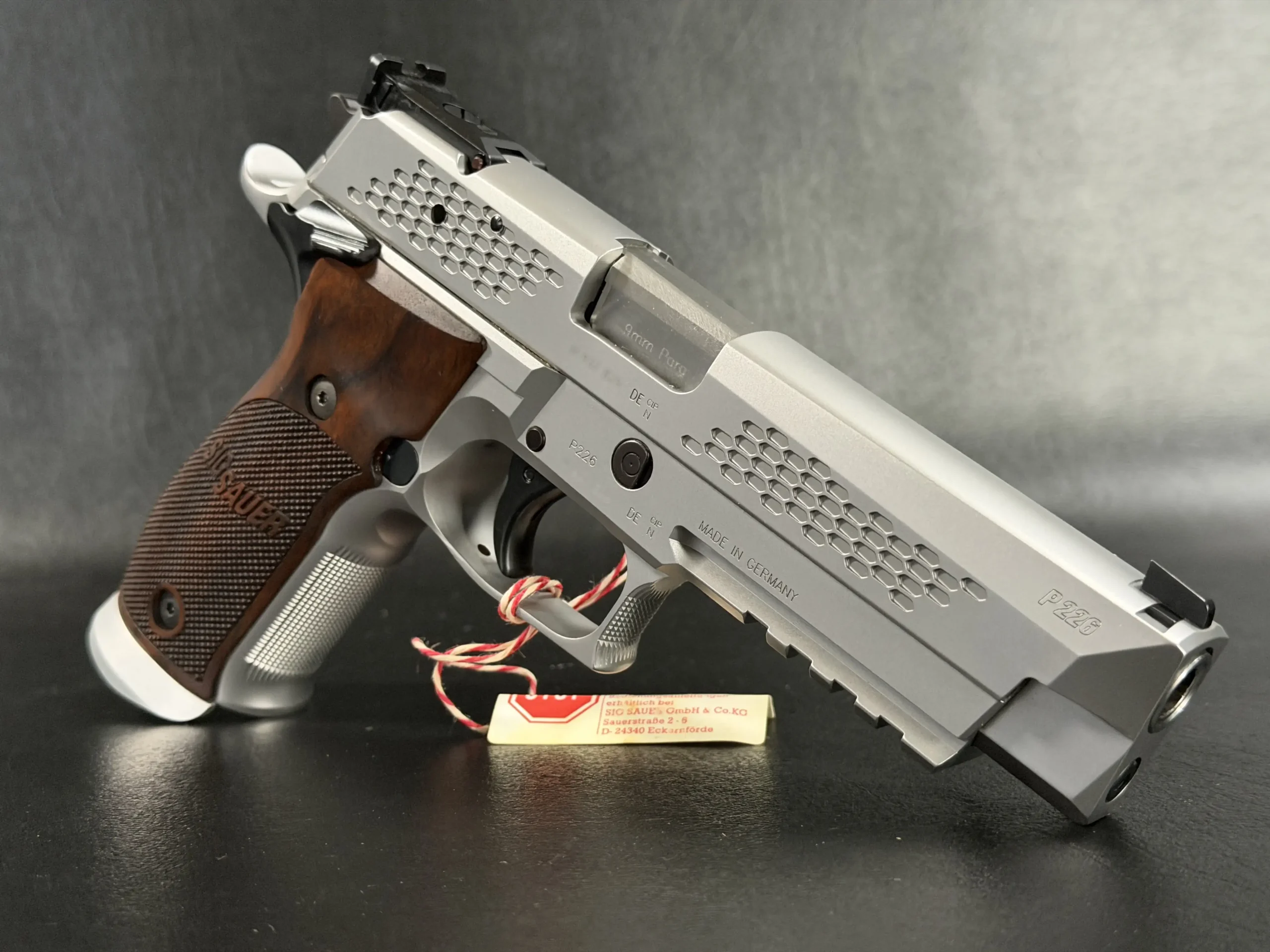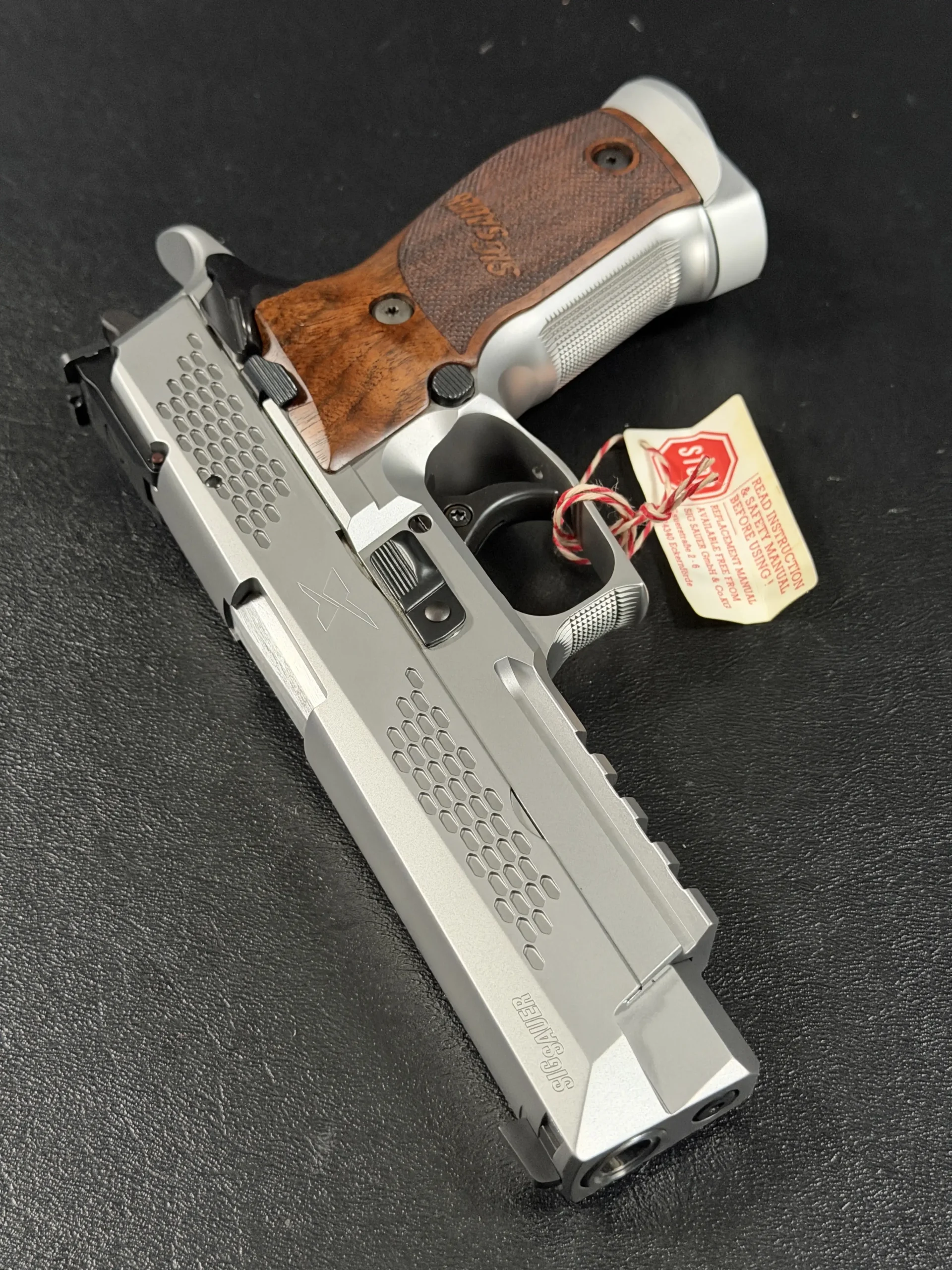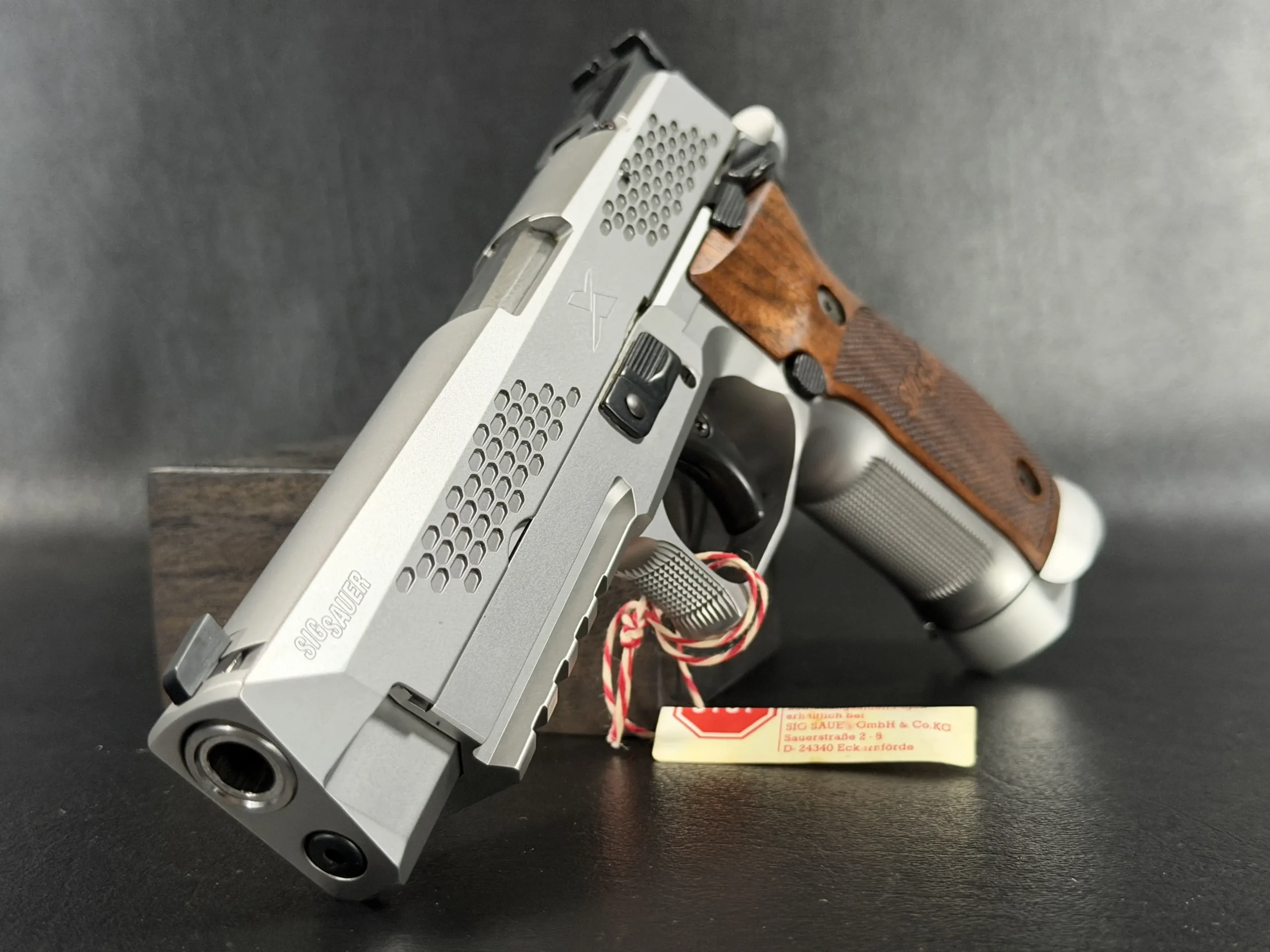 What immediately sets this piece apart is the striking honeycomb slide geometry, a carefully engineered pattern that transforms the slide into both a visual statement and a technical showcase. The pattern is not decorative; it demonstrates structural possibilities, light interplay, and surface rhythm that reflect SIG Sauer’s forward-thinking design philosophy. Finished in a refined silver tone, the slide contrasts beautifully with the sculpted frame and richly grained wooden grips, creating a balance between modern industrial design and classic craftsmanship.