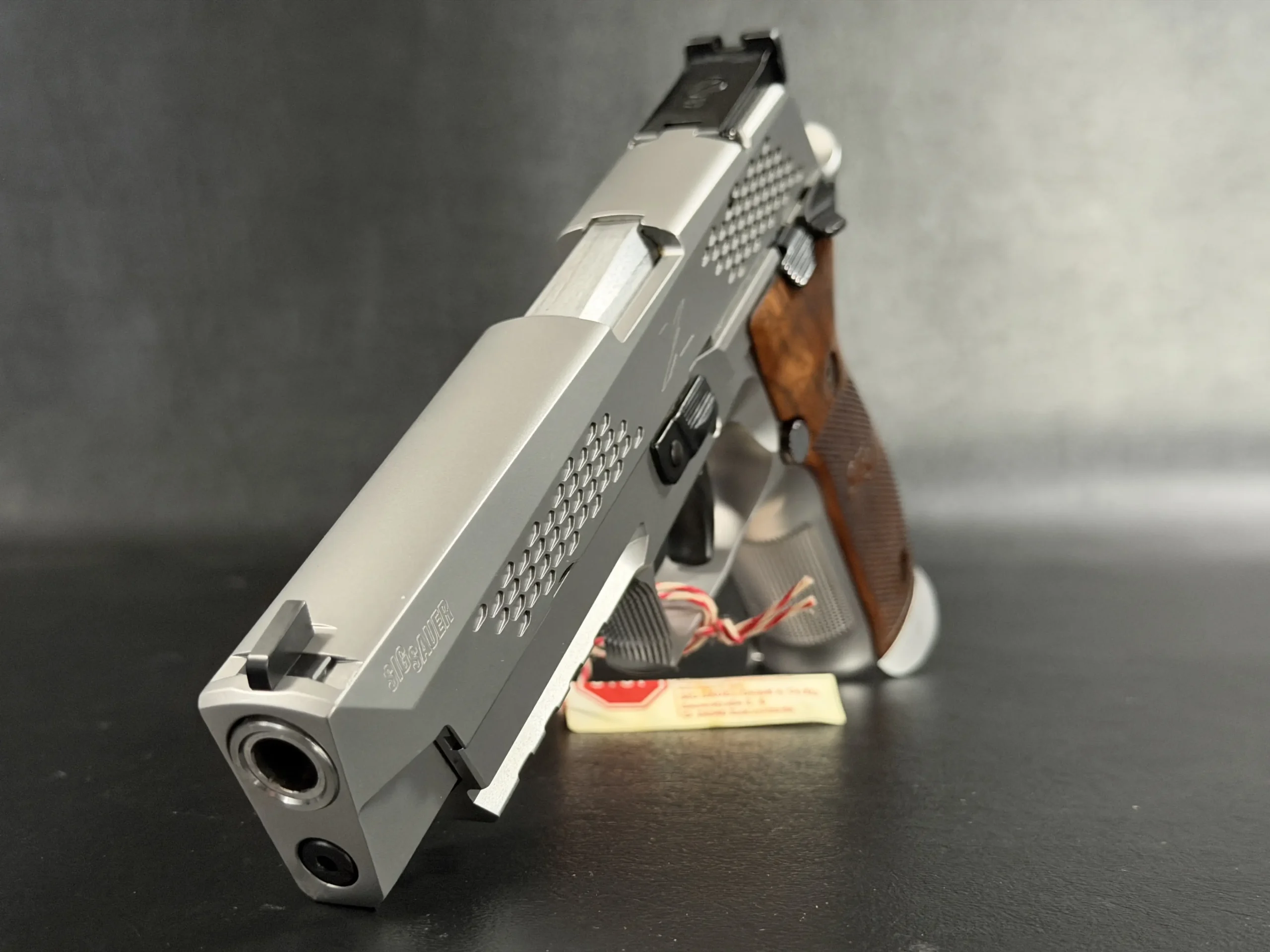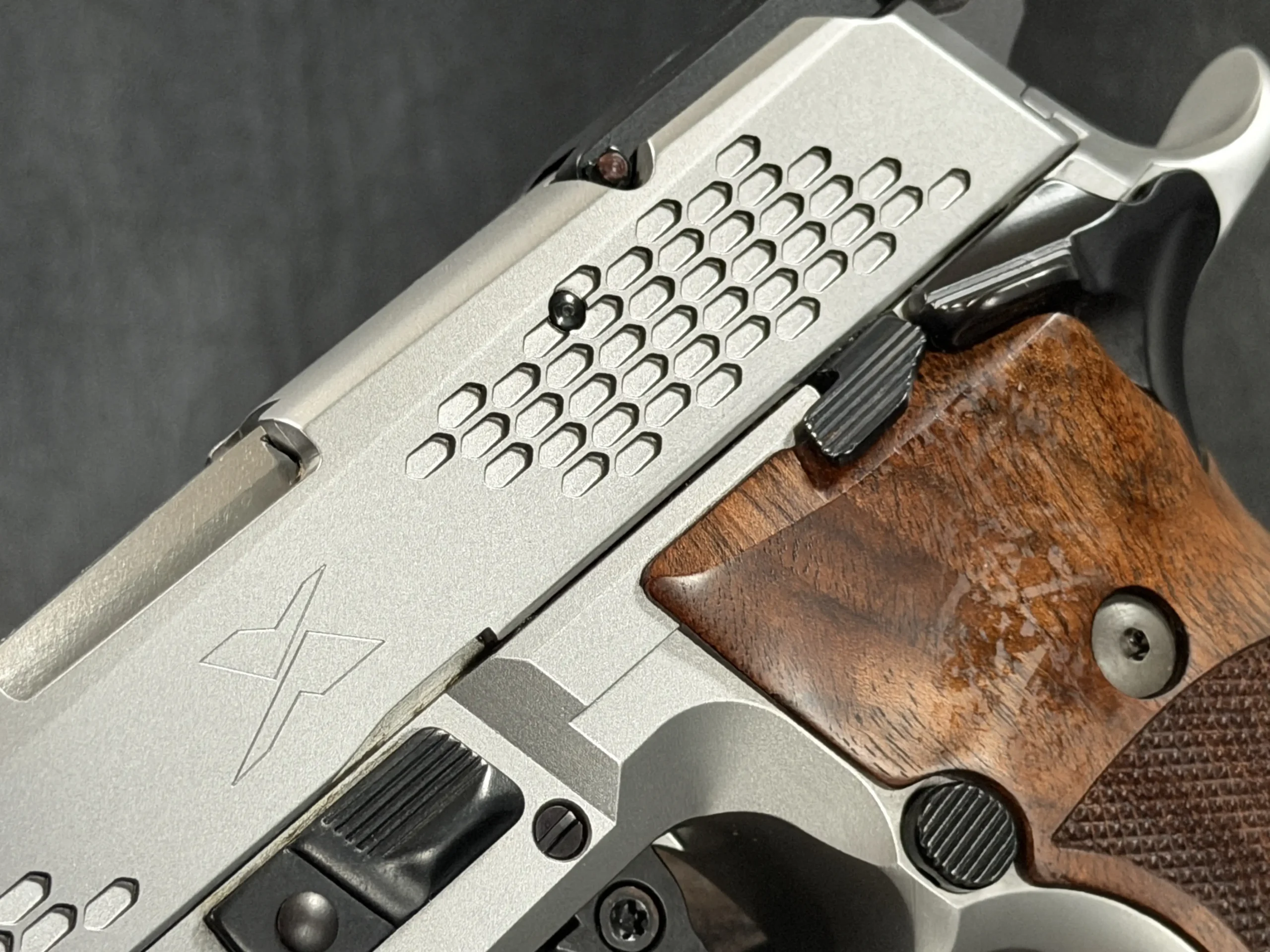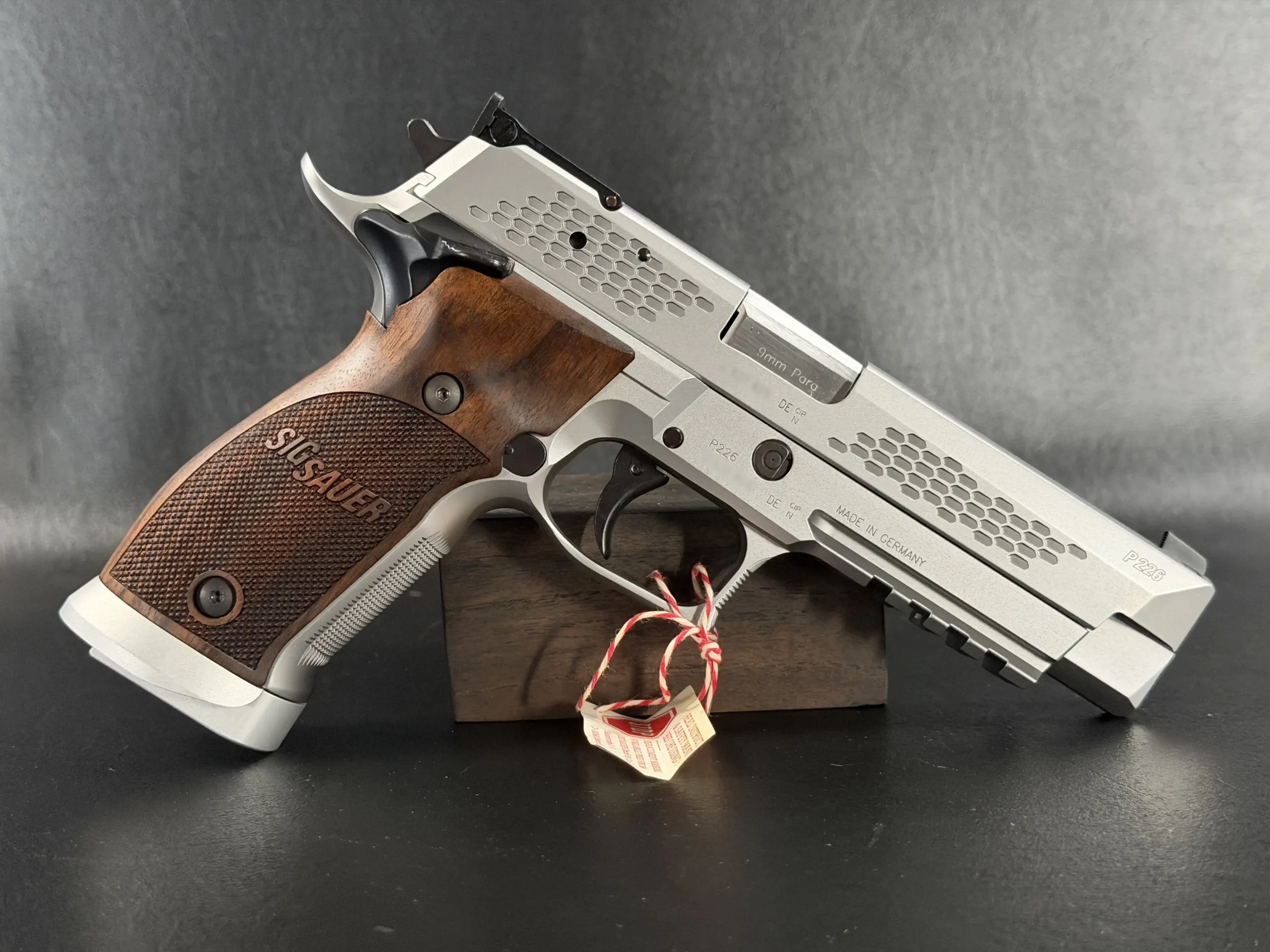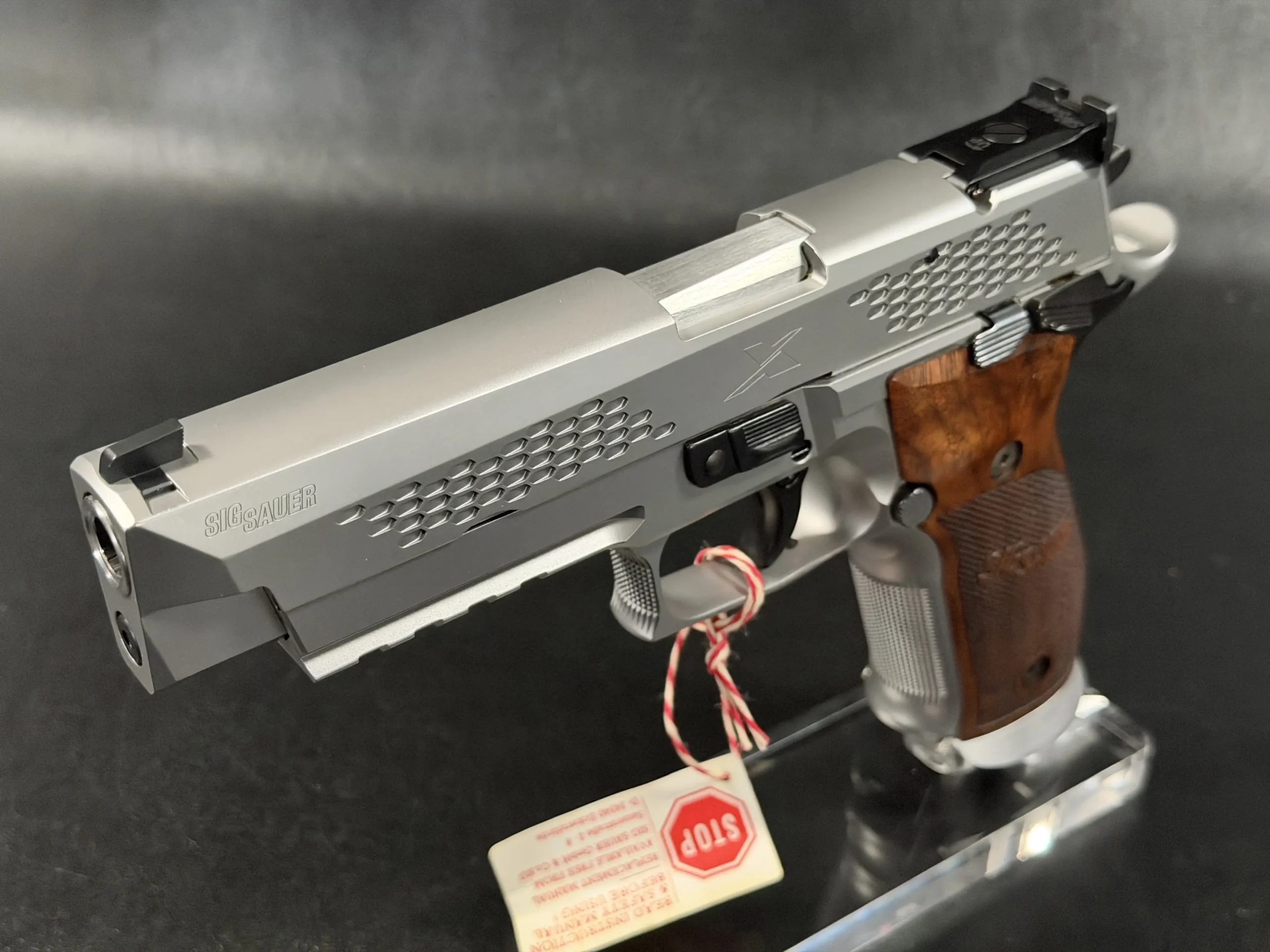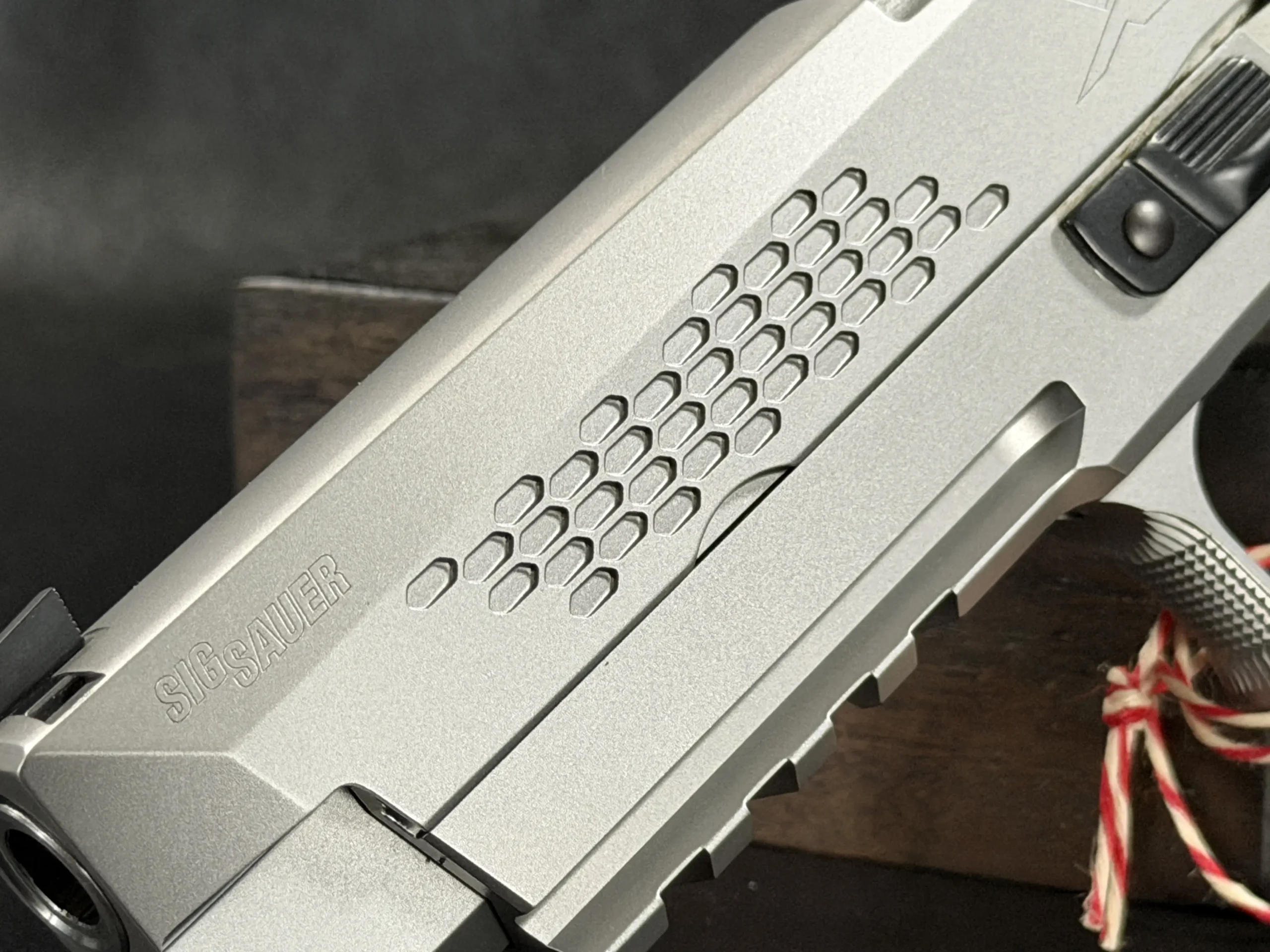 What immediately sets this piece apart is the striking honeycomb slide geometry, a carefully engineered pattern that transforms the slide into both a visual statement and a technical showcase. The pattern is not decorative; it demonstrates structural possibilities, light interplay, and surface rhythm that reflect SIG Sauer’s forward-thinking design philosophy. Finished in a refined silver tone, the slide contrasts beautifully with the sculpted frame and richly grained wooden grips, creating a balance between modern industrial design and classic craftsmanship.