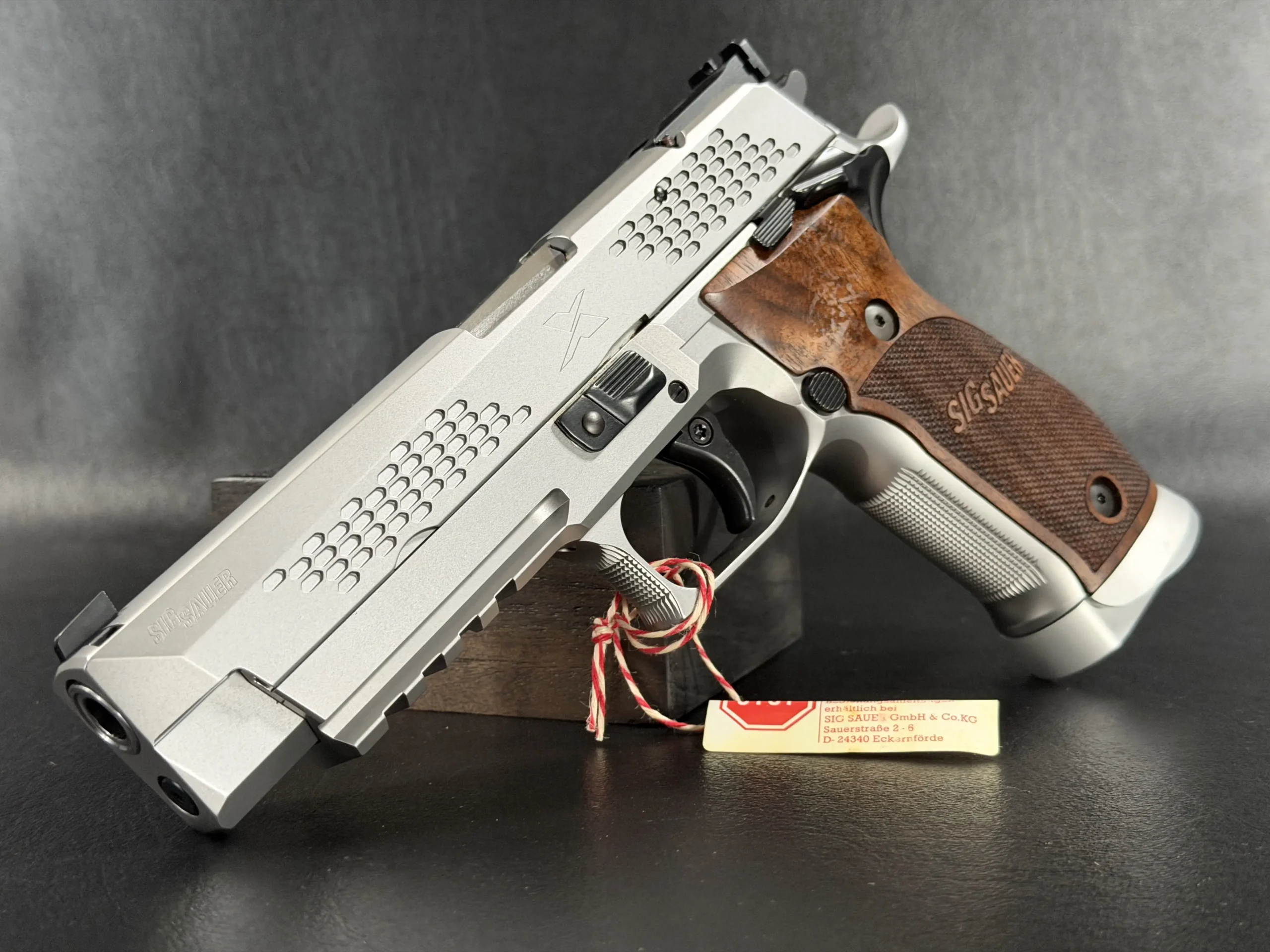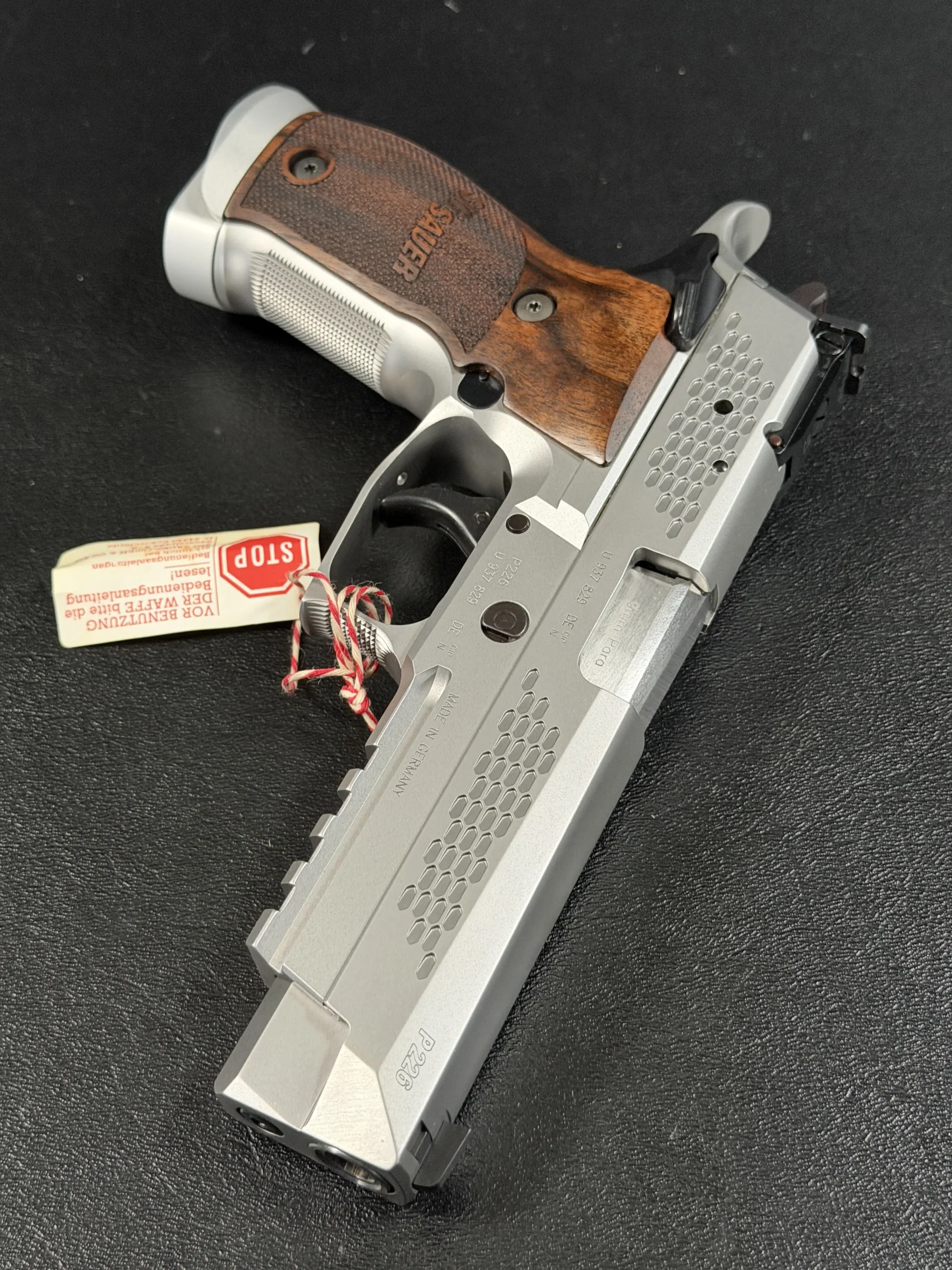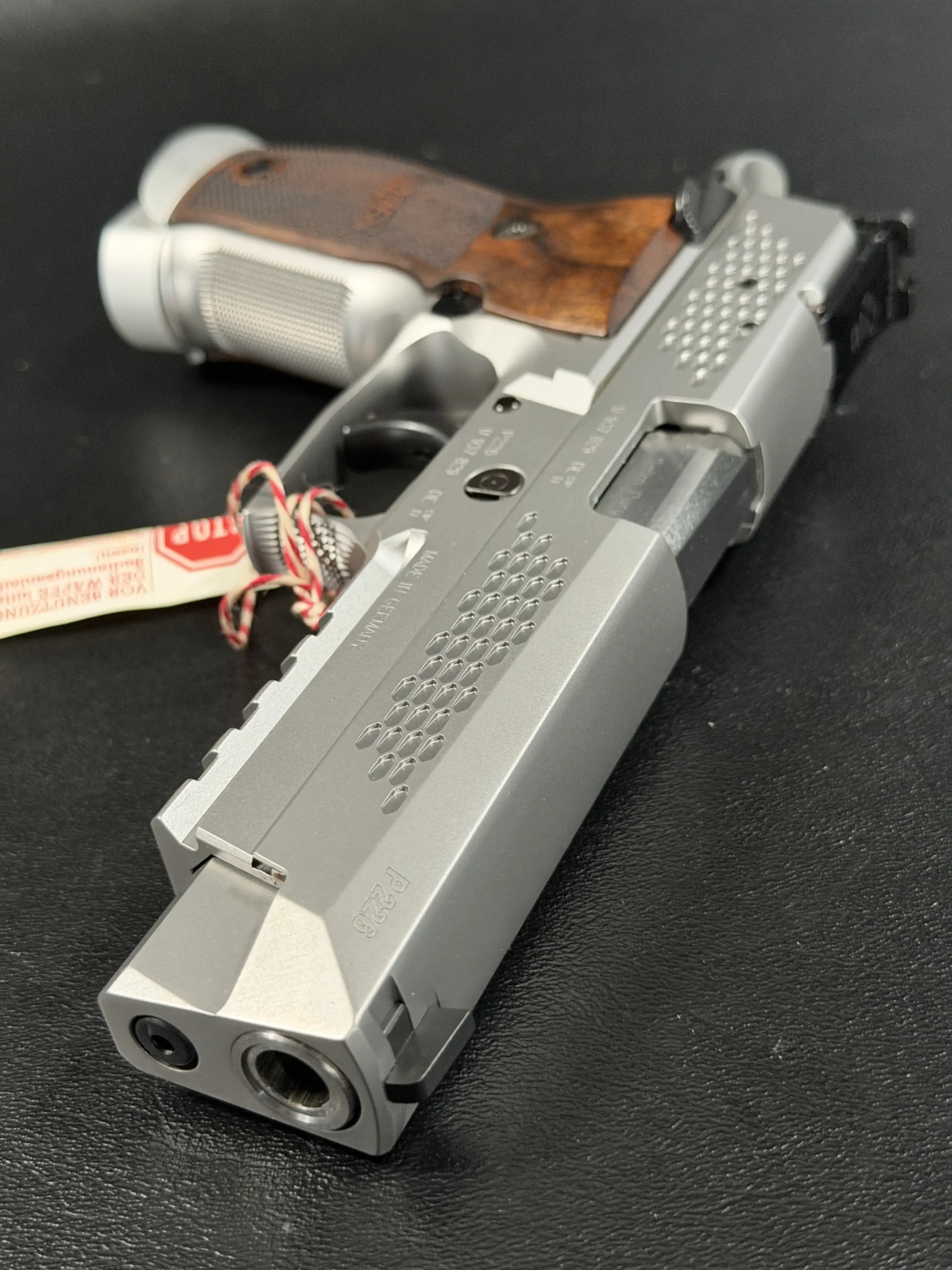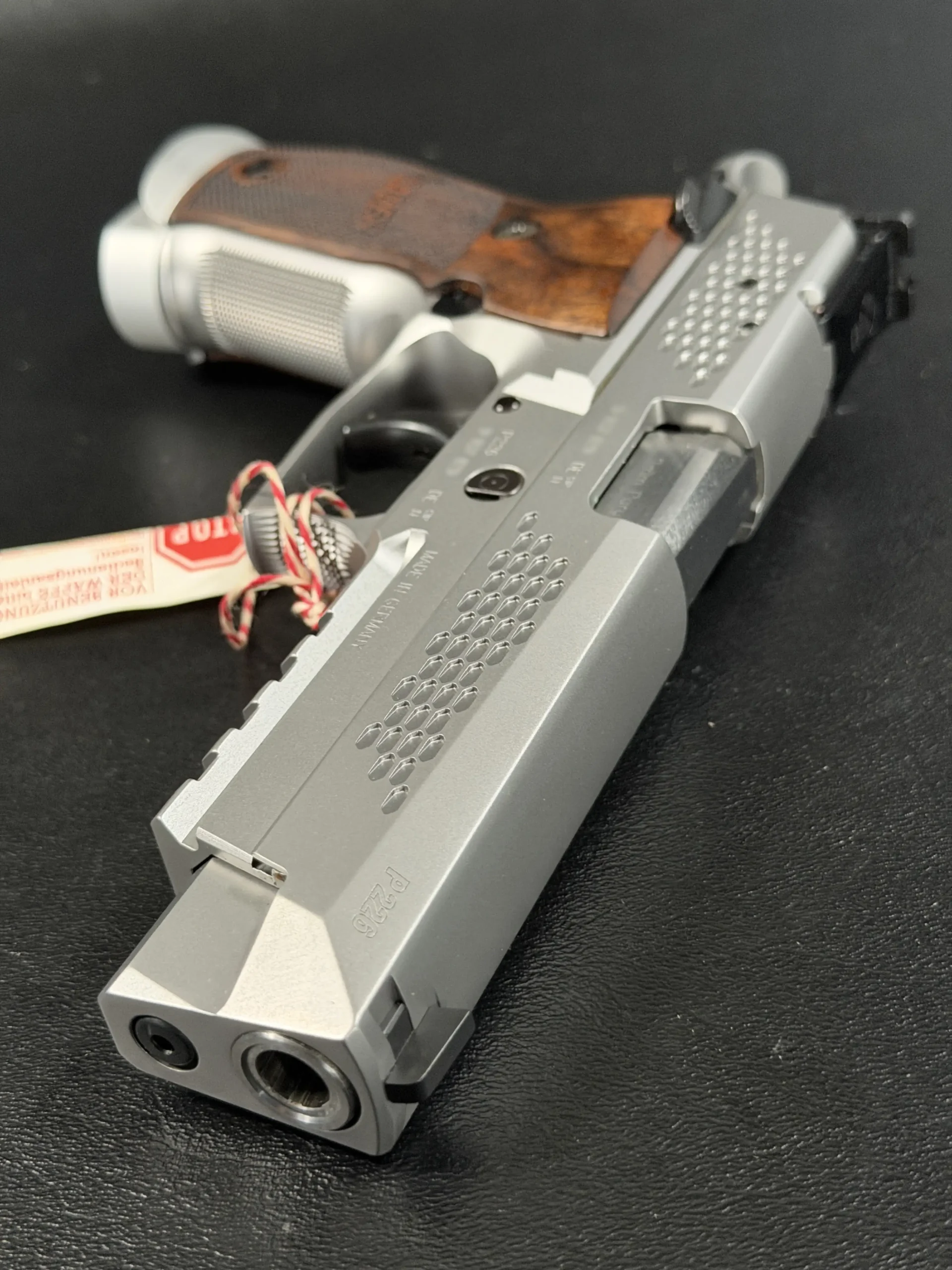 What immediately sets this piece apart is the striking honeycomb slide geometry, a carefully engineered pattern that transforms the slide into both a visual statement and a technical showcase. The pattern is not decorative; it demonstrates structural possibilities, light interplay, and surface rhythm that reflect SIG Sauer’s forward-thinking design philosophy. Finished in a refined silver tone, the slide contrasts beautifully with the sculpted frame and richly grained wooden grips, creating a balance between modern industrial design and classic craftsmanship.