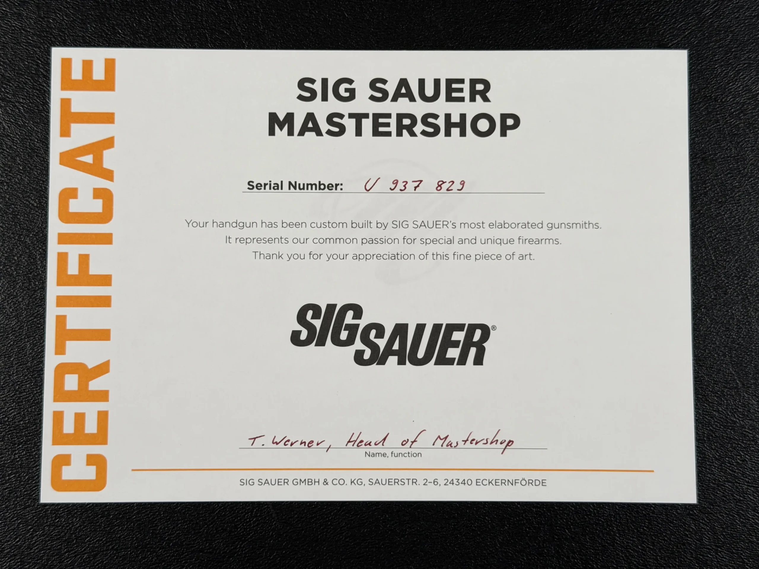 The included documentation confirms this pistol as a unique design study, produced to explore new ideas in slide structure and manufacturing techniques, an object meant to inspire future possibilities rather than follow existing templates. All serialized components are factory-matched, reinforcing its integrity as a cohesive, original Mastershop creation.