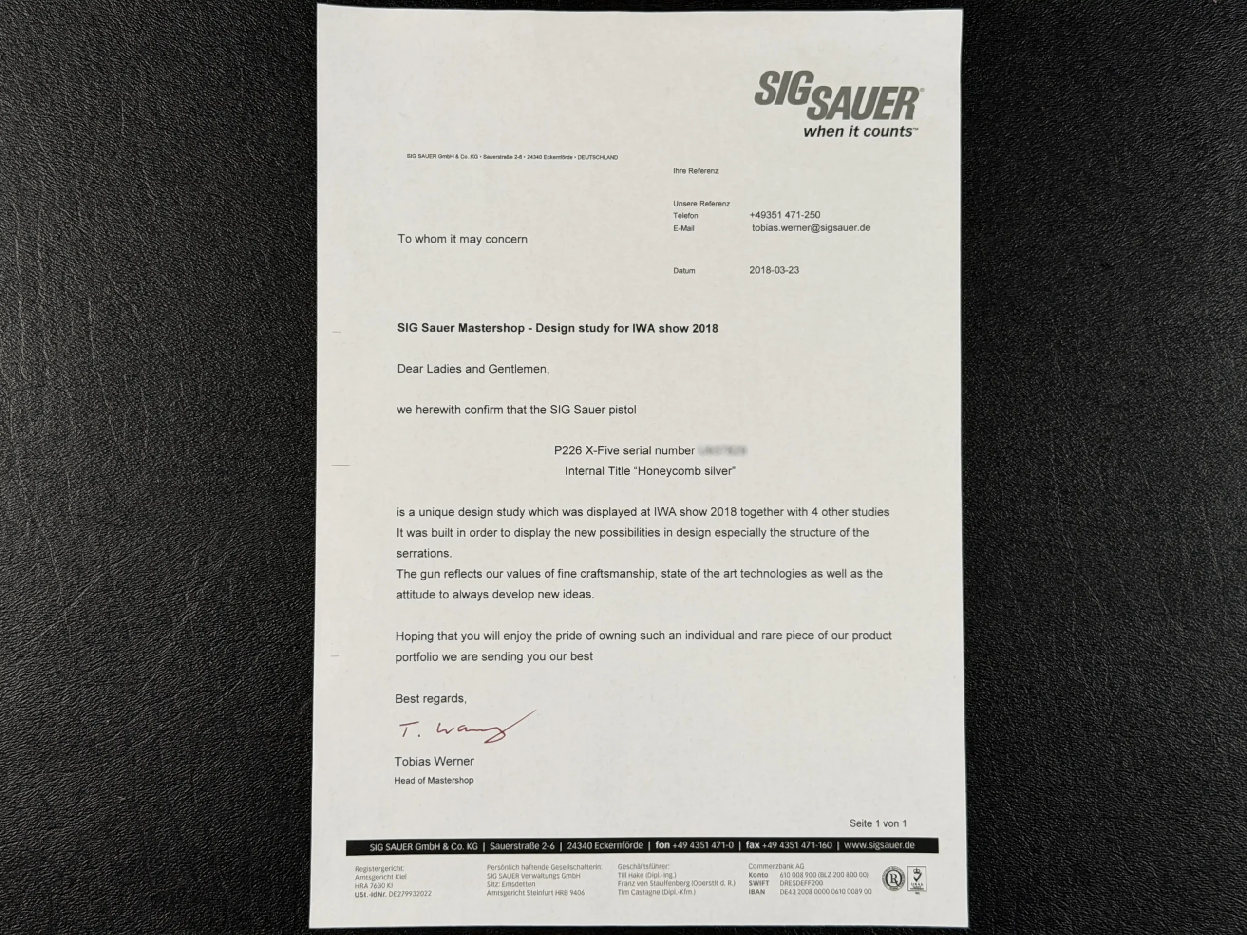 The Prototype SIG P226 X-Five Honeycomb is a true Mastershop design study, a singular exploration of form, structure, and modern machining executed at the highest level of German precision. According to the accompanying factory letter from SIG Sauer Mastershop, this pistol was created specifically as a design study for the IWA Show 2018, displayed alongside only a small handful of other experimental Mastershop concepts.