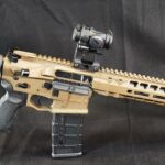 The Radian Model R1, chambered in 5.56 NATO and featuring a 14.5-inch barrel with a pinned muzzle device to comply with ATF regulations, offers a compact yet powerful platform. Enhancing its capabilities is the Aimpoint T2 red dot sight mounted on a Unity Tactical FAST Mount, ensuring an optimal optical line of sight for swift and precise target acquisition. For tactical illumination, the SureFire M340 Turbo light, equipped with a Unity Tactical Mod Button, provides reliable and instant activation for low-light scenarios.