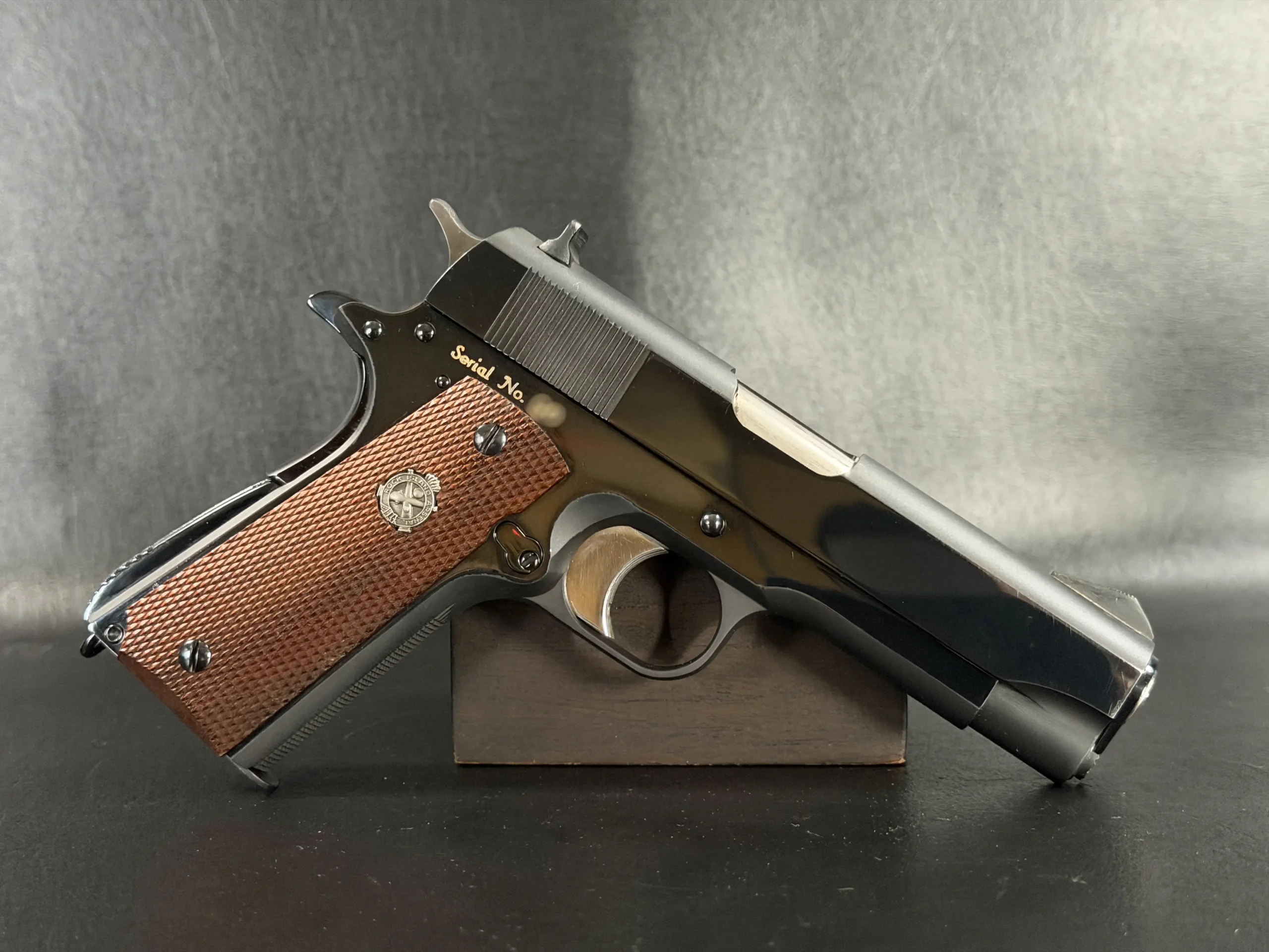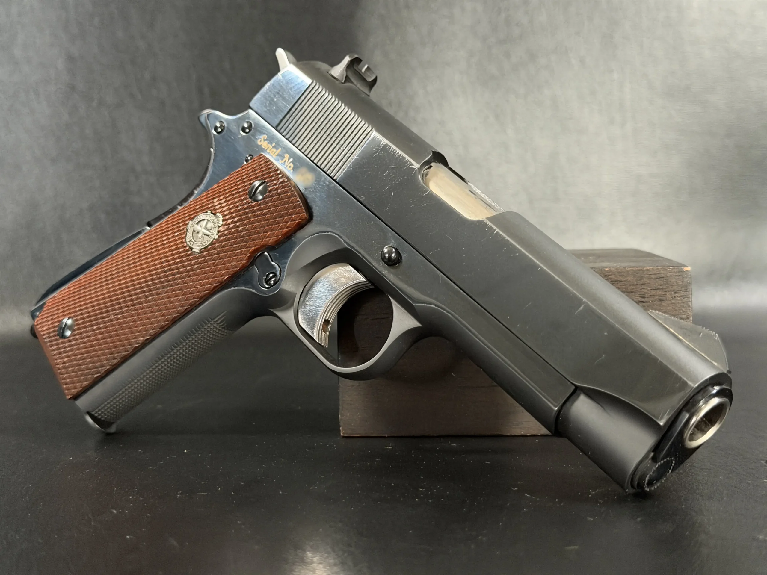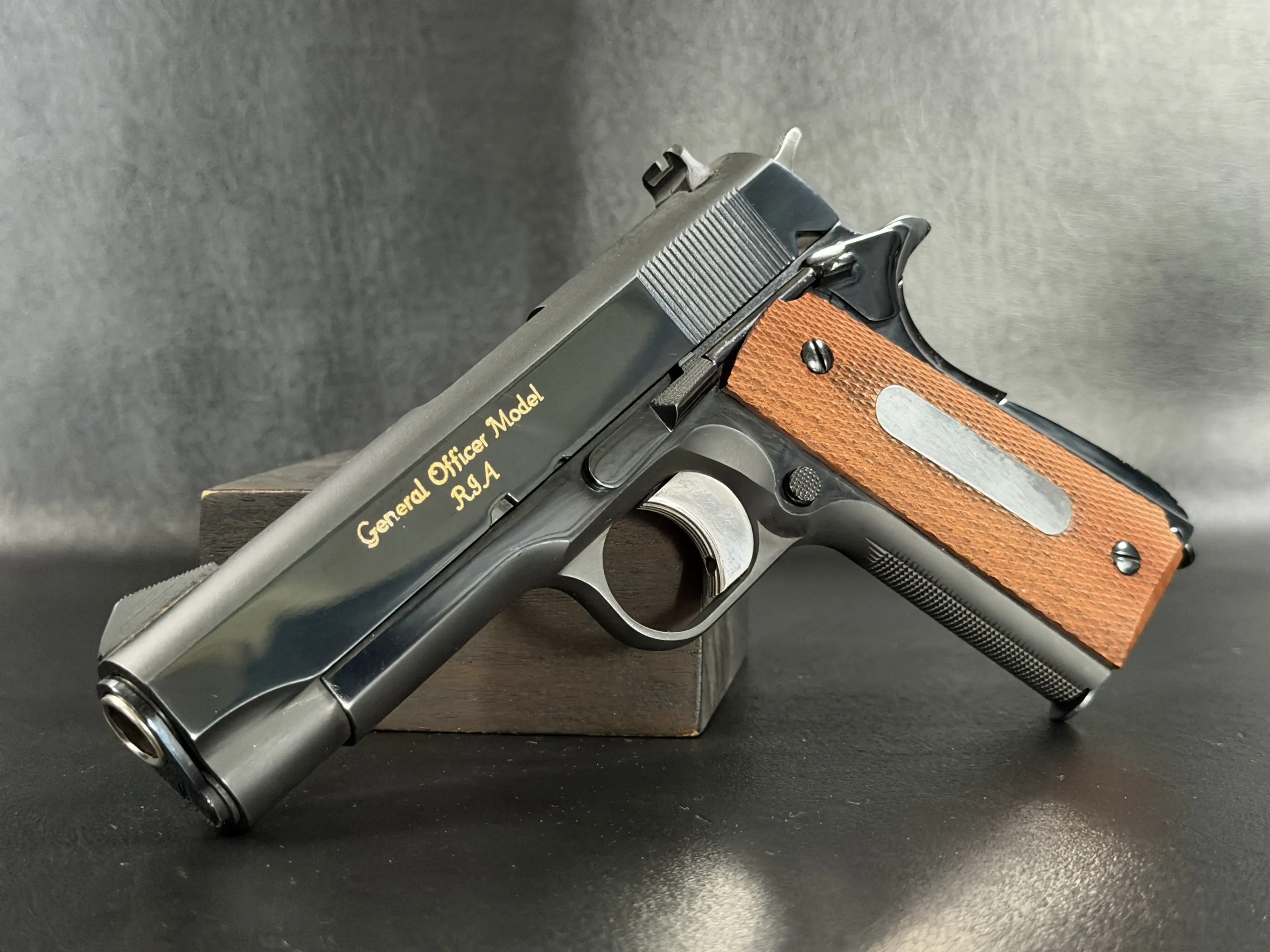 The pistol exhibits a clean, purposeful military finish consistent with Arsenal work of the era. Vertical slide serrations, fixed combat-style sights, and the solid recoil spring guide configuration align with early General Officer prototypes. The grip panels are fitted with medallions and display the utilitarian refinement expected of a presentation-grade military sidearm without drifting into commercial embellishment.