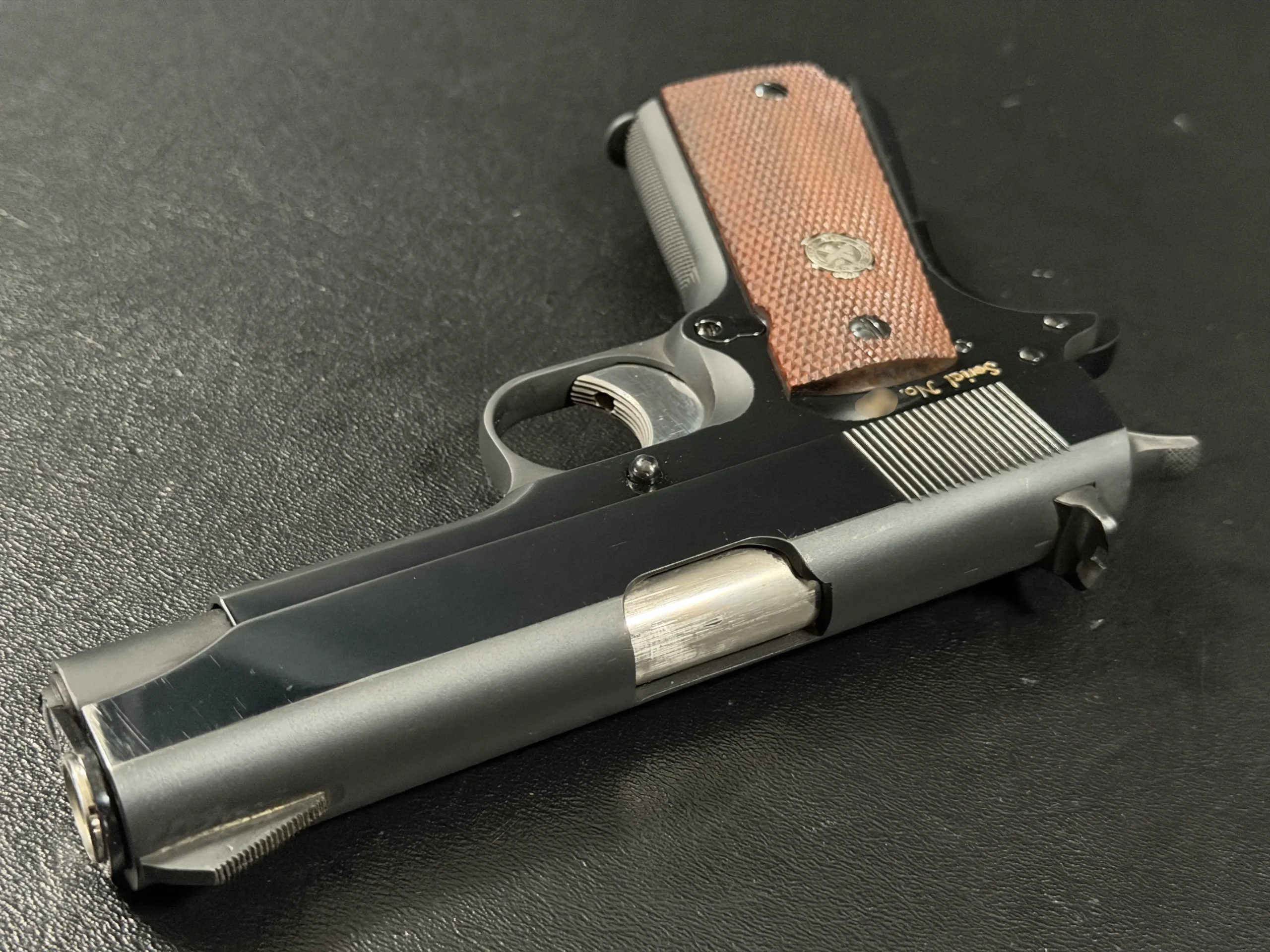 What makes this piece particularly significant is its place within the development lineage. These M15 prototypes were not mass-produced service pistols; they were evaluation pieces. They embody the discussion between ordnance officials, the subtle changes in engraving language, the consideration of sight height and holster fit, and the deliberate move to distinguish these pistols from standard M1911A1 receivers.