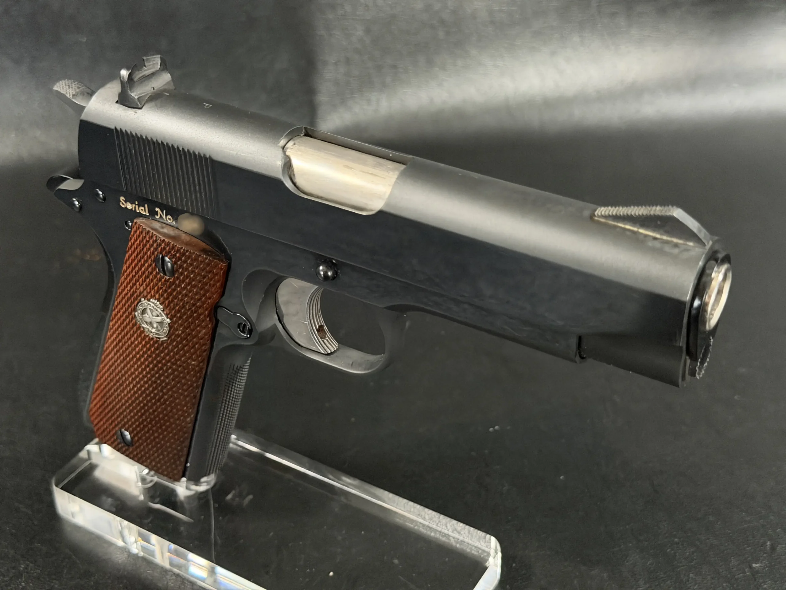 Chambered in .45 ACP, the pistol retains the classic 1911 architecture but incorporates distinctive features that separate it from standard production models. The slide markings, configuration, and finish reflect the evolving specifications discussed in official memoranda of the period. As documented in U.S. Military Automatic Pistols 1945–2012 by Edward Scott Meadows, prototype variations such as this were examined, revised, and remarked upon as the program moved from concept to limited-issue production.