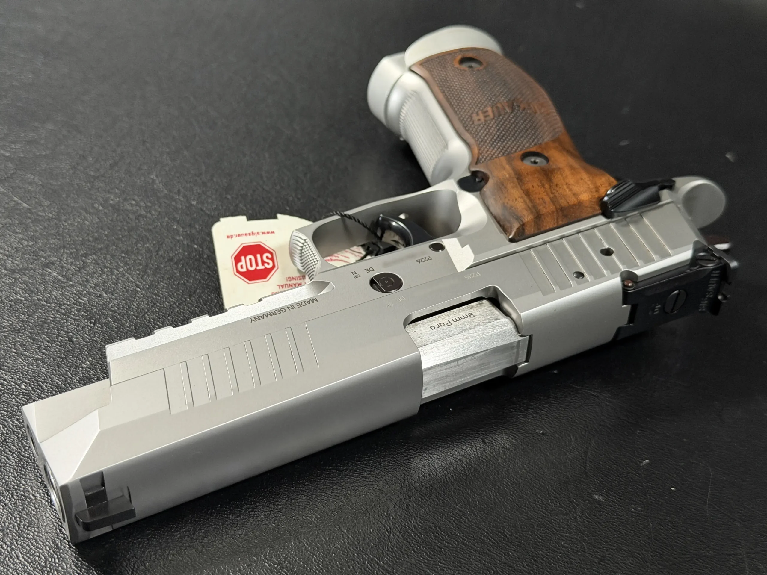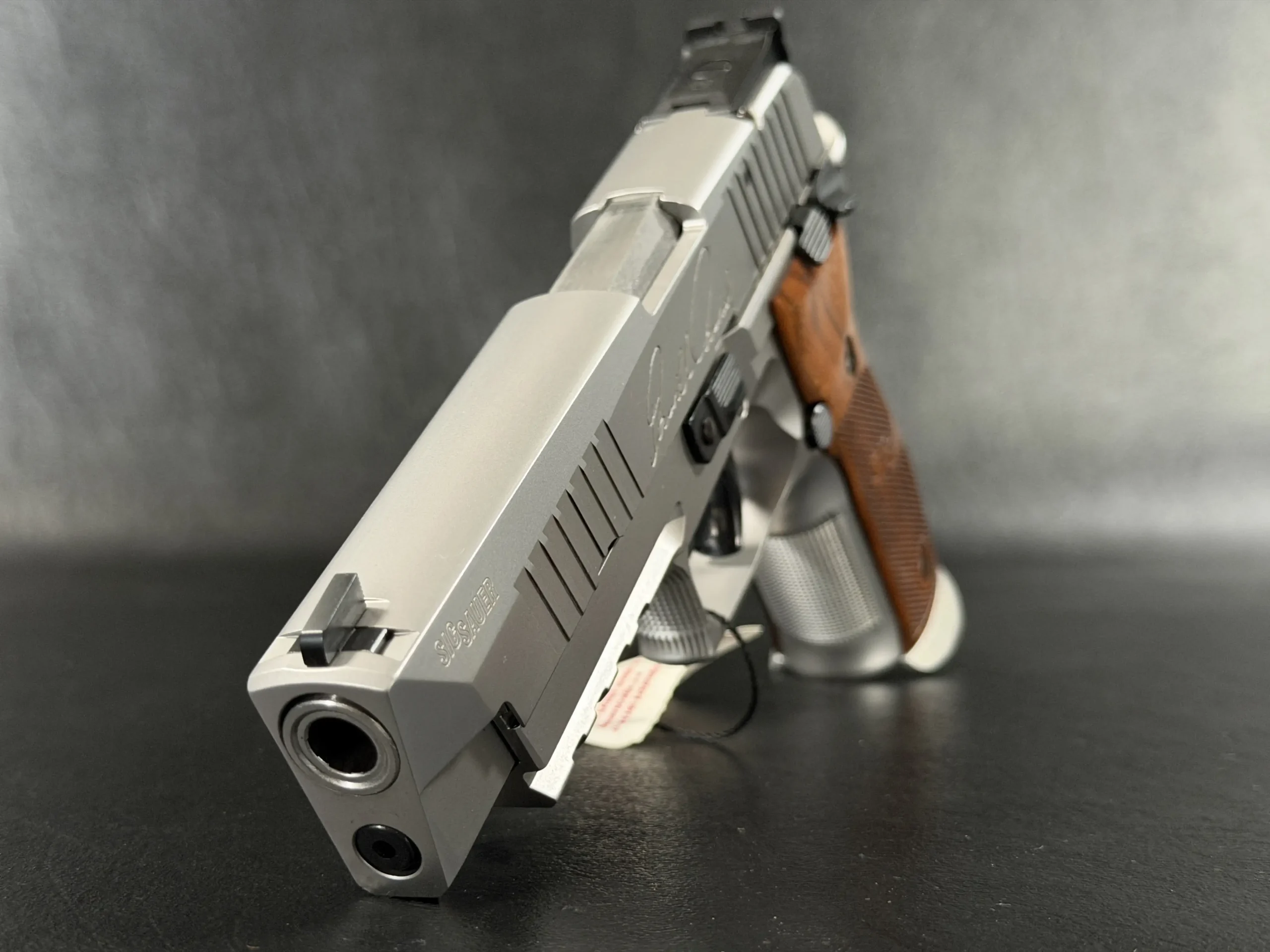 The ergonomics follow suit. The contoured beavertail, extended controls, and deeply cut front-strap checkering all point to a pistol built with performance in mind. The beautifully figured wooden grips, marked SIG SAUER, add warmth against the otherwise industrial precision of the steel frame, creating that balance collectors look for: technical excellence paired with visual appeal.