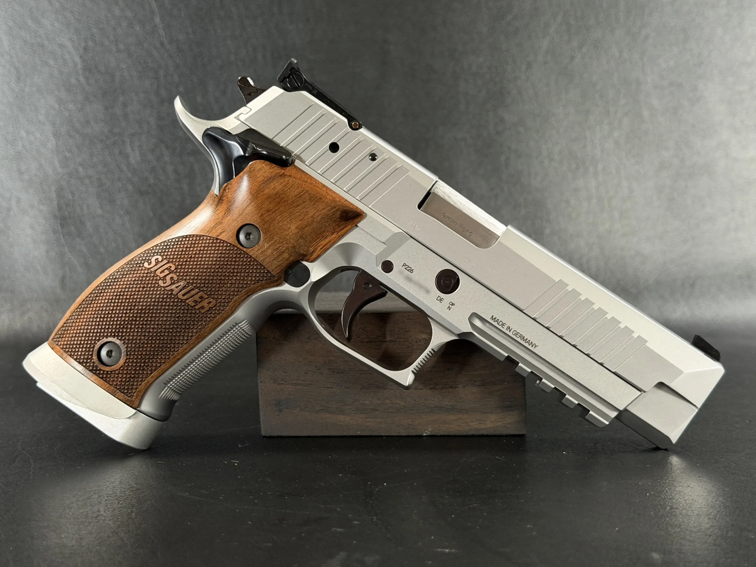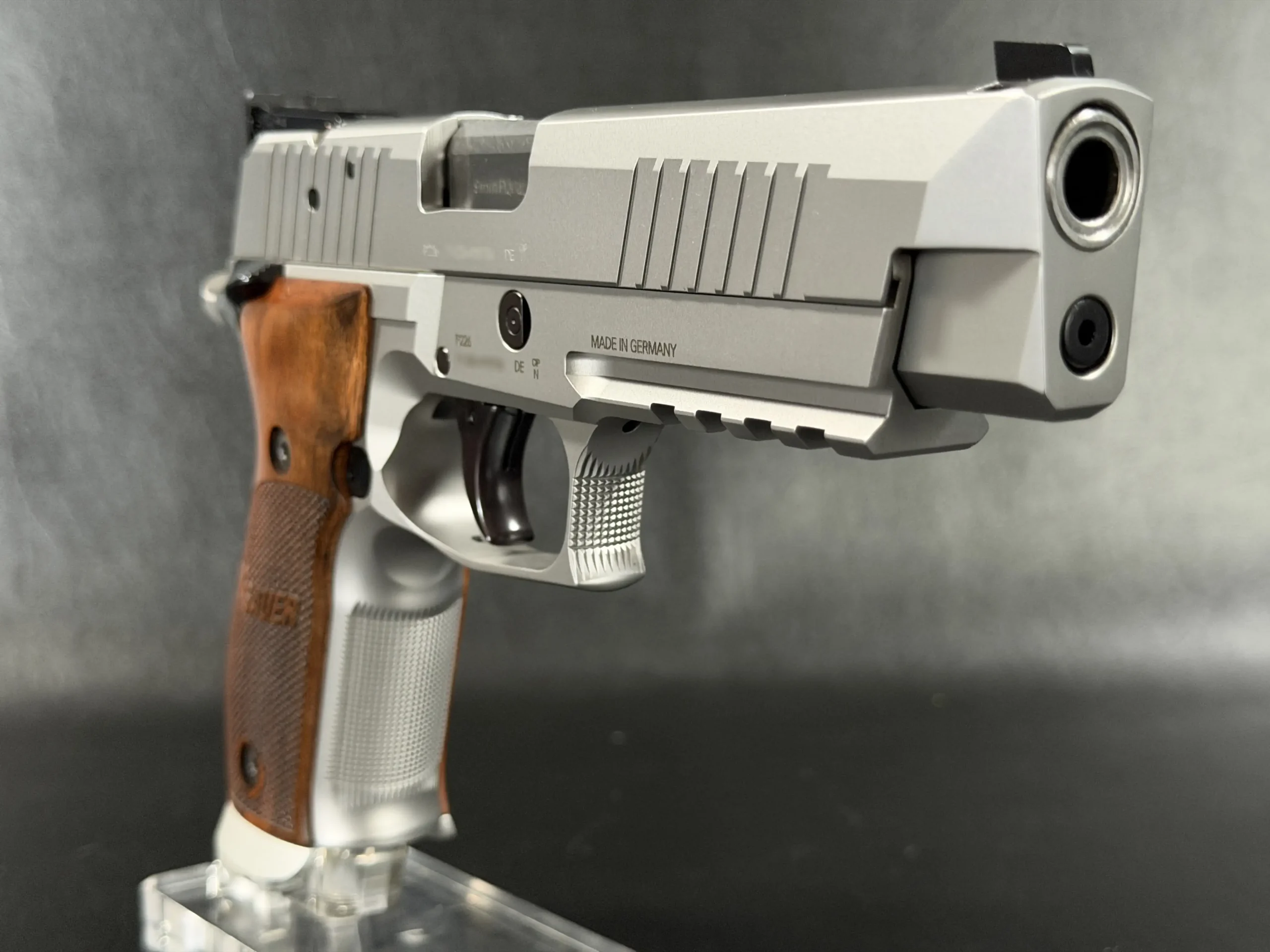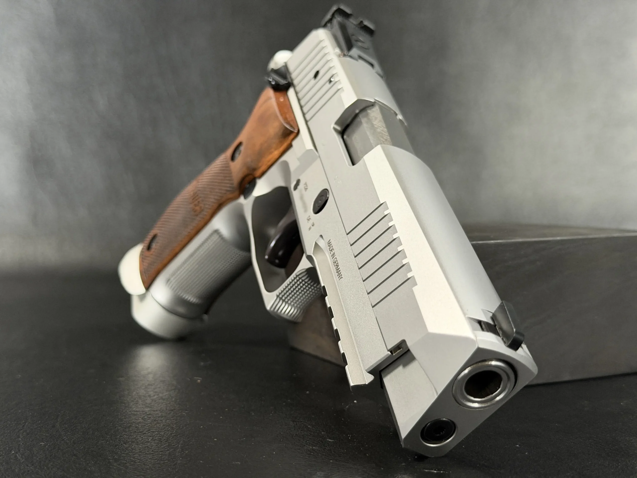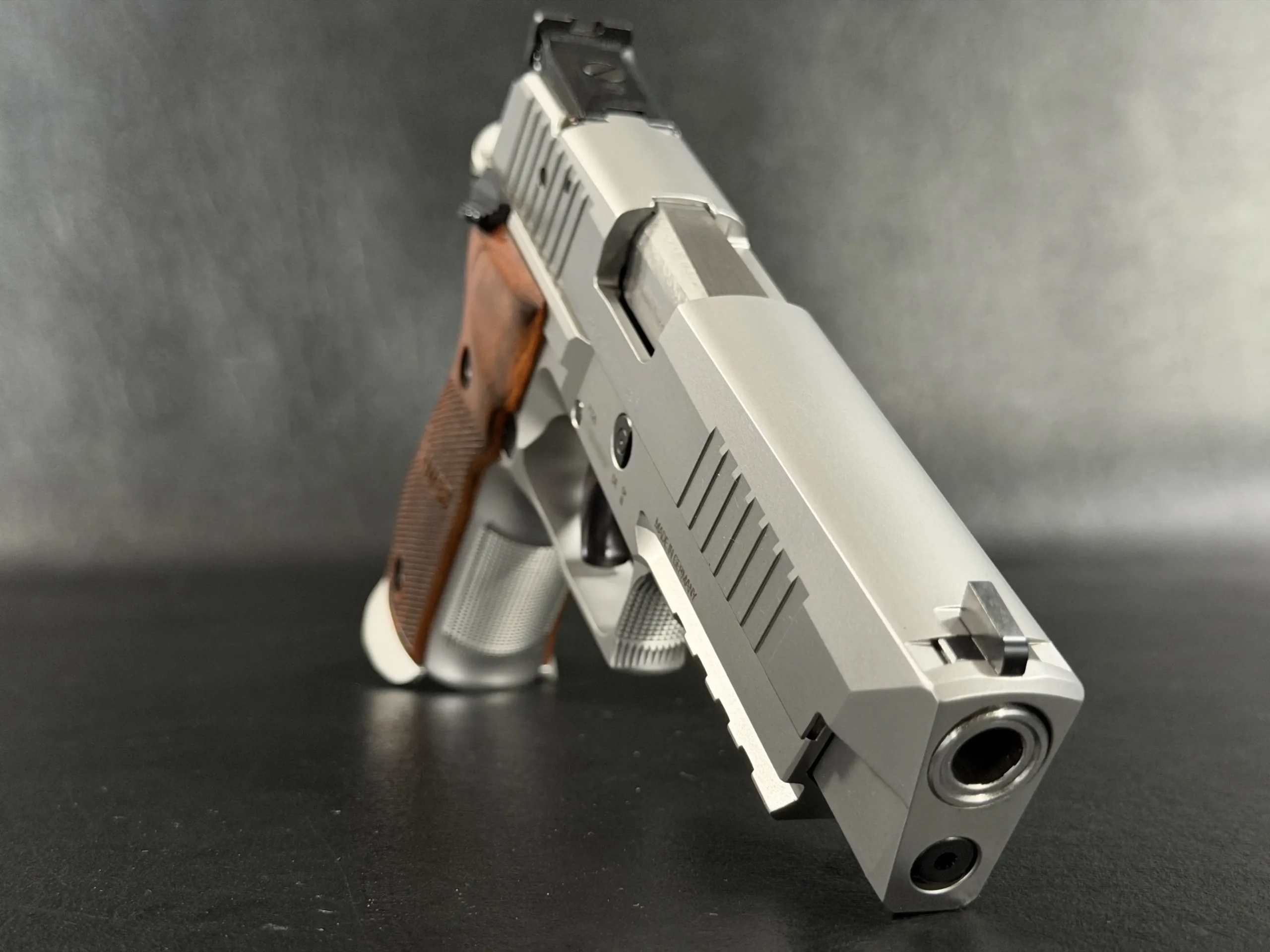 The pistol is finished in a refined matte silver tone, giving it a clean, almost architectural presence. It’s complemented by richly figured wooden grips, sharply checkered and prominently marked with the SIG SAUER logo, adding warmth and contrast to the otherwise precision-focused aesthetic. The extended beavertail, skeletonized-style trigger, and sculpted frame all reflect the X-Five’s competition pedigree, while the full-length dust cover and integrated rail provide both balance and visual weight.