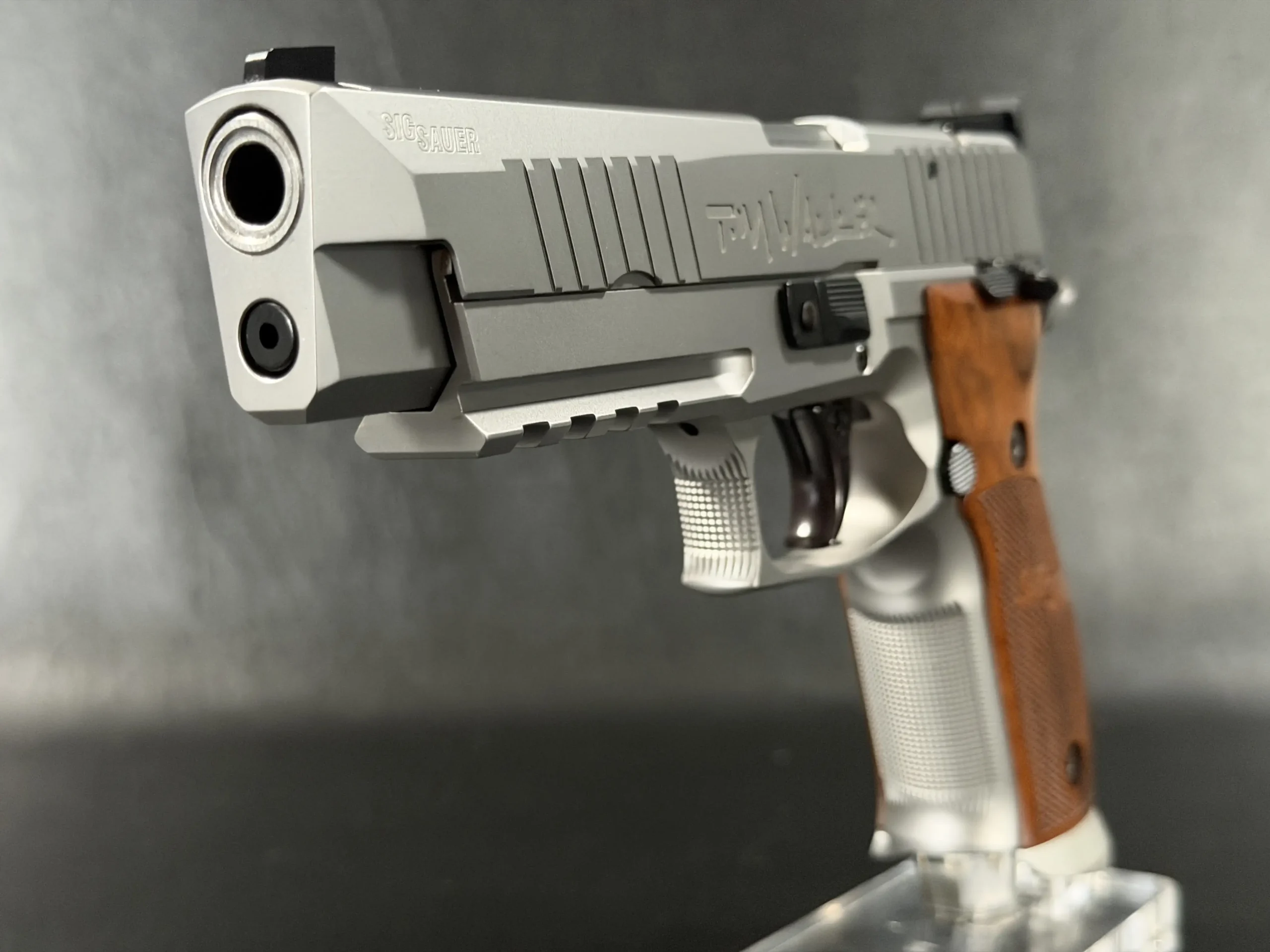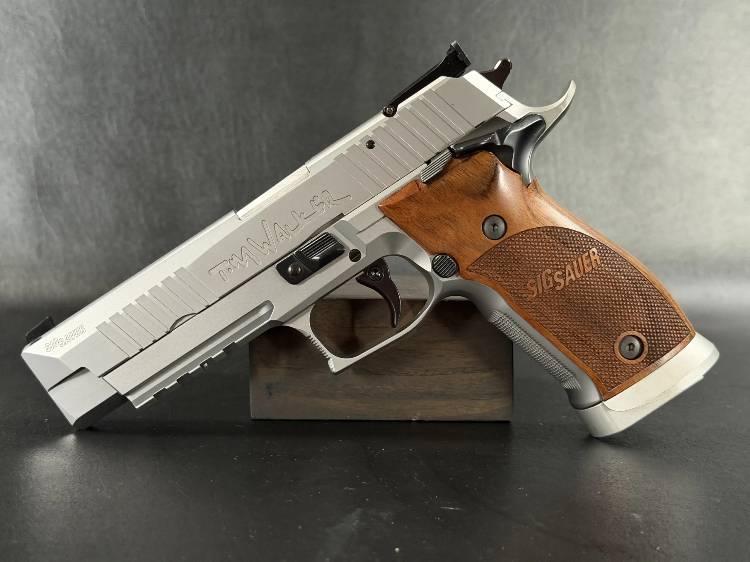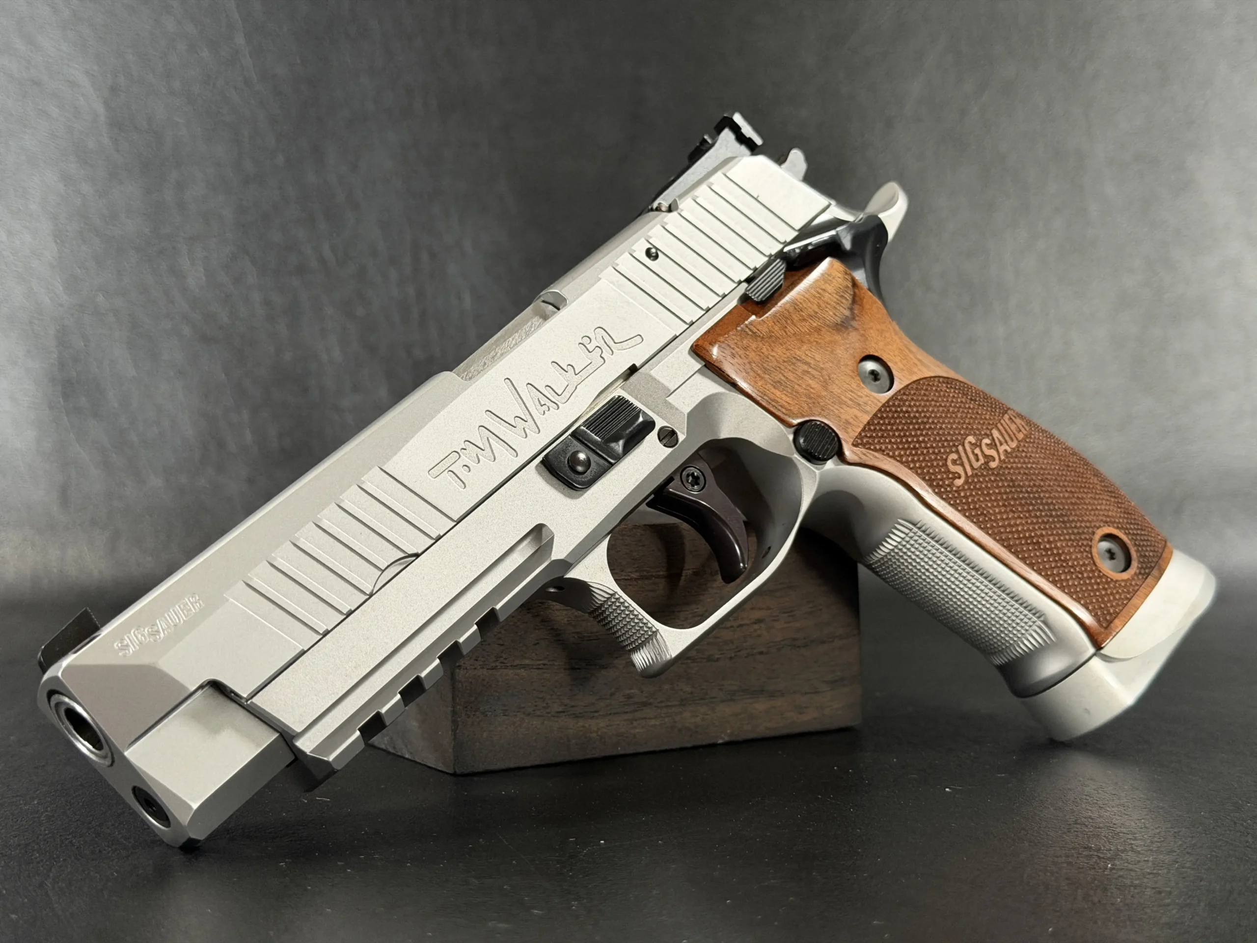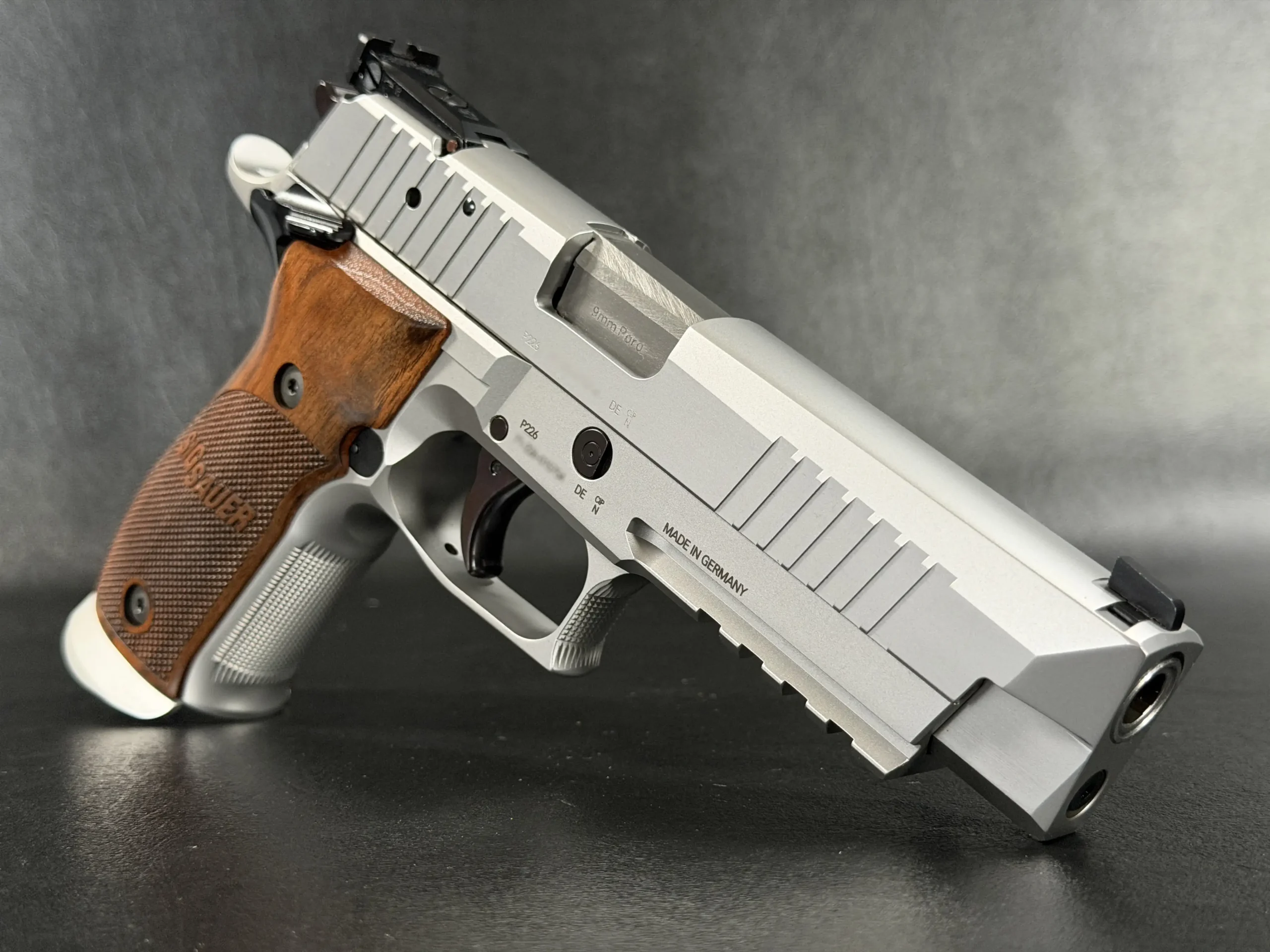 The pistol is finished in a refined matte silver tone, giving it a clean, almost architectural presence. It’s complemented by richly figured wooden grips, sharply checkered and prominently marked with the SIG SAUER logo, adding warmth and contrast to the otherwise precision-focused aesthetic. The extended beavertail, skeletonized-style trigger, and sculpted frame all reflect the X-Five’s competition pedigree, while the full-length dust cover and integrated rail provide both balance and visual weight.