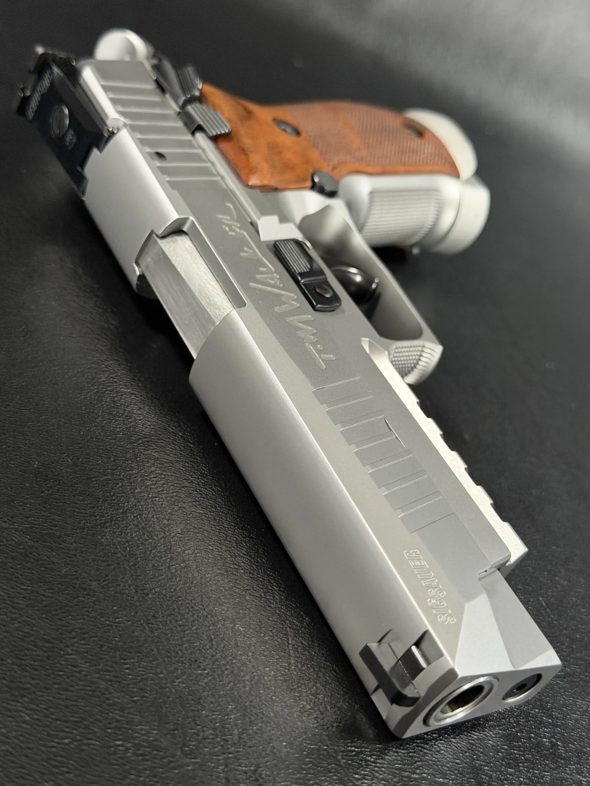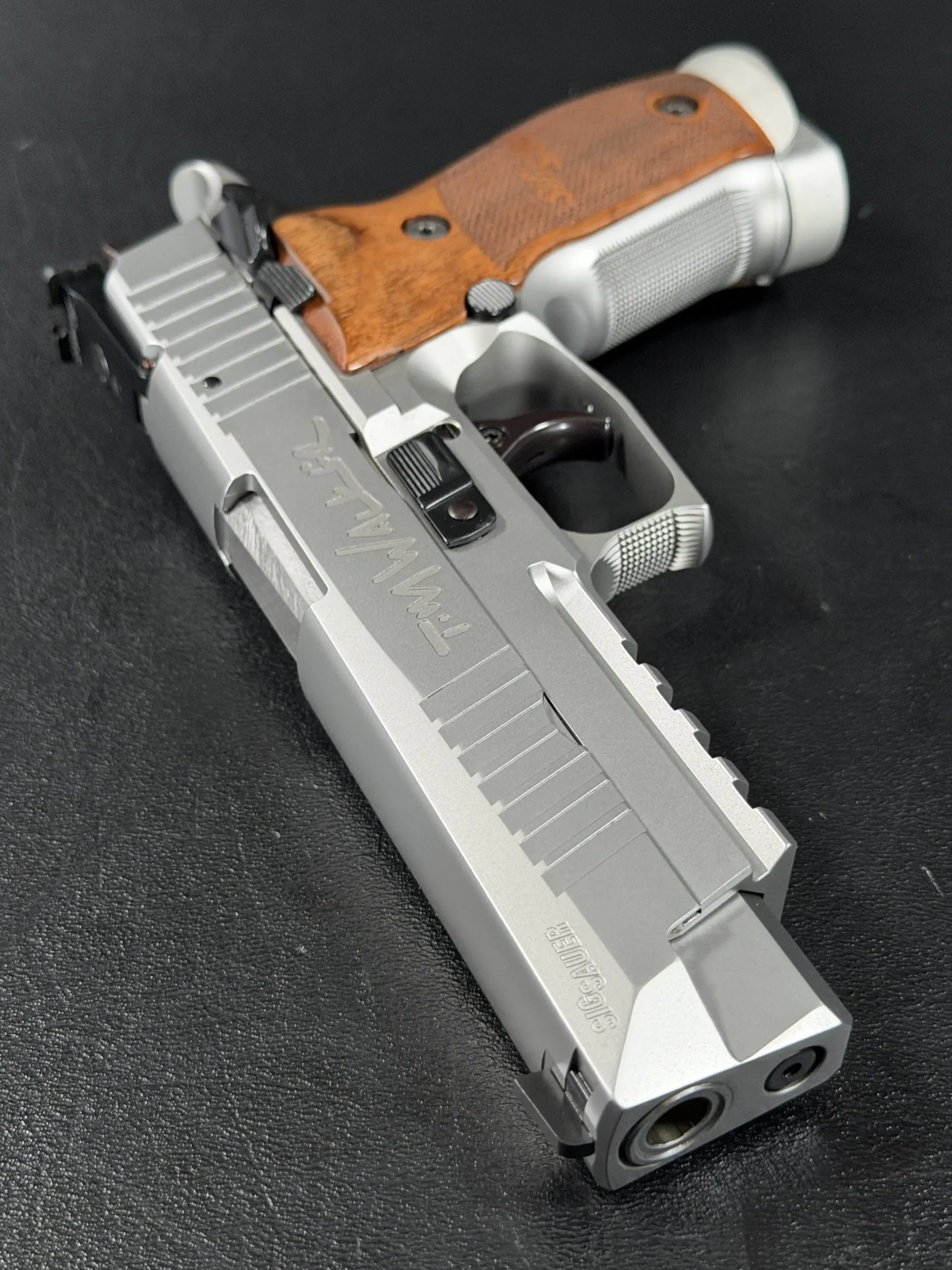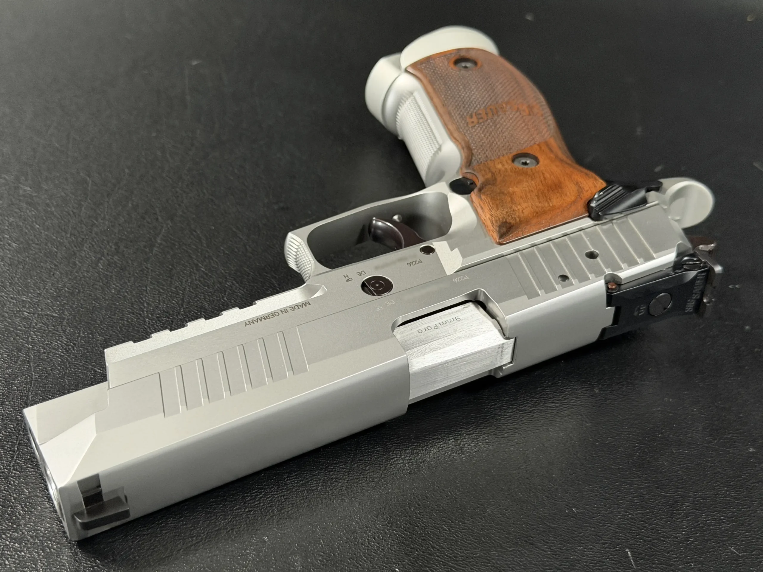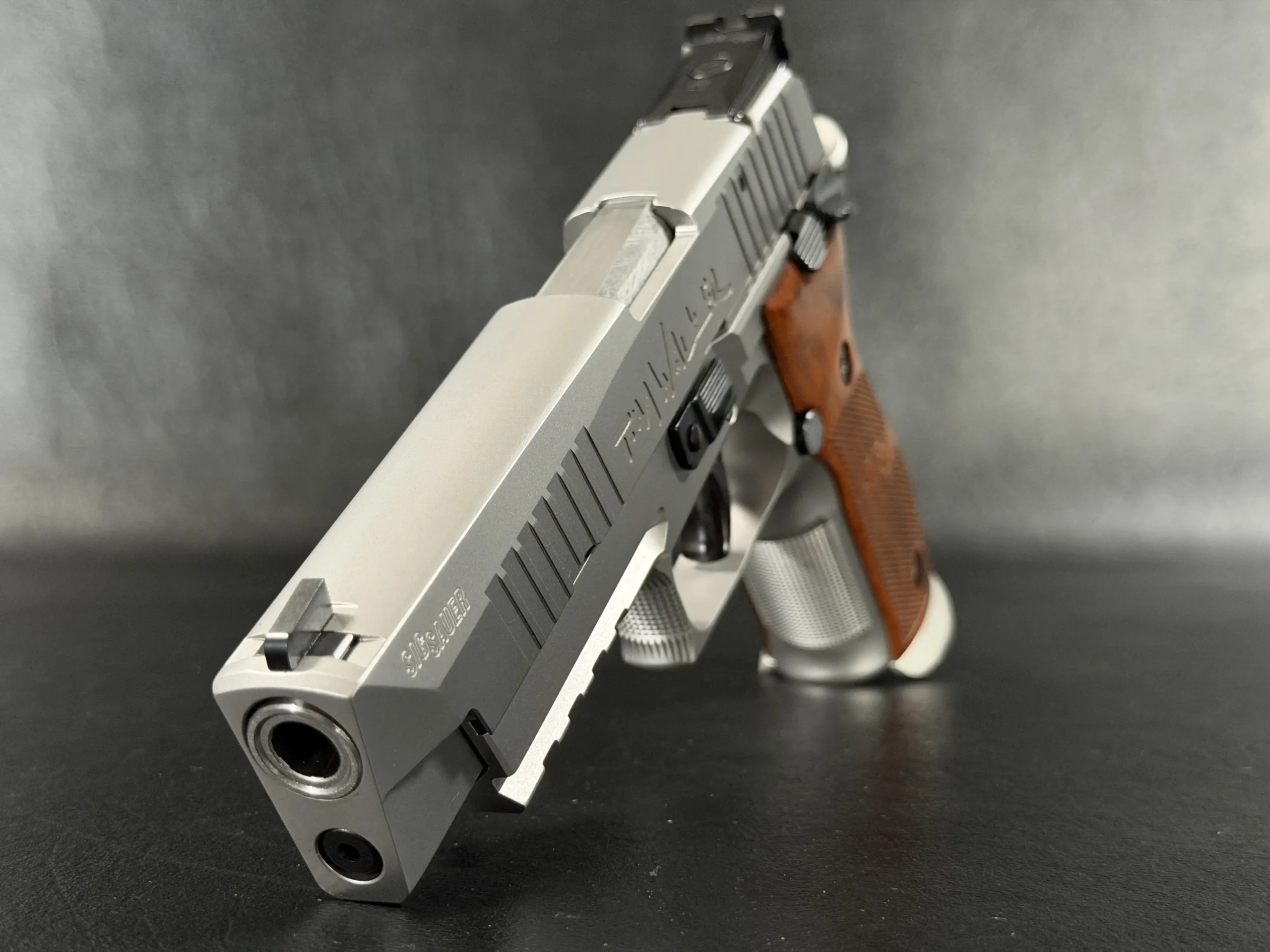 The pistol is finished in a refined matte silver tone, giving it a clean, almost architectural presence. It’s complemented by richly figured wooden grips, sharply checkered and prominently marked with the SIG SAUER logo, adding warmth and contrast to the otherwise precision-focused aesthetic. The extended beavertail, skeletonized-style trigger, and sculpted frame all reflect the X-Five’s competition pedigree, while the full-length dust cover and integrated rail provide both balance and visual weight.