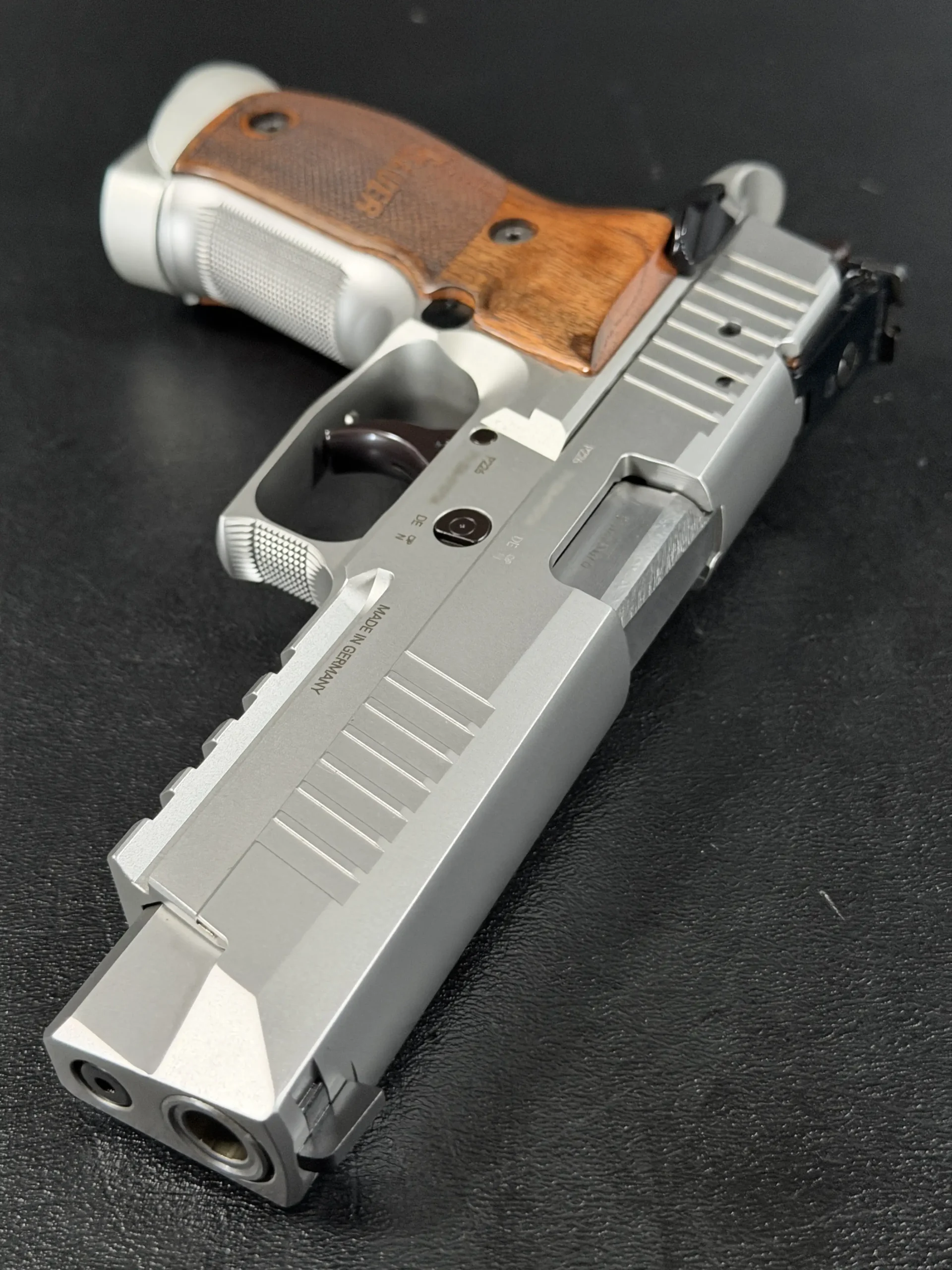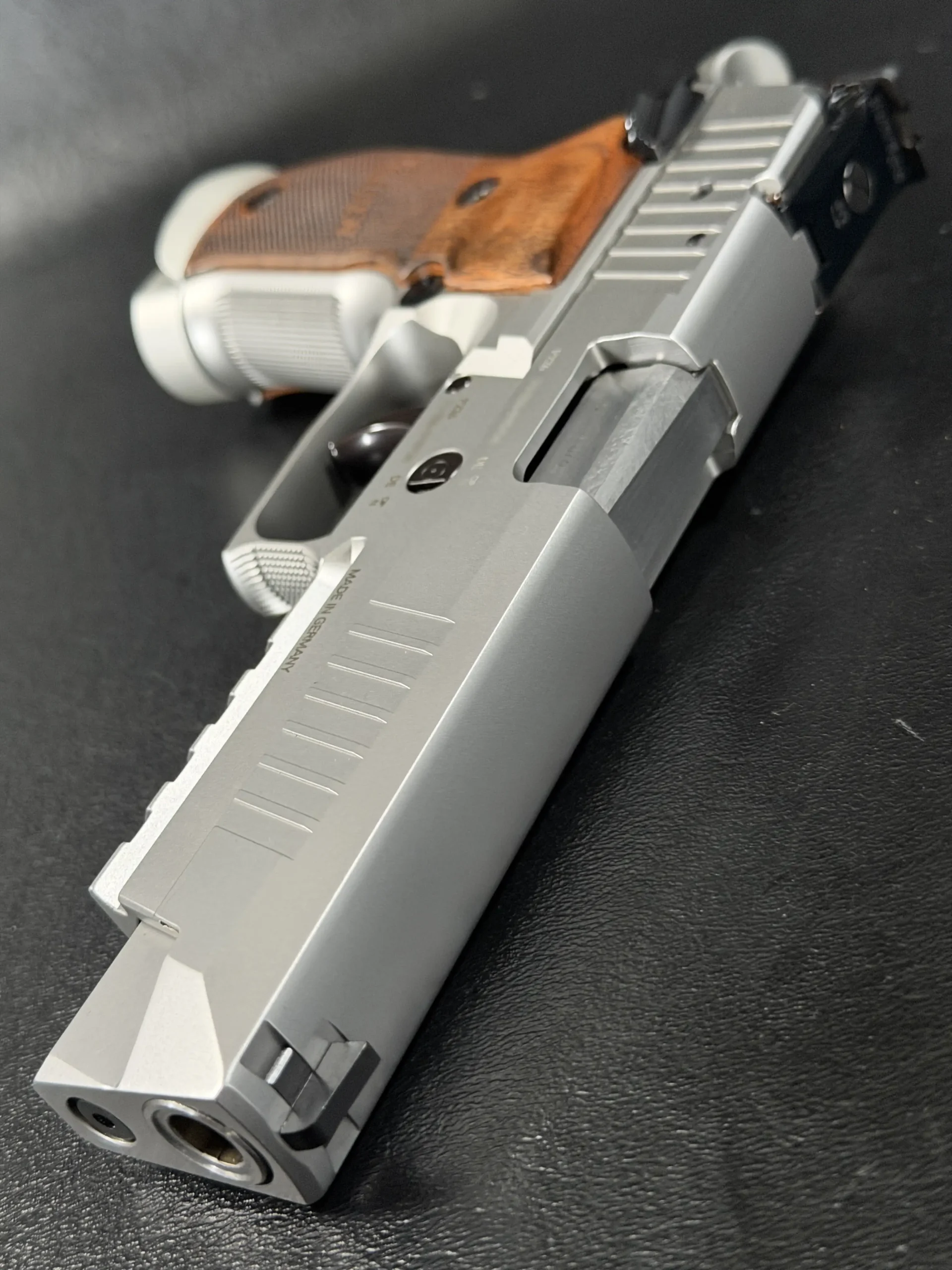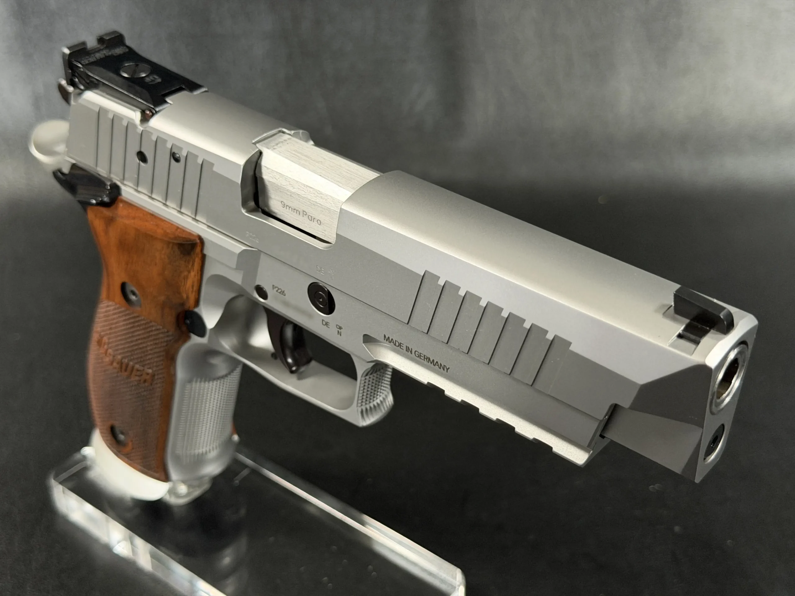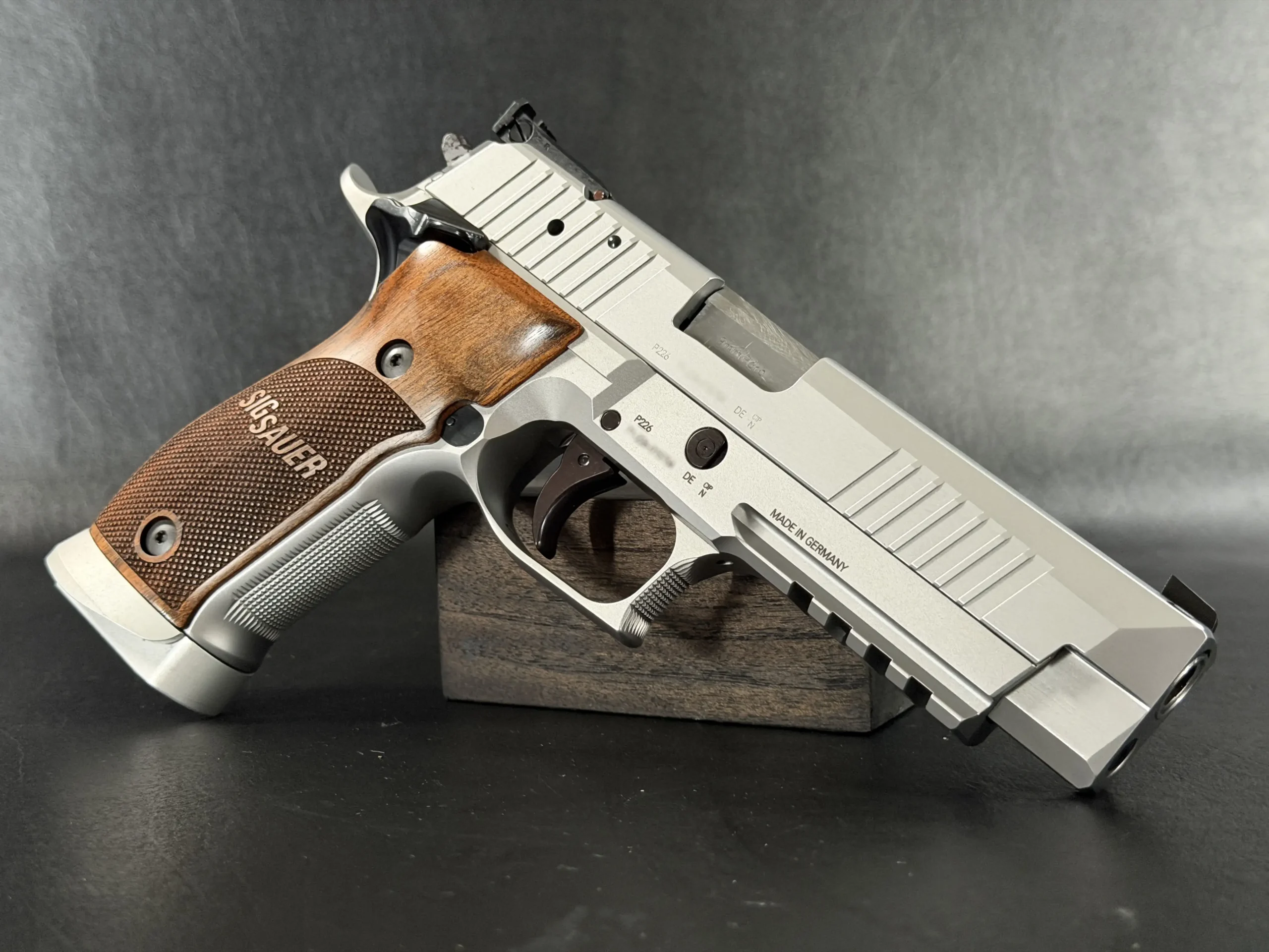The pistol is finished in a refined matte silver tone, giving it a clean, almost architectural presence. It’s complemented by richly figured wooden grips, sharply checkered and prominently marked with the SIG SAUER logo, adding warmth and contrast to the otherwise precision-focused aesthetic. The extended beavertail, skeletonized-style trigger, and sculpted frame all reflect the X-Five’s competition pedigree, while the full-length dust cover and integrated rail provide both balance and visual weight.
