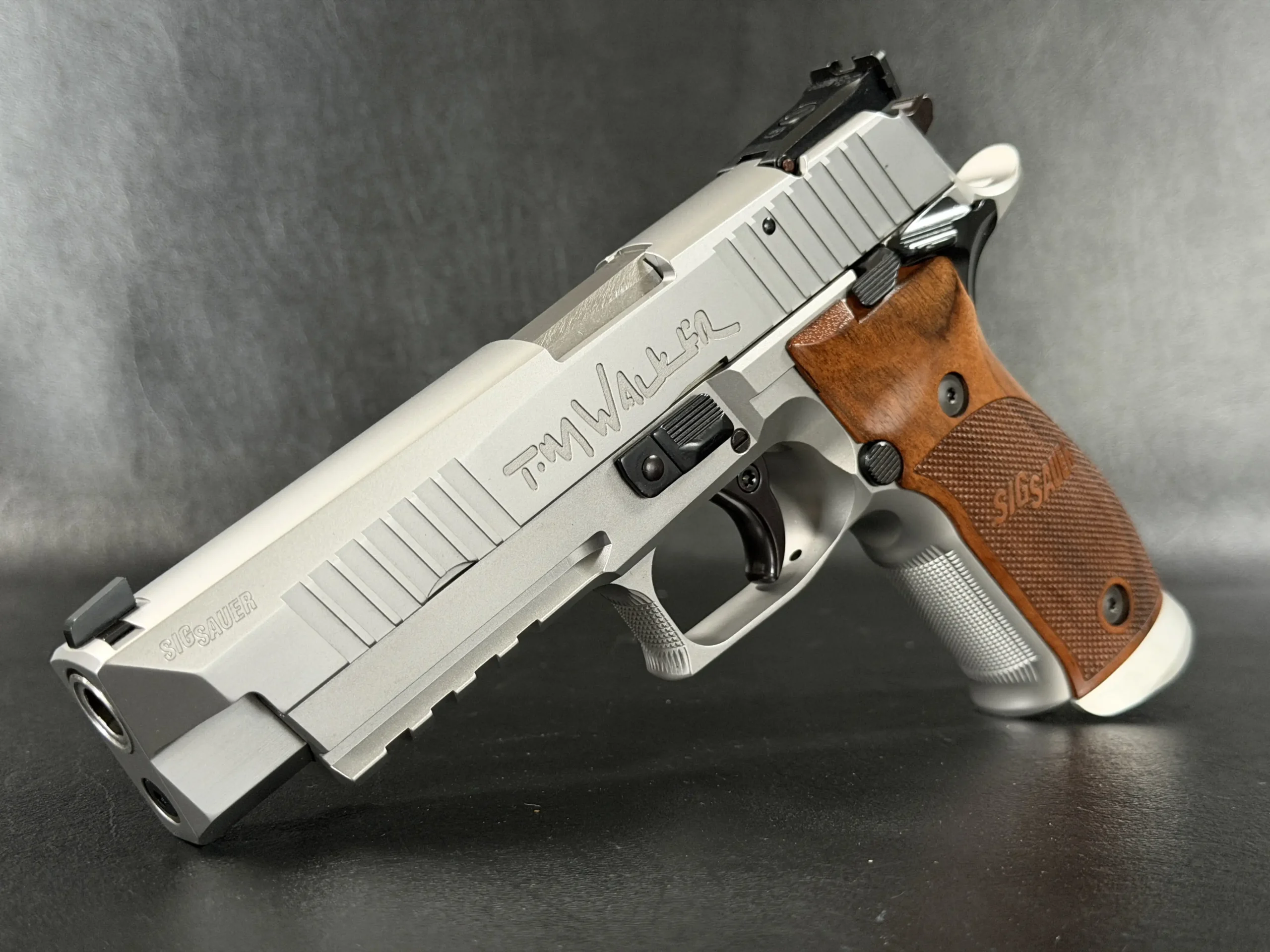 Chambered in 9mm, this pistol showcases the unmistakable DNA of the X-Five line while carrying details that set it apart immediately. The most striking feature is the hand-engraved “Tom Waller” signature across the slide, a rare and personal touch that ties the pistol directly to its Mastershop origins and elevates it beyond a standard performance gun into something far more individual.