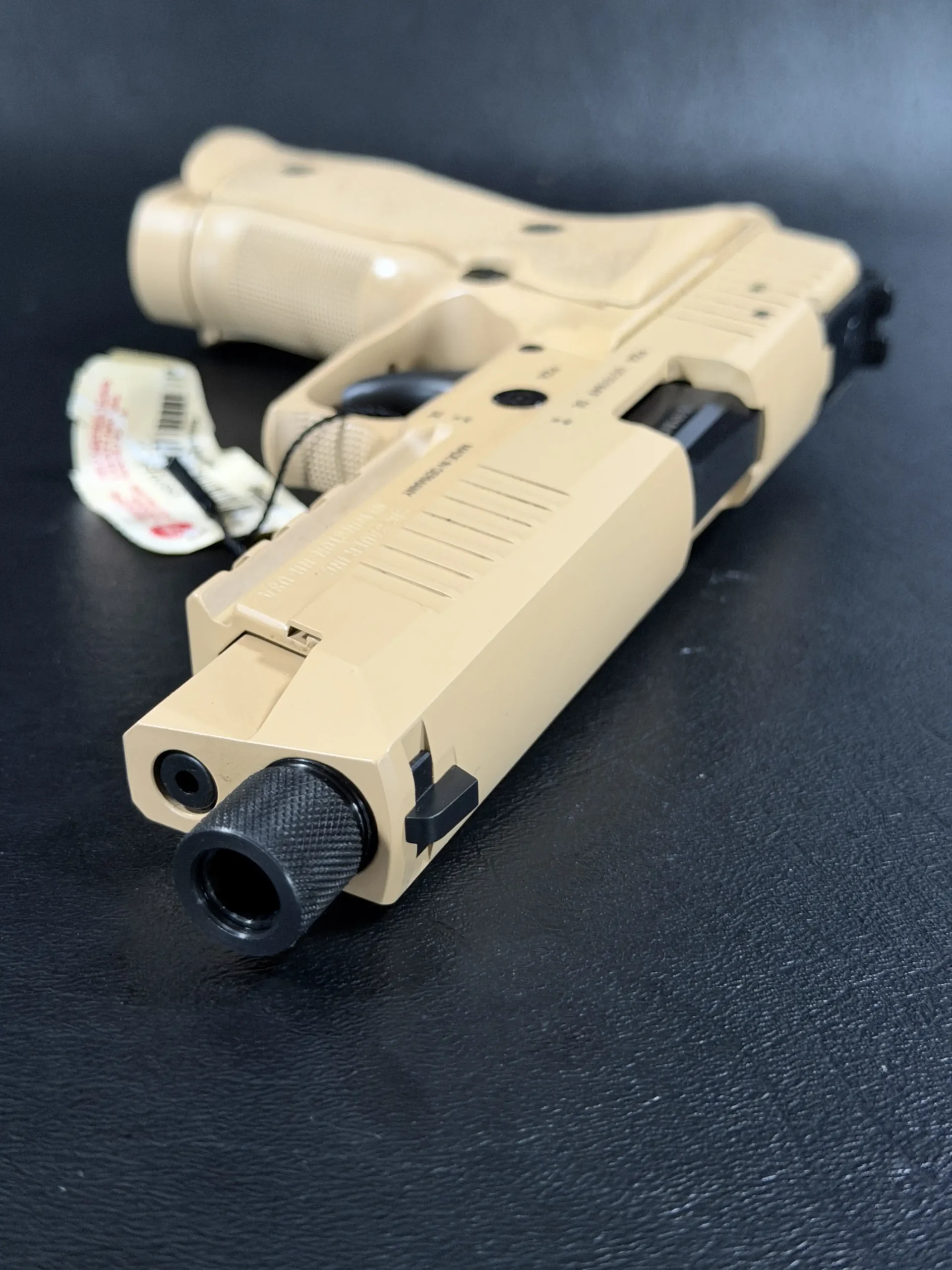 This example is chambered in 9mm, with all major components correctly matched, preserving both mechanical harmony and collector integrity. The Desert Sand finish is evenly applied to the slide and frame, giving the pistol a cohesive, intentional presence that feels both modern and distinctly European.