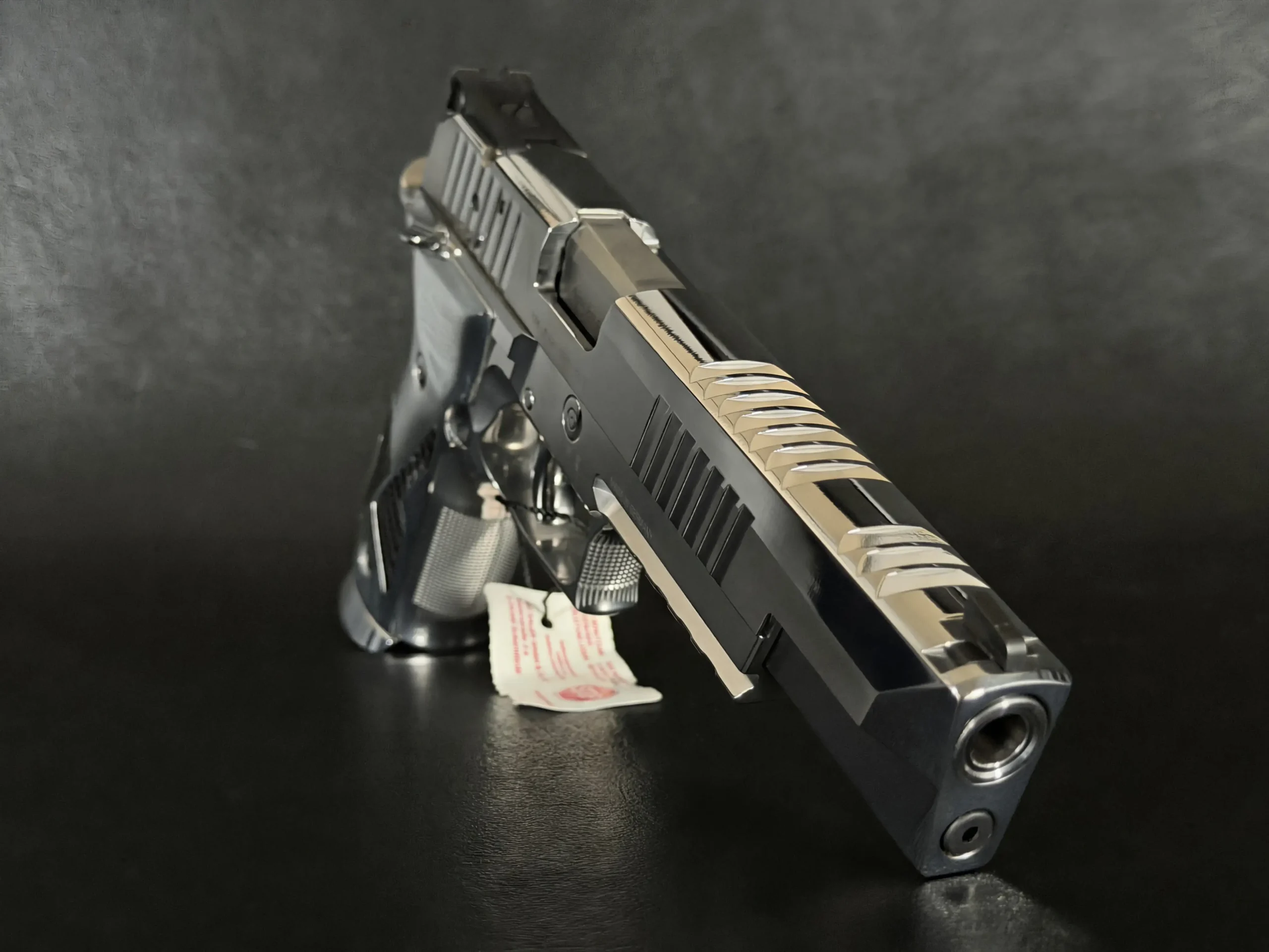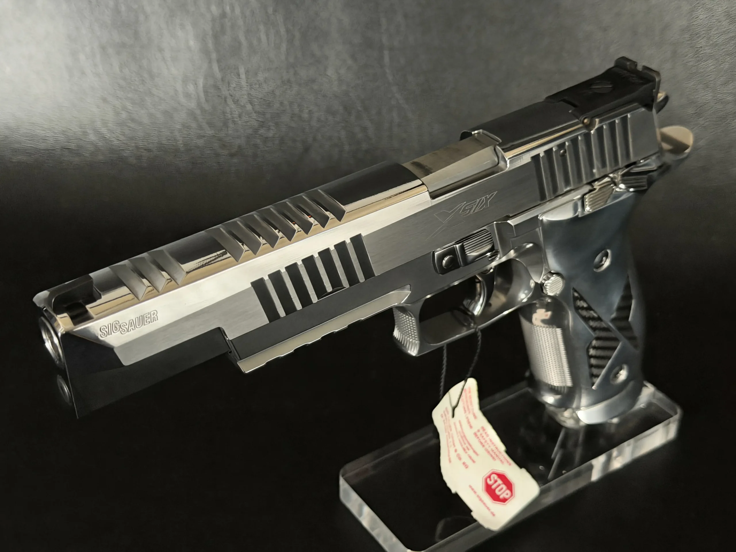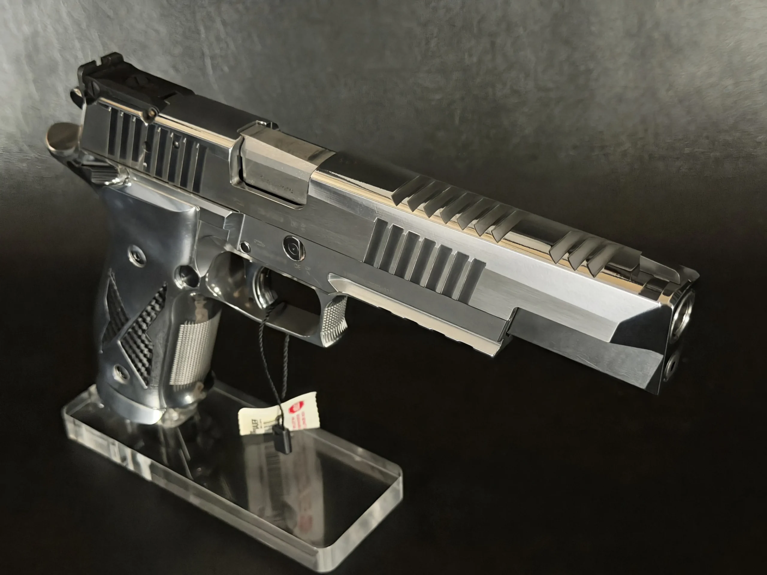 The mirror-polished chrome finish dominates the pistol’s presence, flowing seamlessly across the slide and frame with crisp machining lines still clearly defined. The extended slide, precision-cut serrations, and full-length dust cover give the X-Six its unmistakable profile, long, balanced, and purpose-built for accuracy. Subtle branding and clean surfaces keep the overall aesthetic restrained, allowing the craftsmanship to speak for itself.