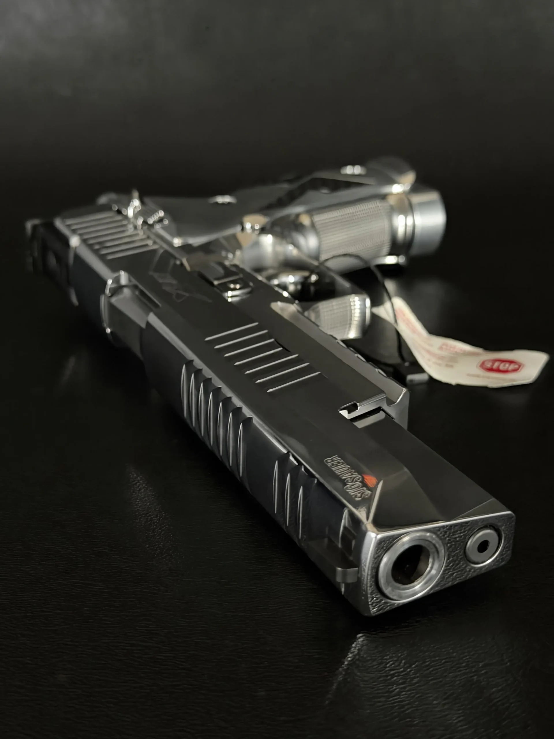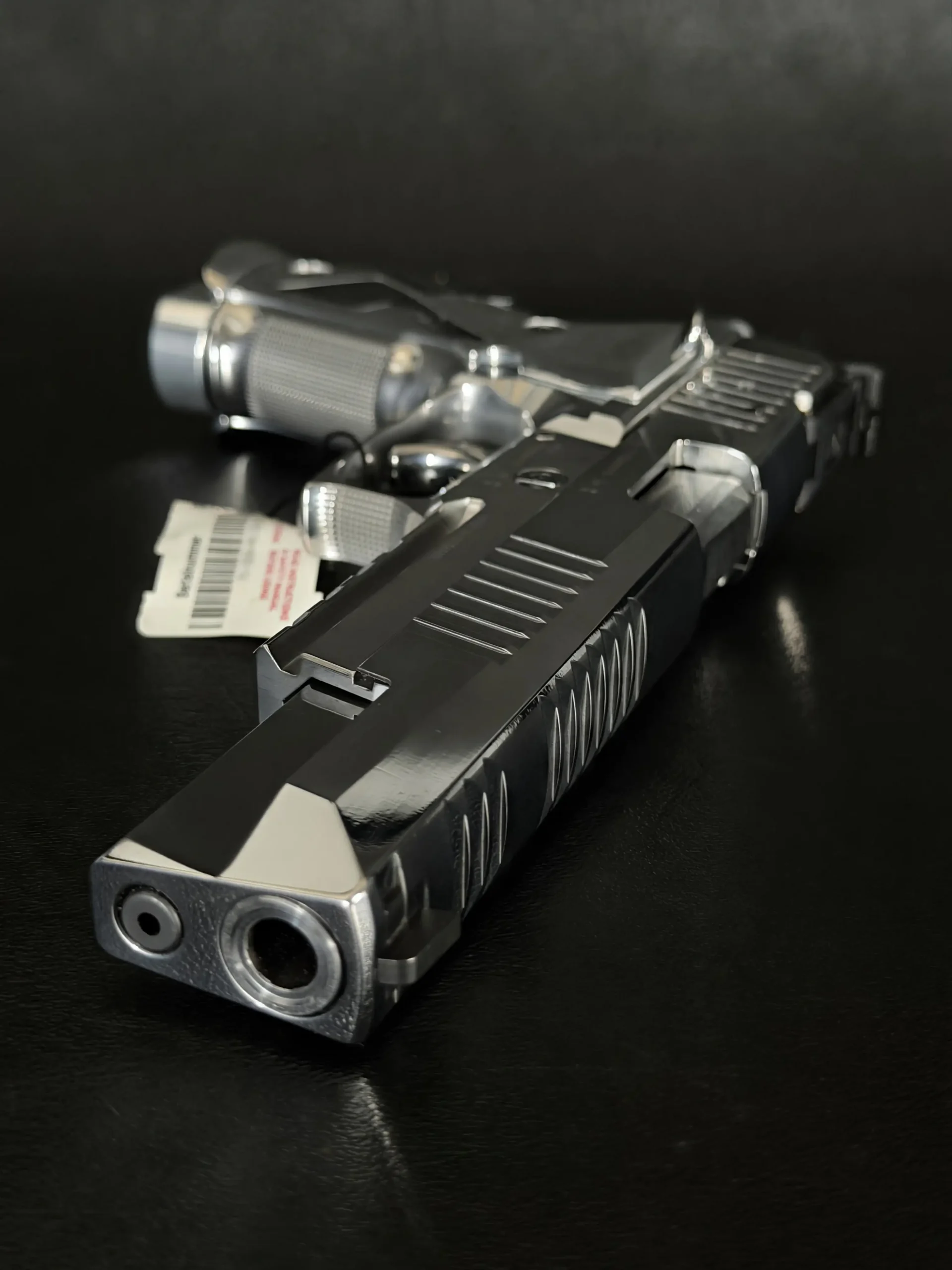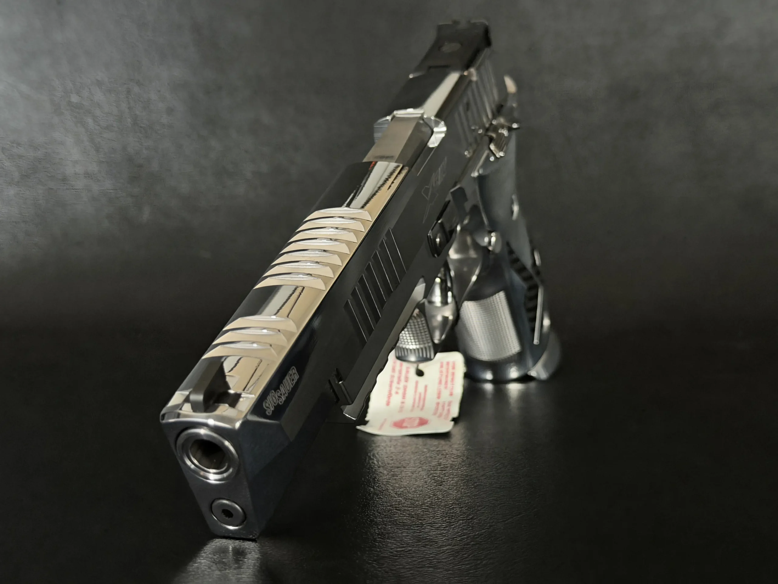 The mirror-polished chrome finish dominates the pistol’s presence, flowing seamlessly across the slide and frame with crisp machining lines still clearly defined. The extended slide, precision-cut serrations, and full-length dust cover give the X-Six its unmistakable profile, long, balanced, and purpose-built for accuracy. Subtle branding and clean surfaces keep the overall aesthetic restrained, allowing the craftsmanship to speak for itself.