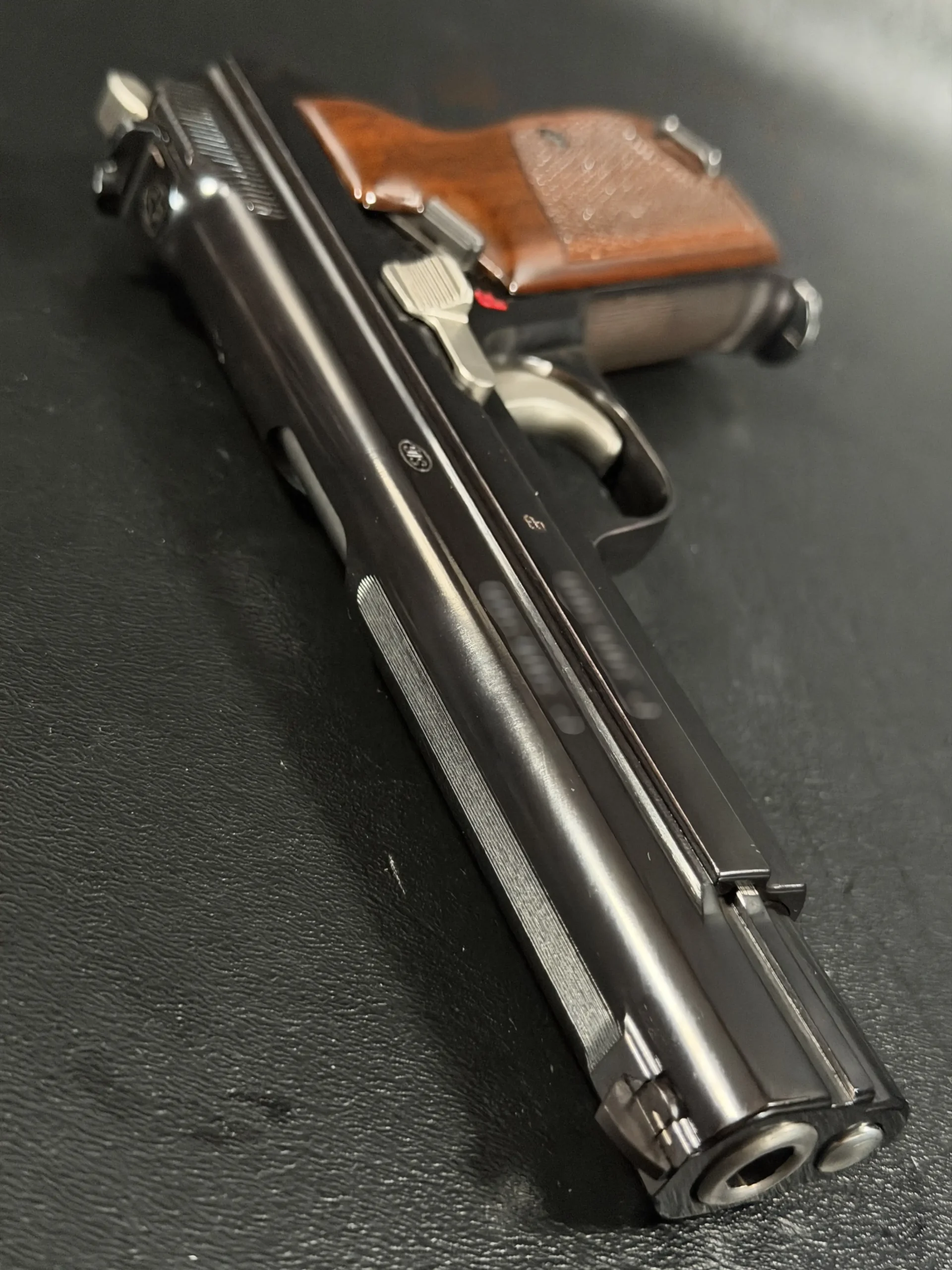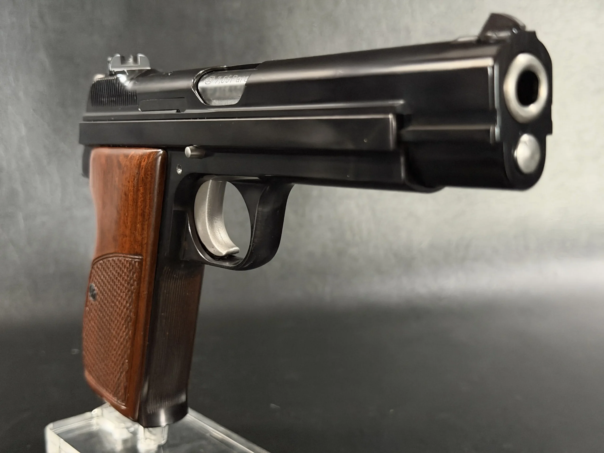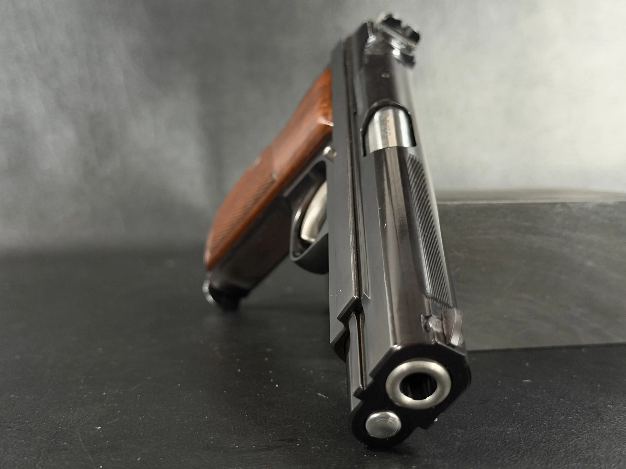 Chambered in 9mm, the P210-6 represents the evolution of the legendary Swiss service pistol into a refined commercial variant, purpose-built for accuracy and balance. Immediately recognizable by its extended slide and barrel profile, the -6 variant offers a longer sight radius, enhancing both target acquisition and shot-to-shot consistency. It is a pistol that rewards discipline and delivers a shooting experience that feels almost surgical in its precision.