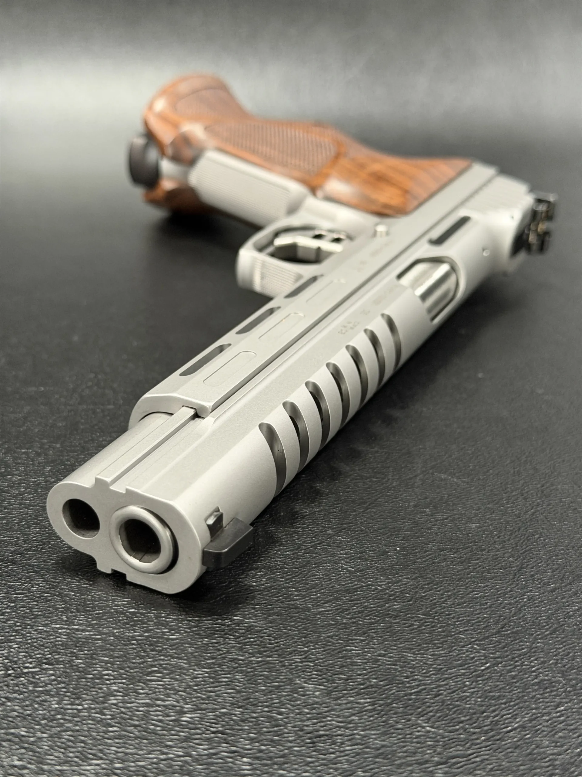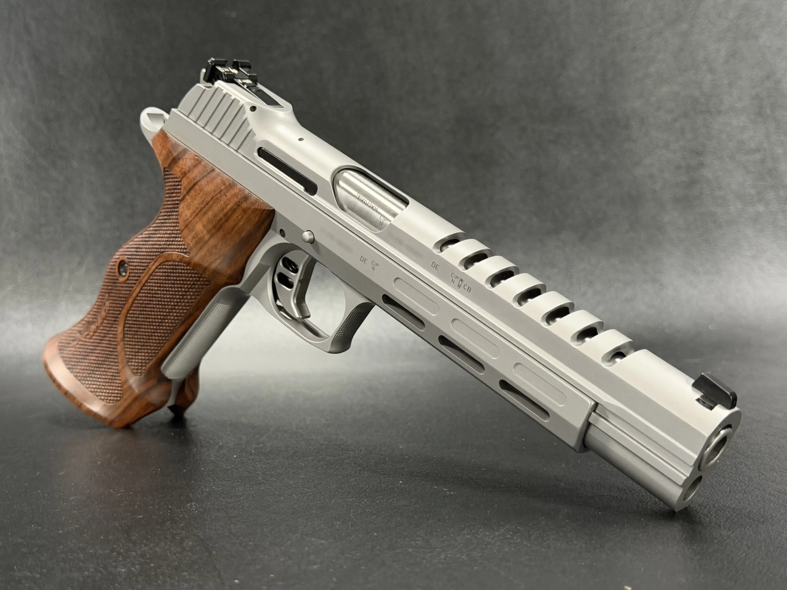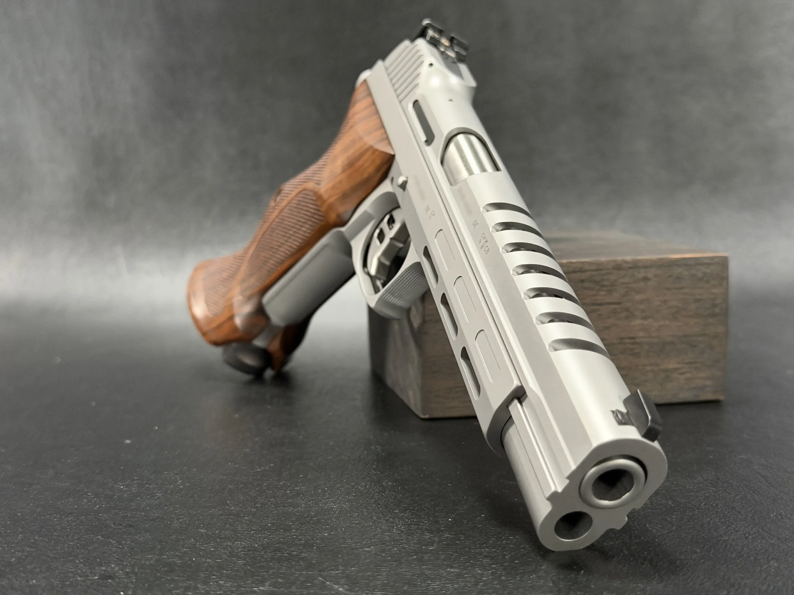 Chambered in 9mm, this pistol features a precision-machined stainless steel frame and slide with distinctive “skeletonized” window cuts along the slide and frame, reducing mass while adding a purposeful, architectural aesthetic. The result is a pistol that feels exceptionally balanced in hand, with smooth cycling and superb controllability.