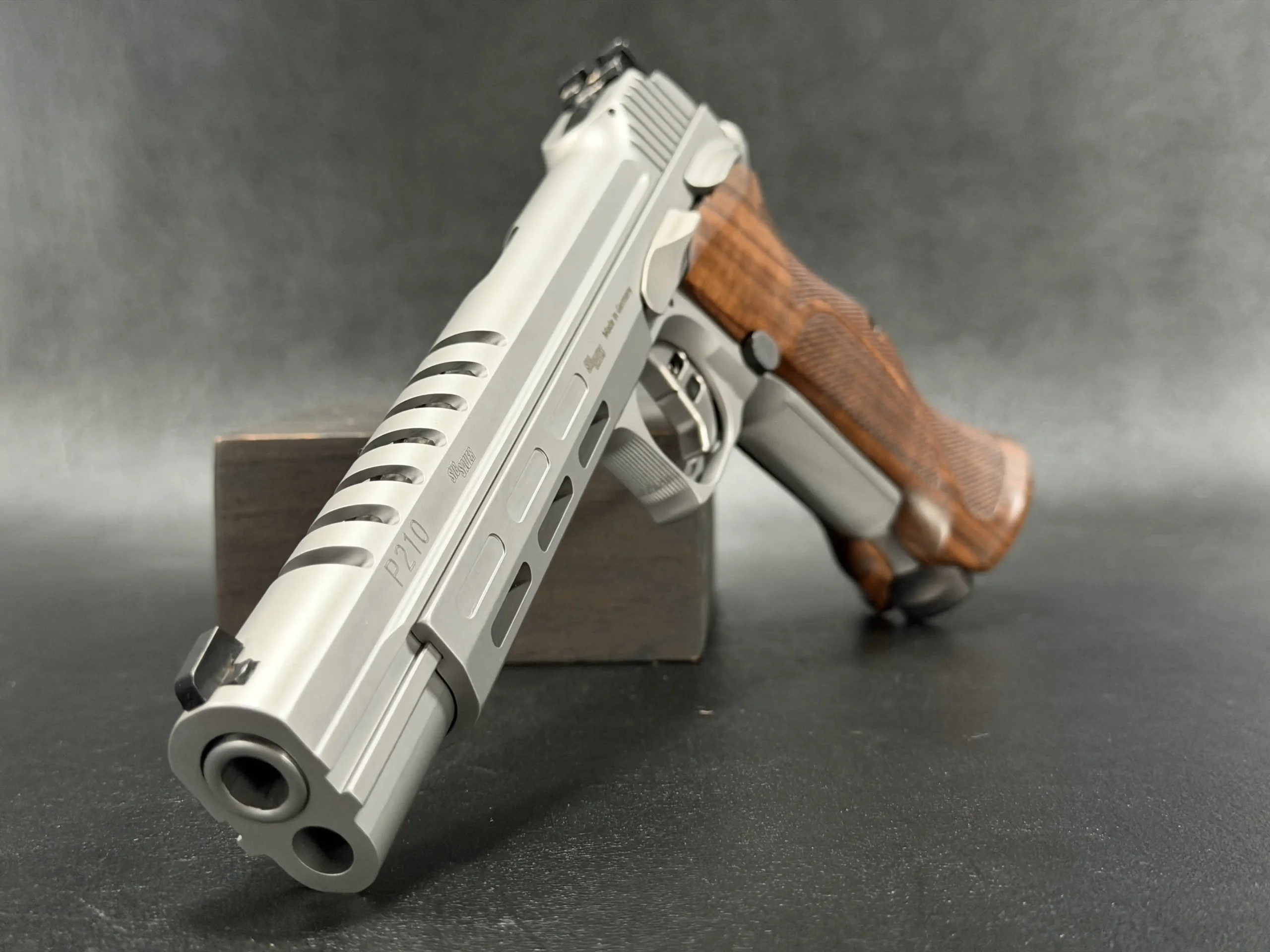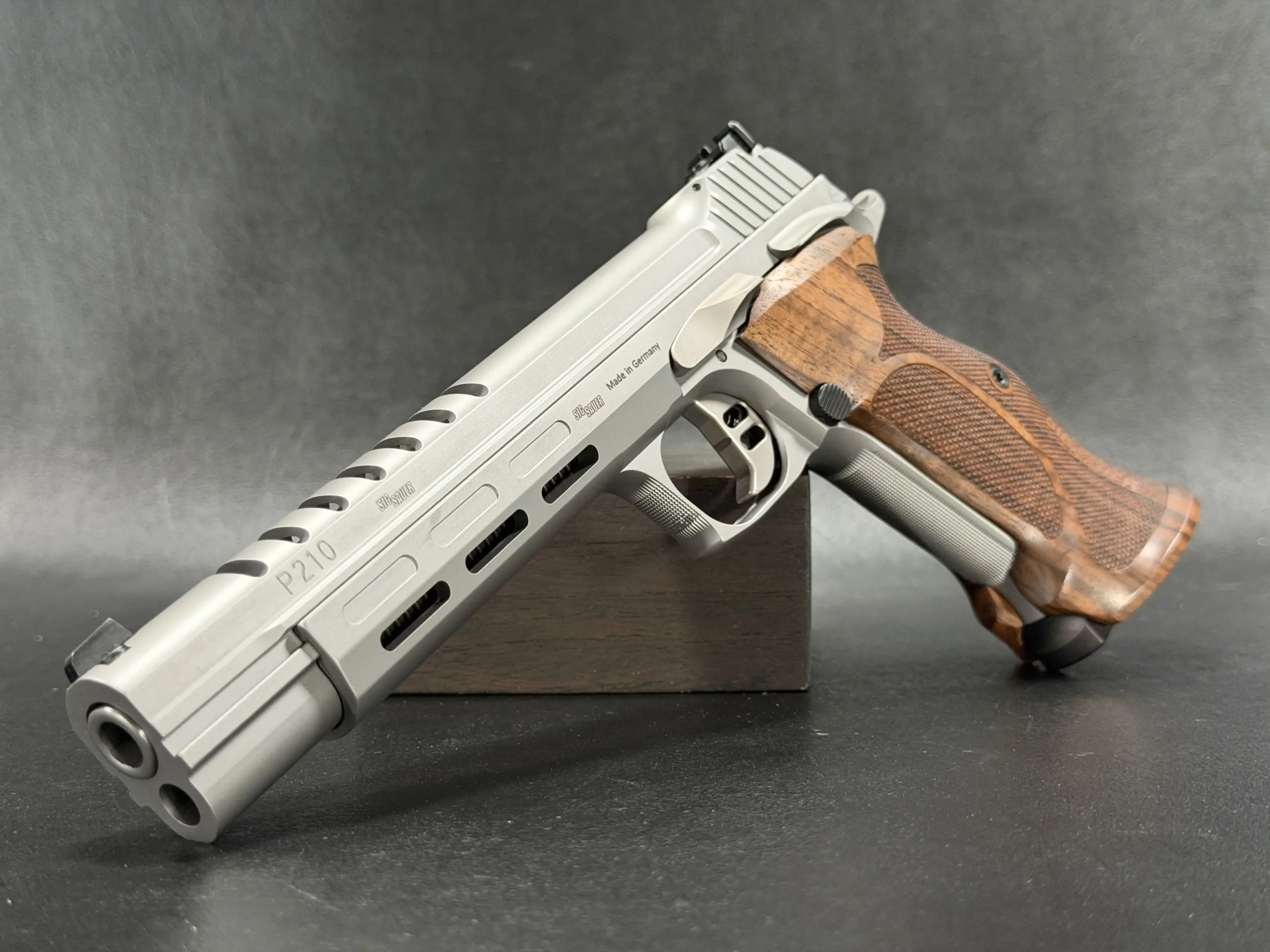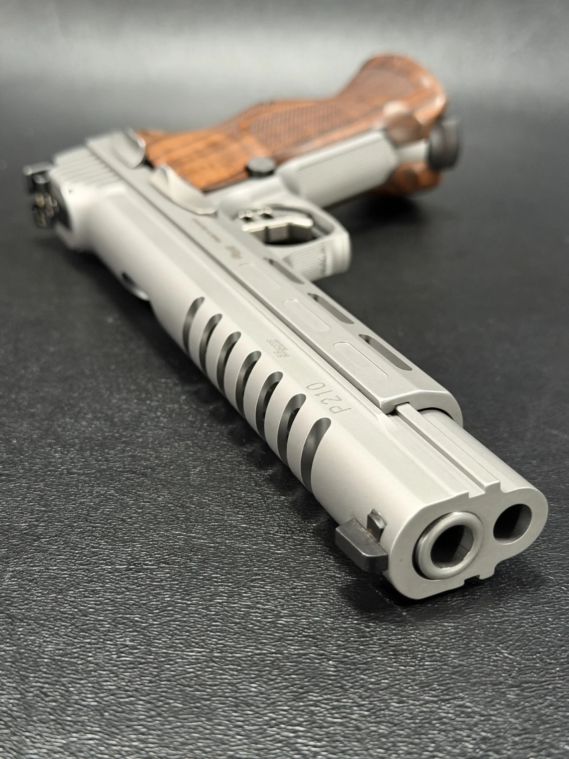 The finely contoured anatomical walnut target grips provide excellent support and natural pointability, complementing the pistol’s clean lines and mechanical elegance. The trigger is crisp and predictable, reflecting the P210’s reputation for outstanding shootability and mechanical refinement. Adjustable target sights complete the package, making this pistol as capable on the range as it is impressive in a collection.