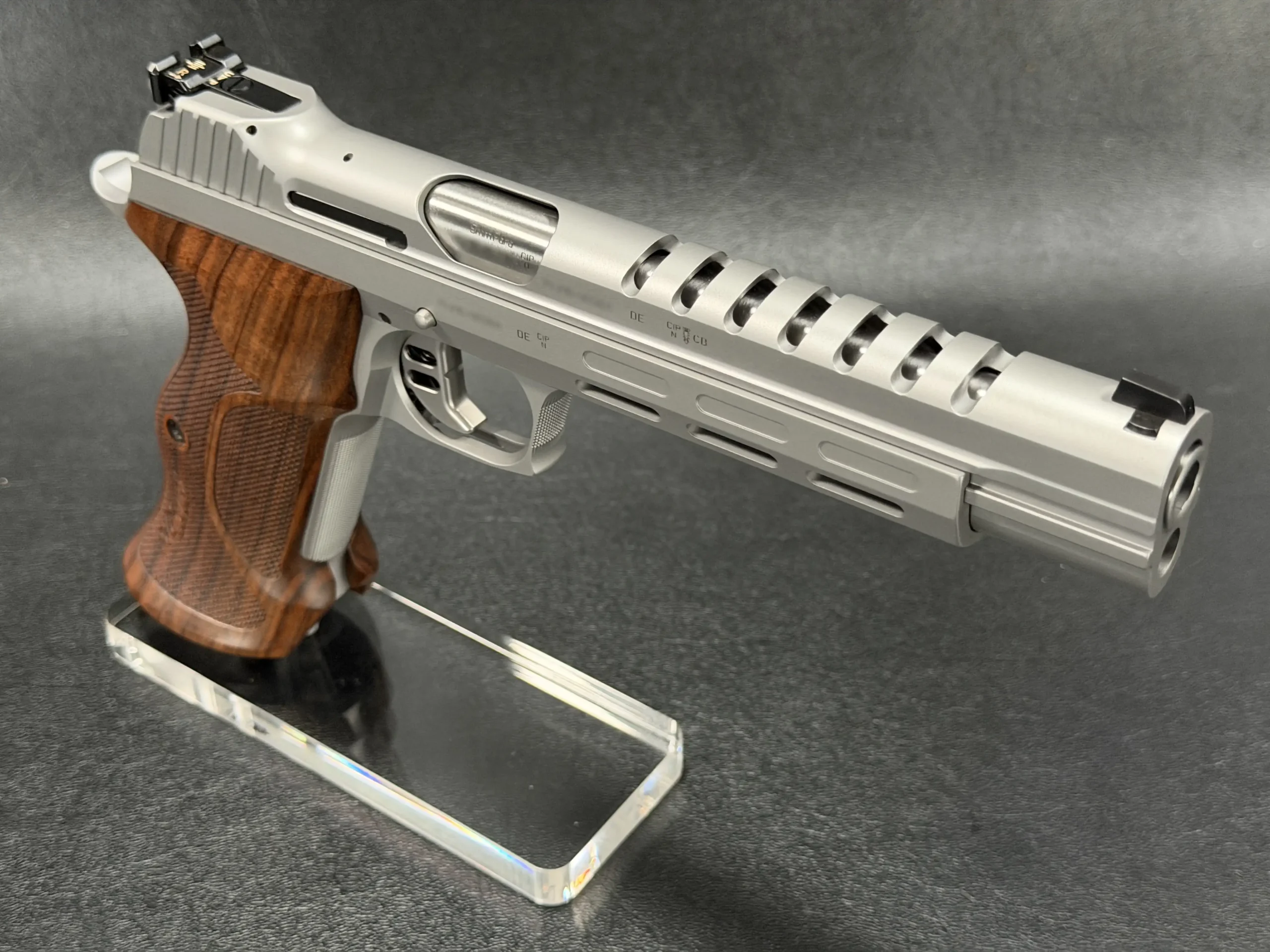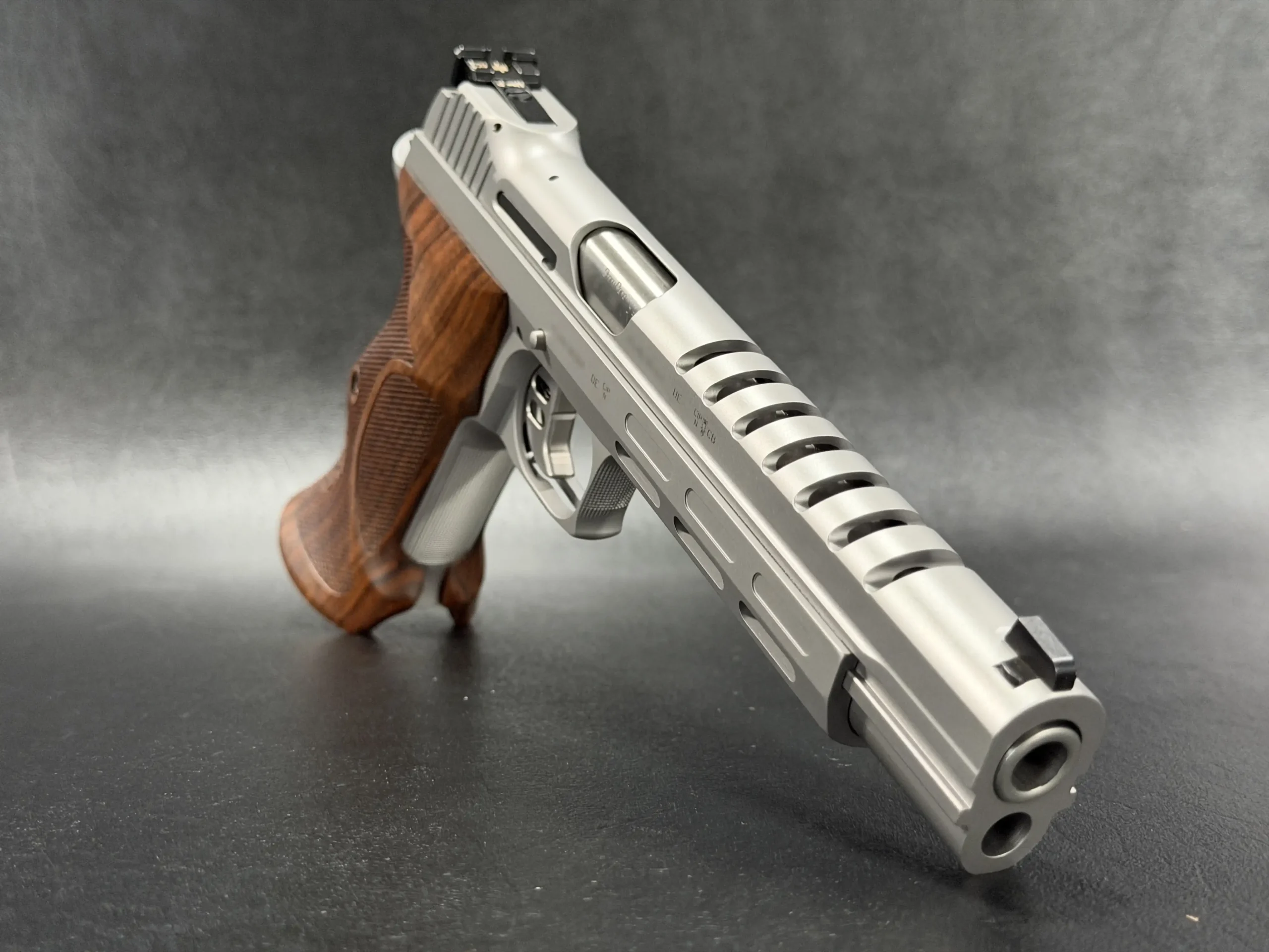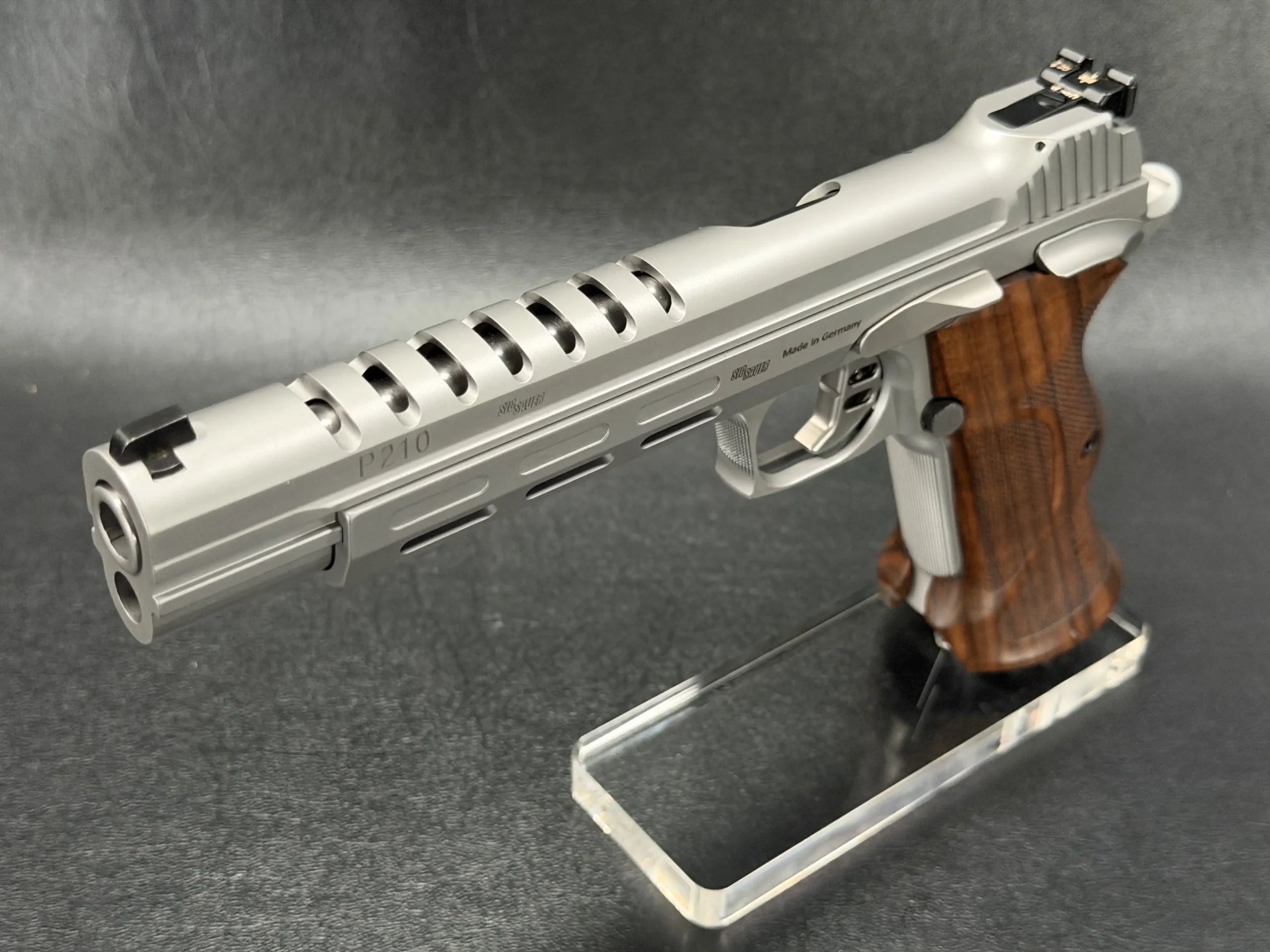 The finely contoured anatomical walnut target grips provide excellent support and natural pointability, complementing the pistol’s clean lines and mechanical elegance. The trigger is crisp and predictable, reflecting the P210’s reputation for outstanding shootability and mechanical refinement. Adjustable target sights complete the package, making this pistol as capable on the range as it is impressive in a collection.