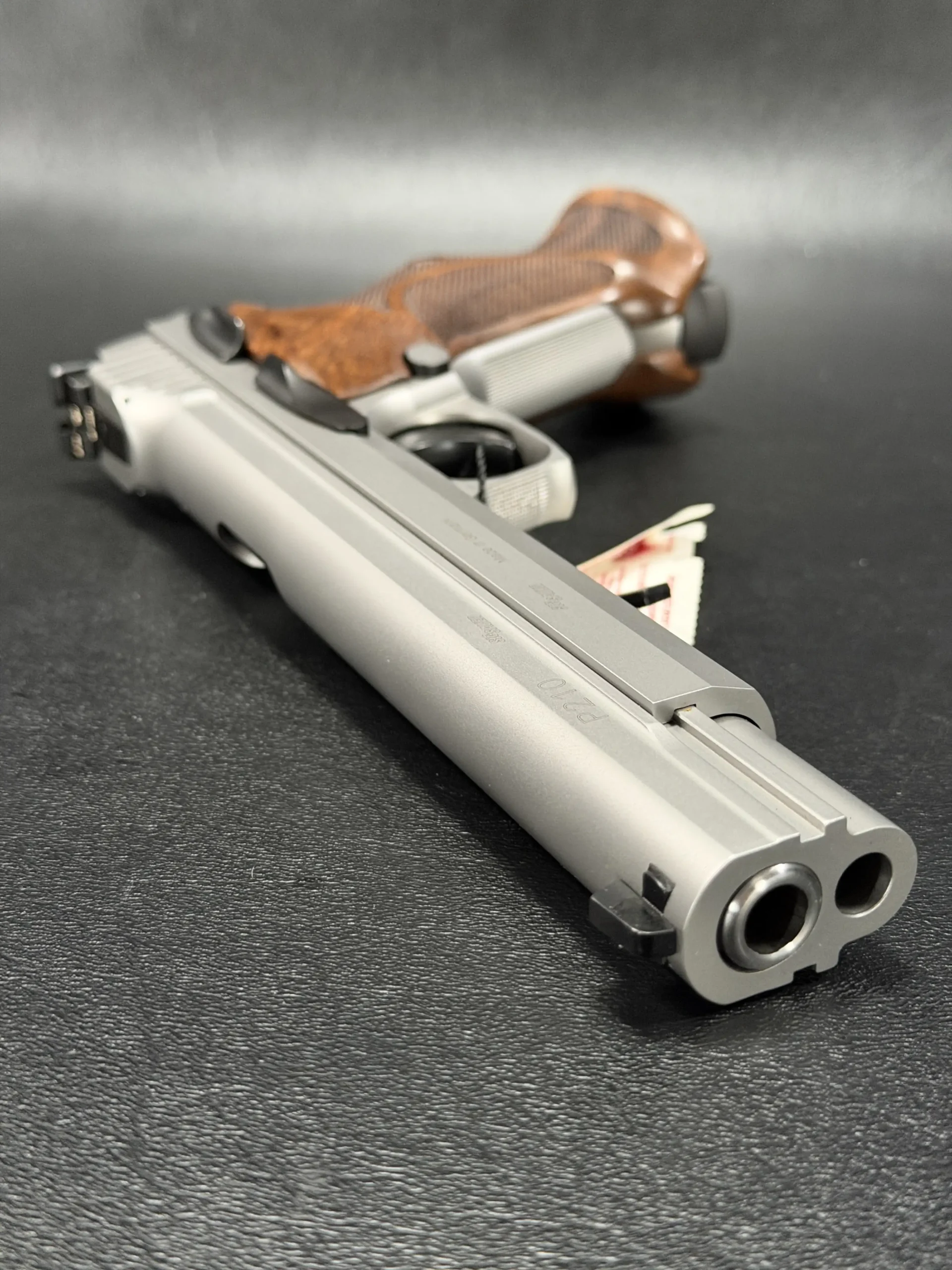 The walnut target grips bring warmth and sculpted ergonomics to the stainless frame. They don’t just look refined; they anchor the pistol in the hand, giving you the kind of stability and control that the P210 lineage is famous for. This Super Target runs in single-action only, with a break that feels almost impossibly crisp. It’s the sort of trigger that makes you want to slow down and savor each press.