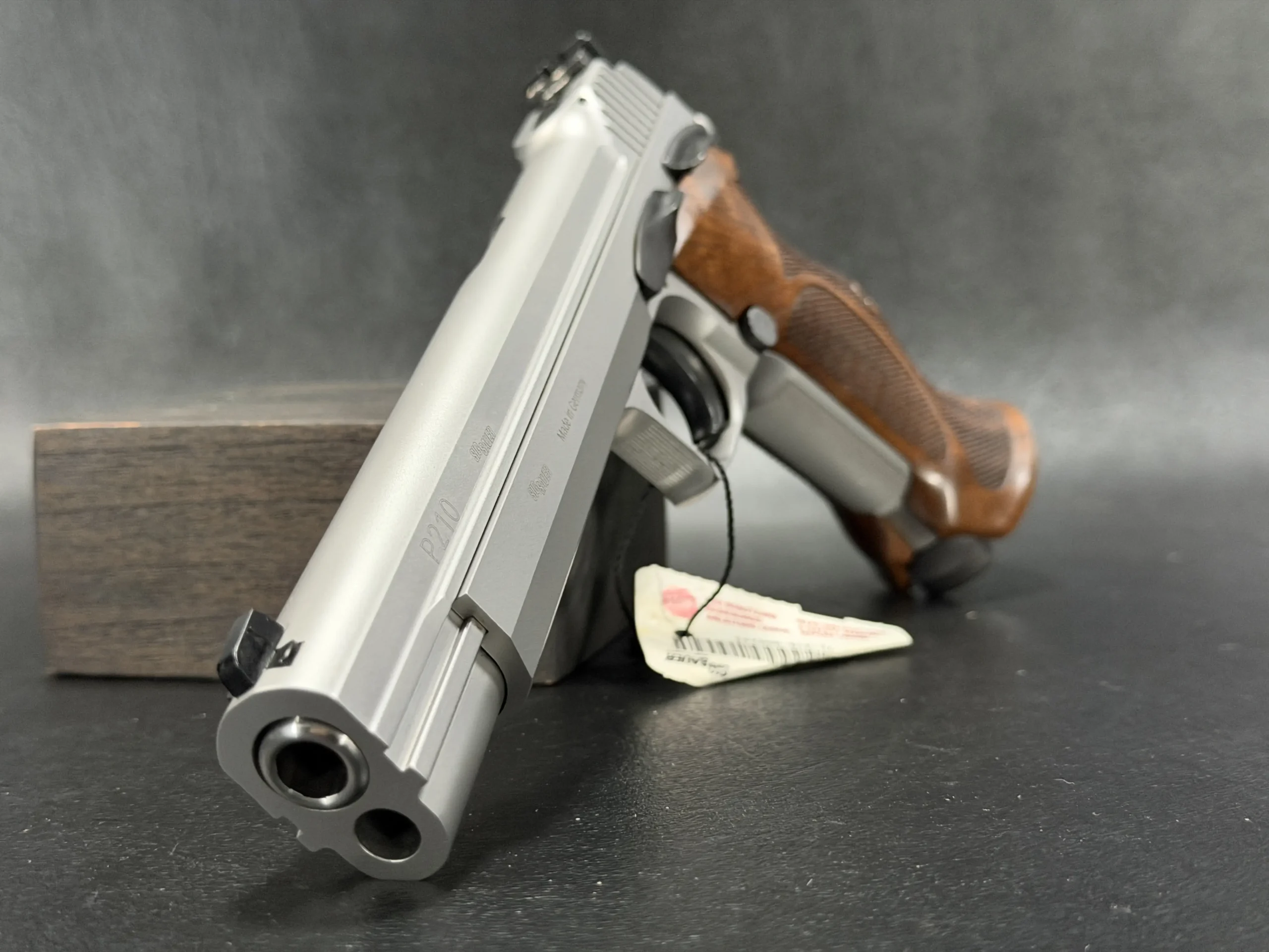 The walnut target grips bring warmth and sculpted ergonomics to the stainless frame. They don’t just look refined—they anchor the pistol in the hand, giving you the kind of stability and control that the P210 lineage is famous for. This Super Target runs in single-action only, with a break that feels almost impossibly crisp. It’s the sort of trigger that makes you want to slow down and savor each press.