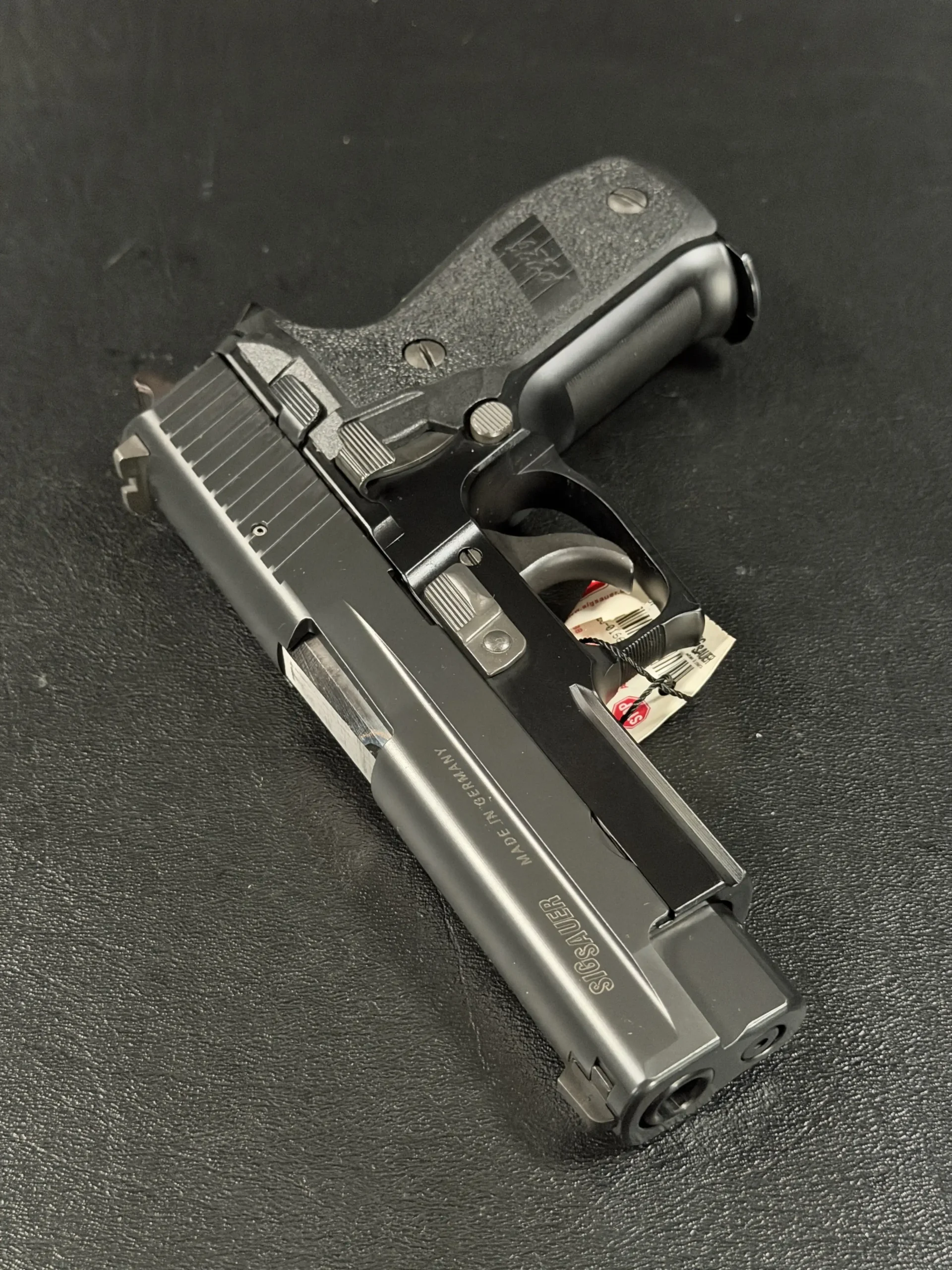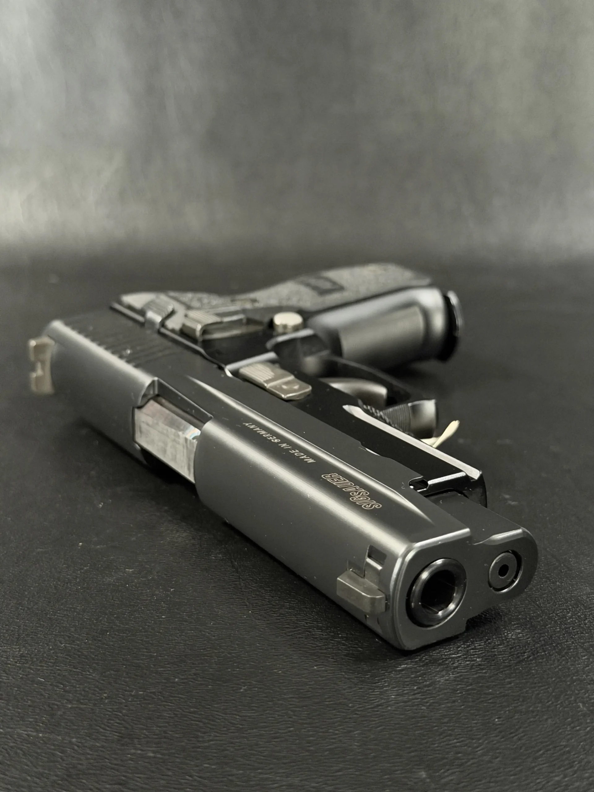 Visually, the pistol carries the restrained industrial aesthetic for which German SIGs are known. The slide finish contrasts subtly against the frame, with crisp markings and well-executed machining visible throughout. The original-style grips complete the package, giving the pistol a purposeful, no-nonsense profile that feels just as relevant today as when it left the factory.