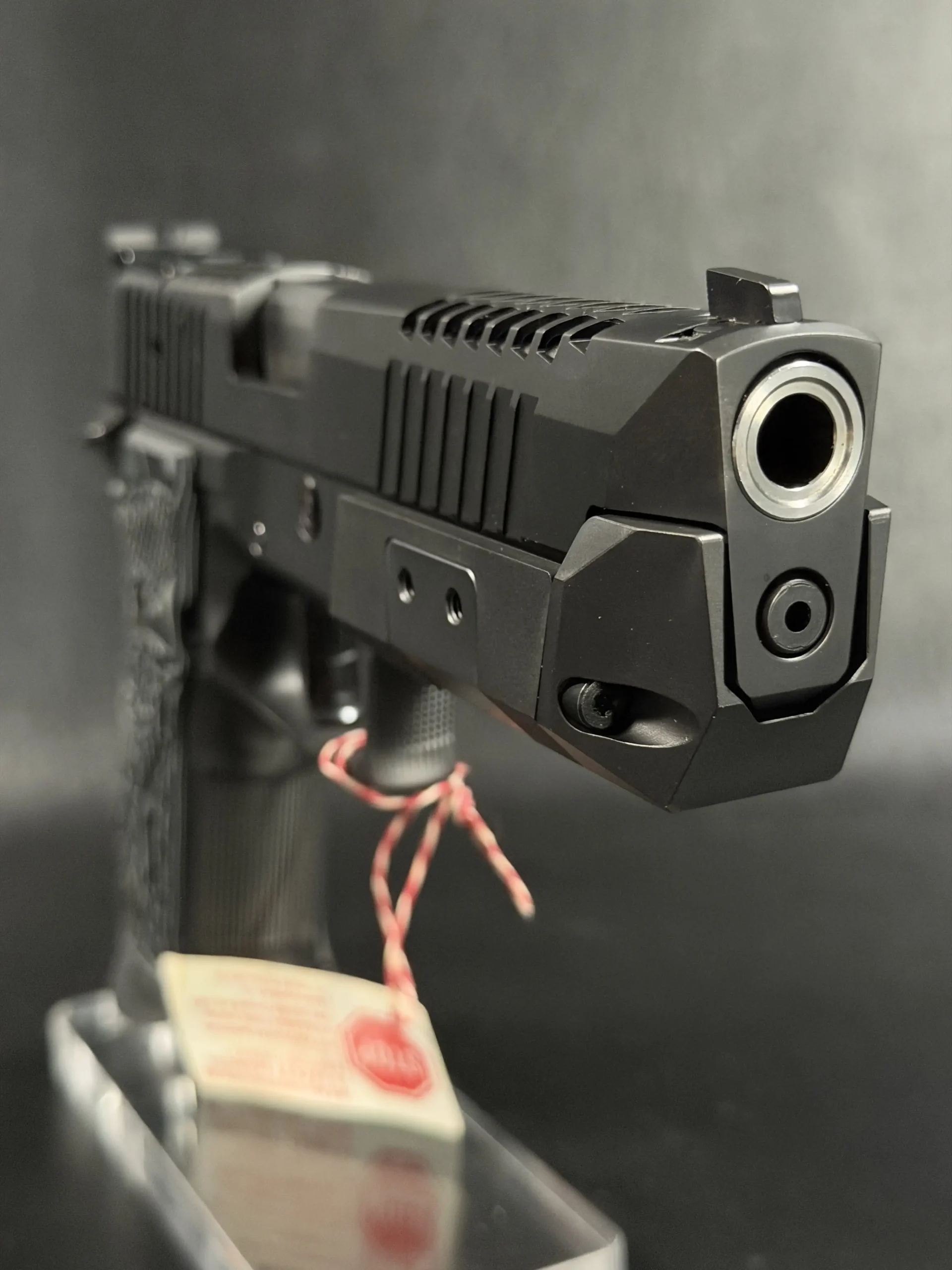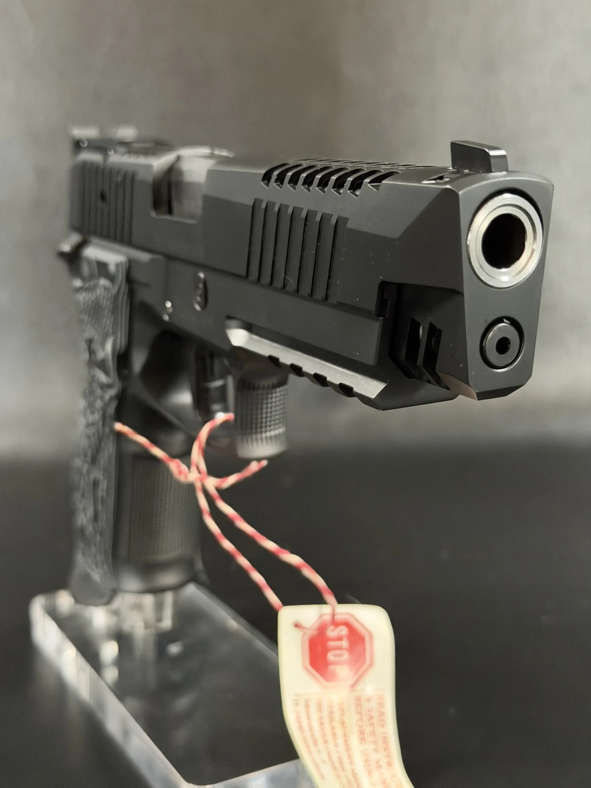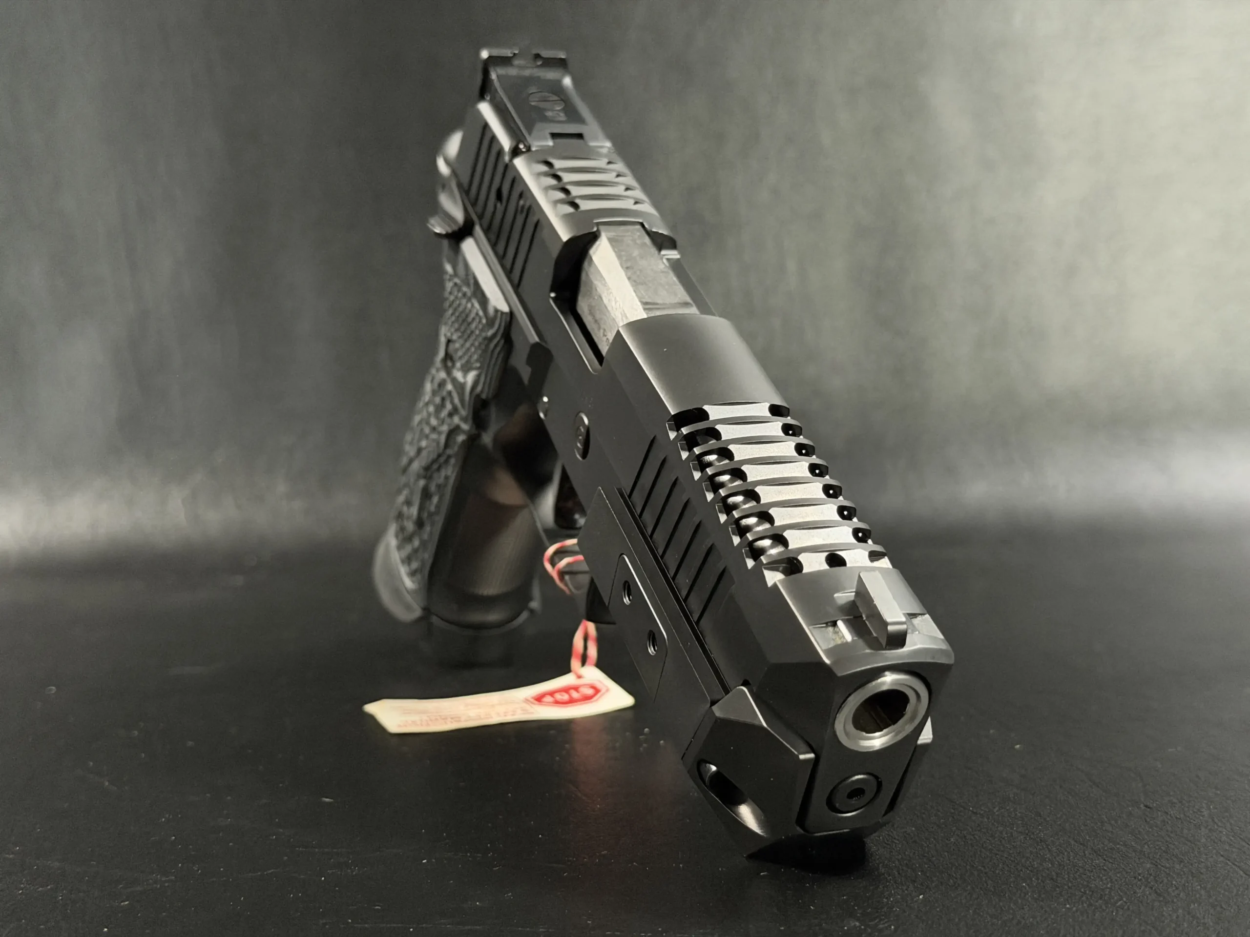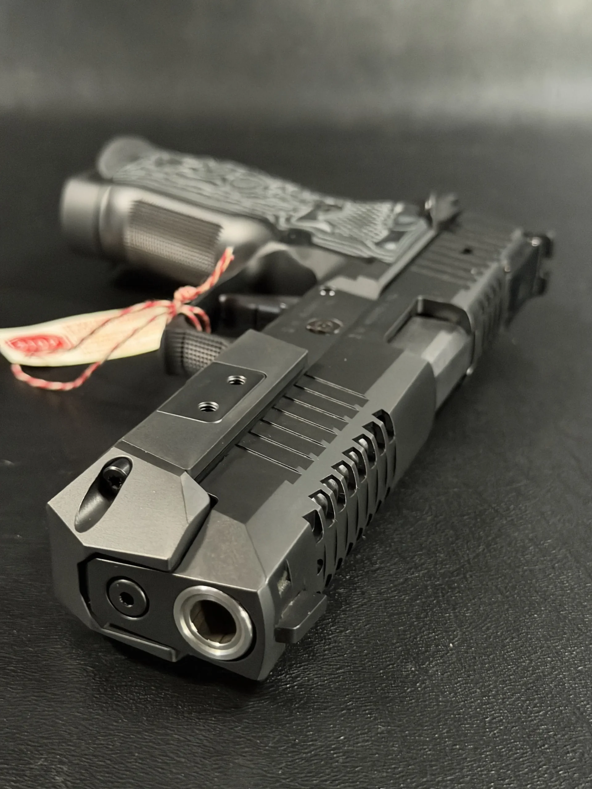 Finished in a deep black tone, the pistol features a skeletonized slide and frame that balance visual drama with functional intent. Material is strategically removed to reduce reciprocating mass while maintaining rigidity, resulting in a pistol that feels exceptionally composed during recoil and rapid shot strings. The factory front weight adds forward balance, helping the pistol settle naturally on target and track flat under fire.