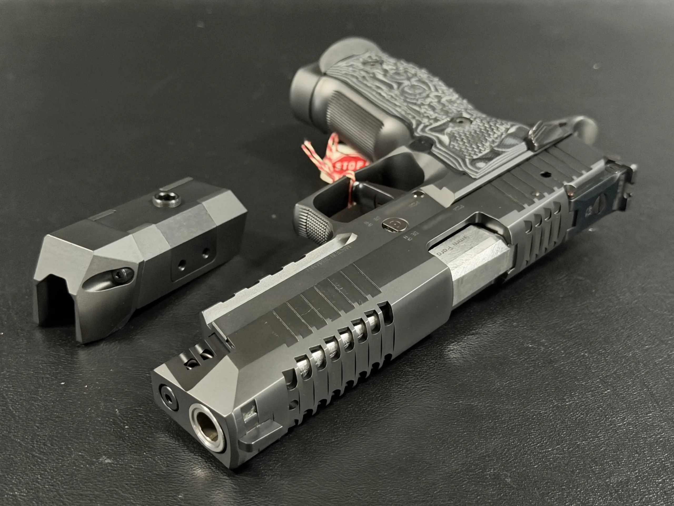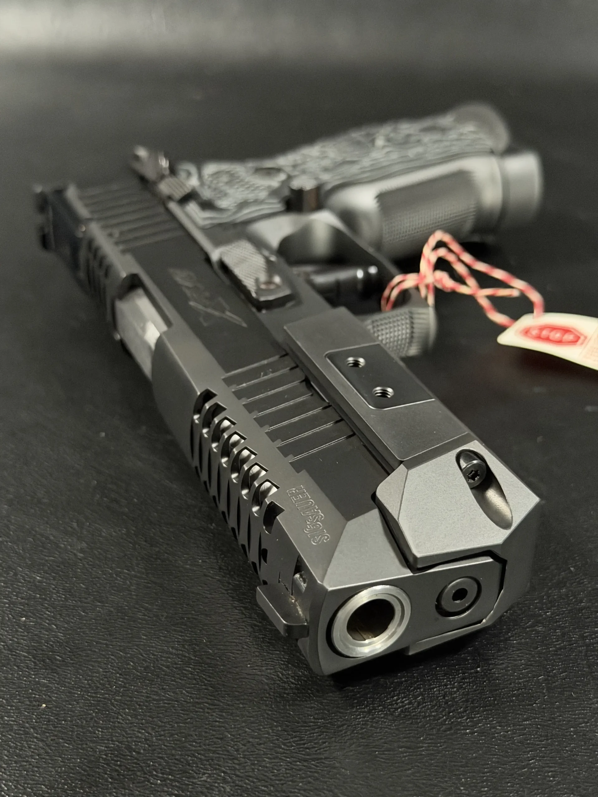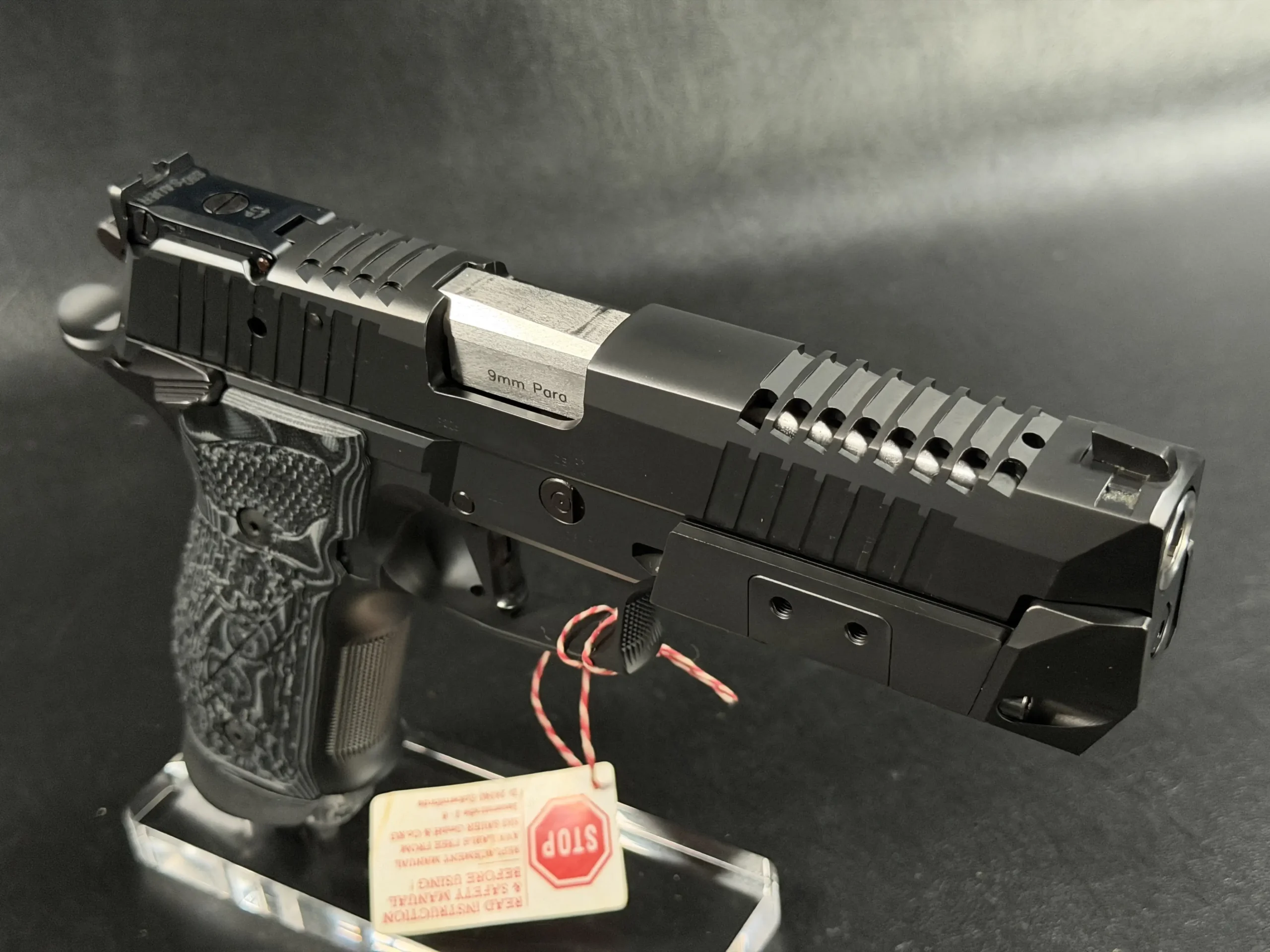 Finished in a deep black tone, the pistol features a skeletonized slide and frame that balance visual drama with functional intent. Material is strategically removed to reduce reciprocating mass while maintaining rigidity, resulting in a pistol that feels exceptionally composed during recoil and rapid shot strings. The factory front weight adds forward balance, helping the pistol settle naturally on target and track flat under fire.