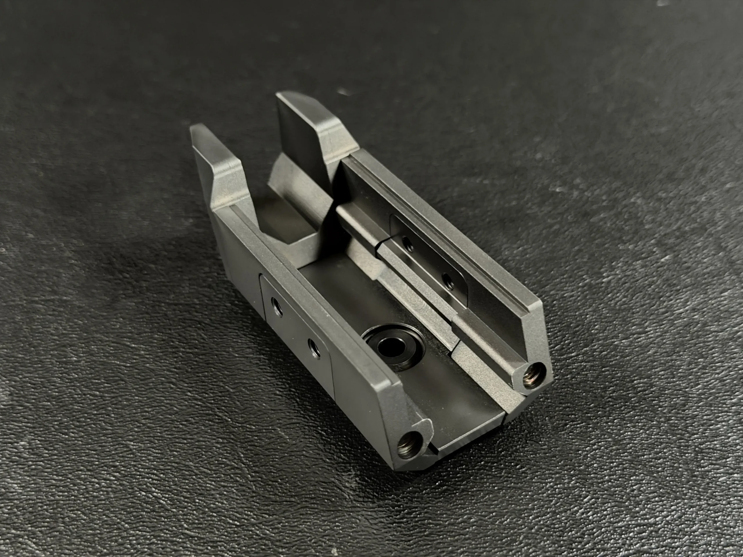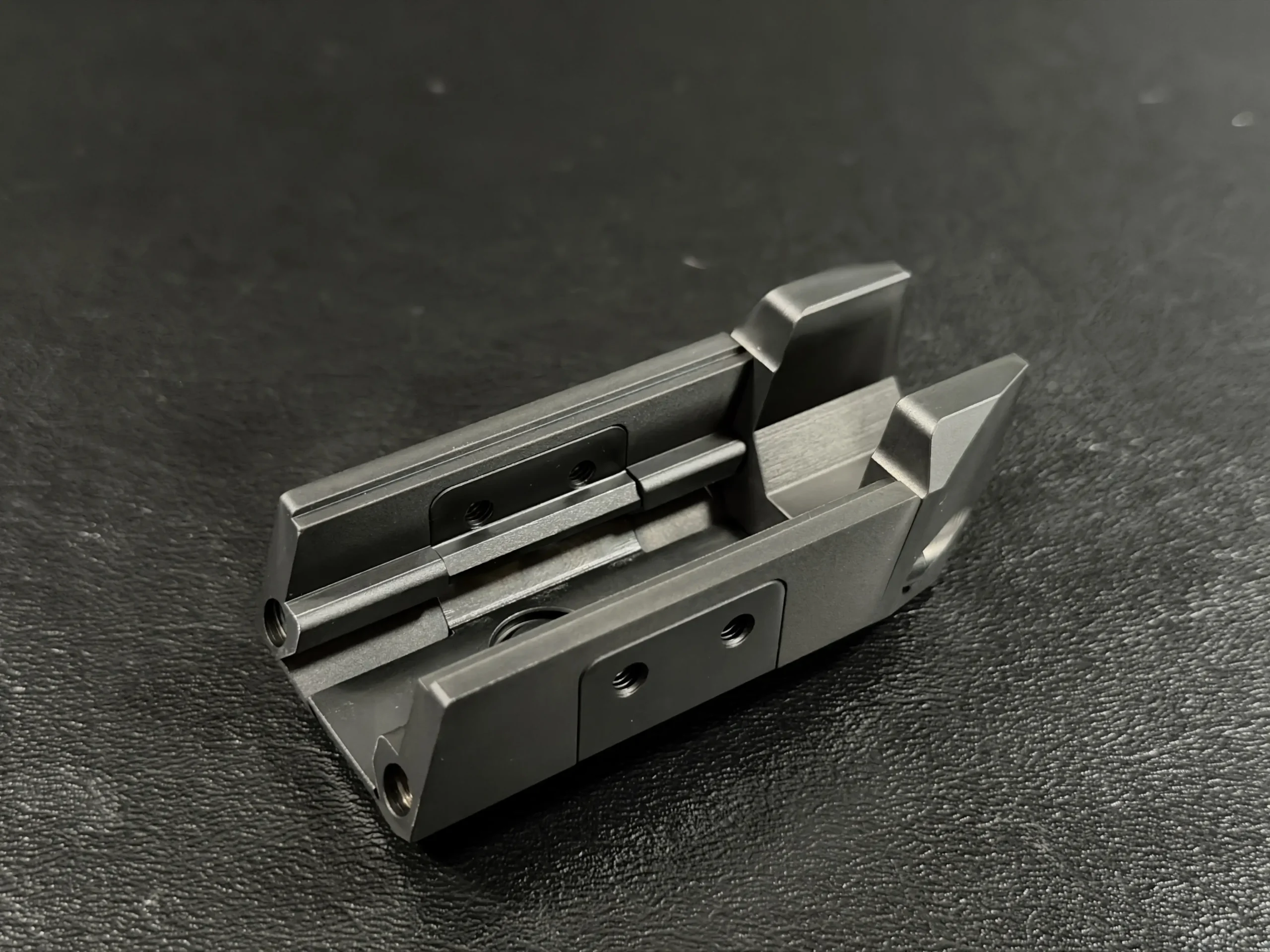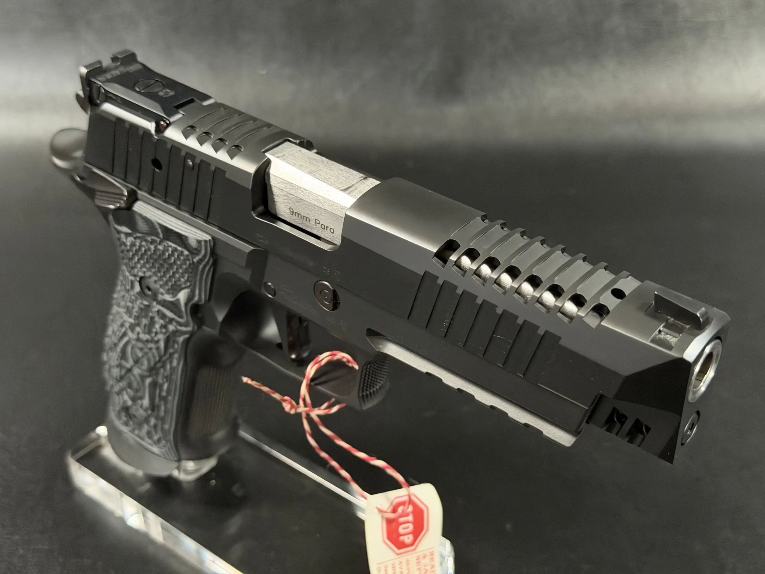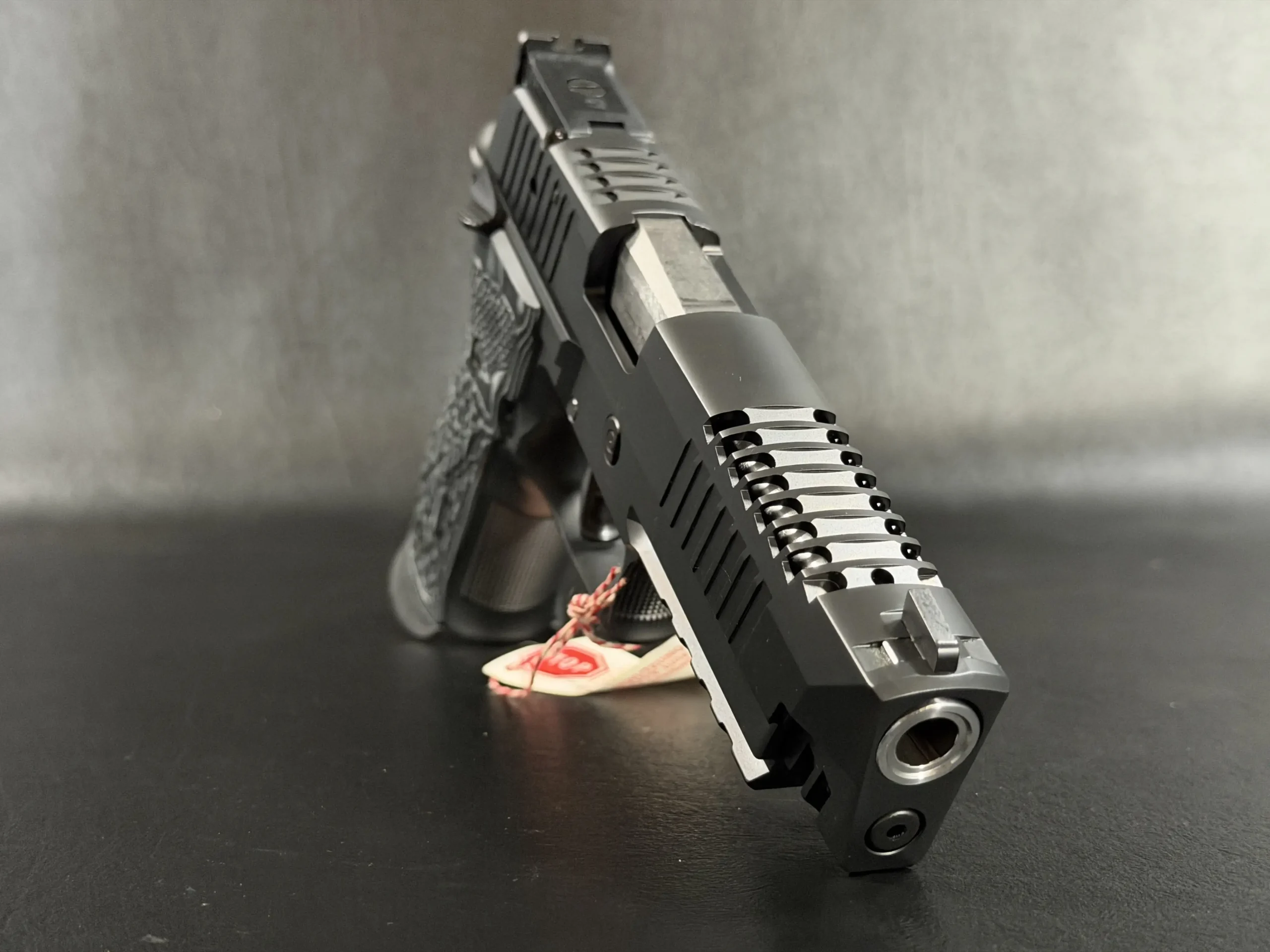 Finished in a deep black tone, the pistol features a skeletonized slide and frame that balance visual drama with functional intent. Material is strategically removed to reduce reciprocating mass while maintaining rigidity, resulting in a pistol that feels exceptionally composed during recoil and rapid shot strings. The factory front weight adds forward balance, helping the pistol settle naturally on target and track flat under fire.