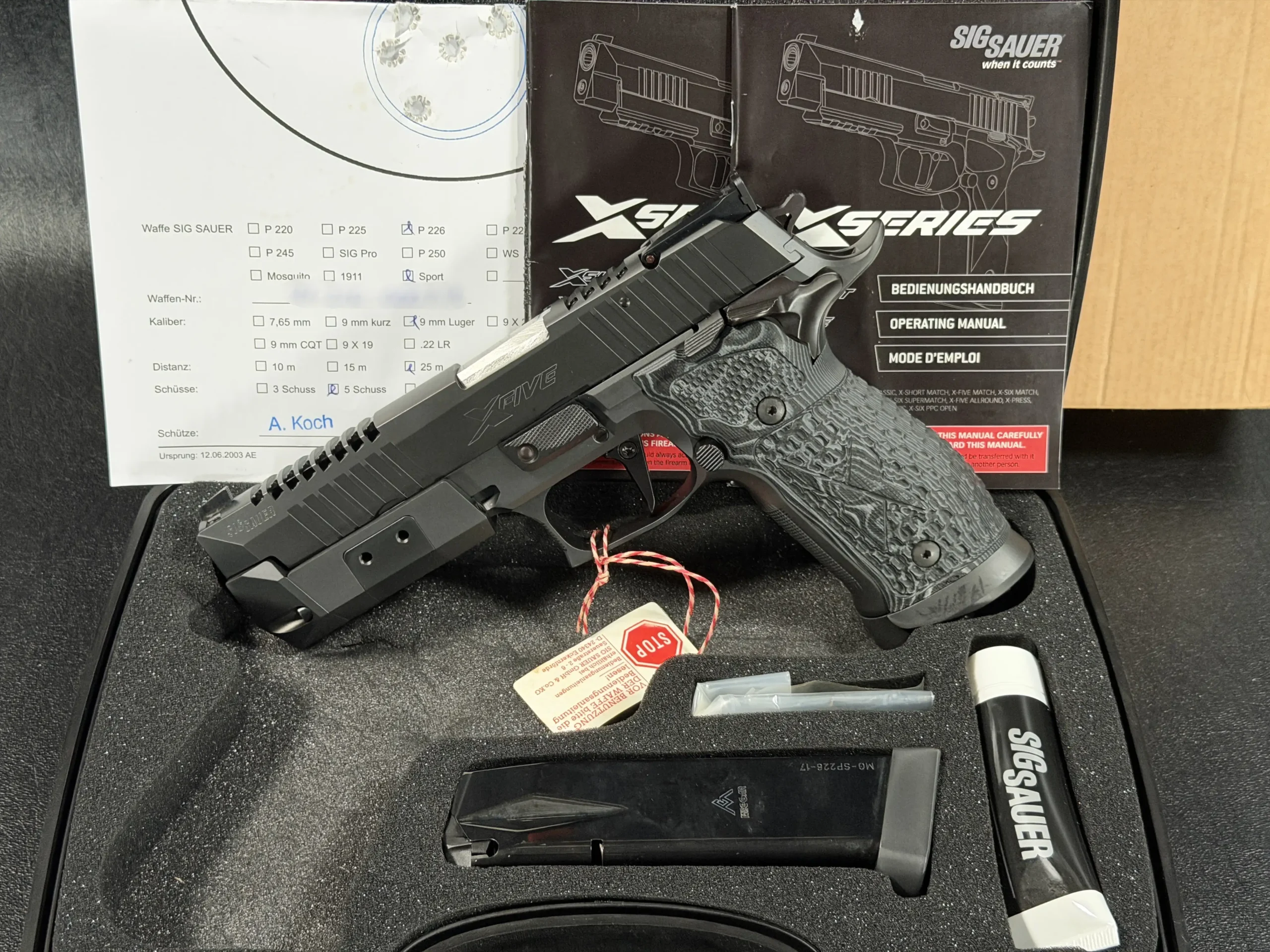 This SIG Sauer P226 X-Five Supermatch Skeleton represents the peak of SIG Sauer’s German-made competition pistols, where precision engineering, purposeful mass, and refined aesthetics converge. Built on the renowned X-Series platform, this example showcases the Supermatch configuration enhanced by factory skeletonization and the original removable front weight system.