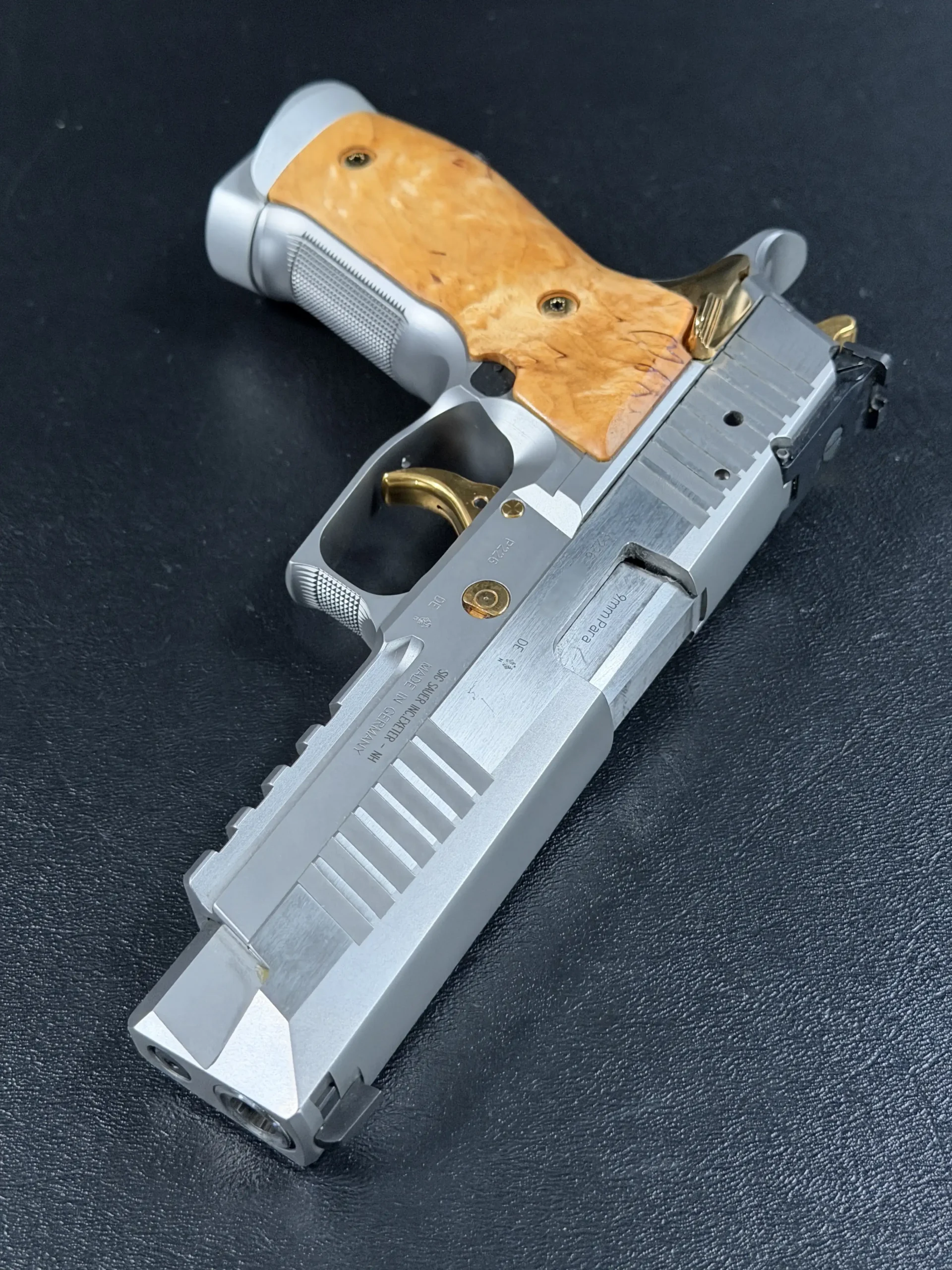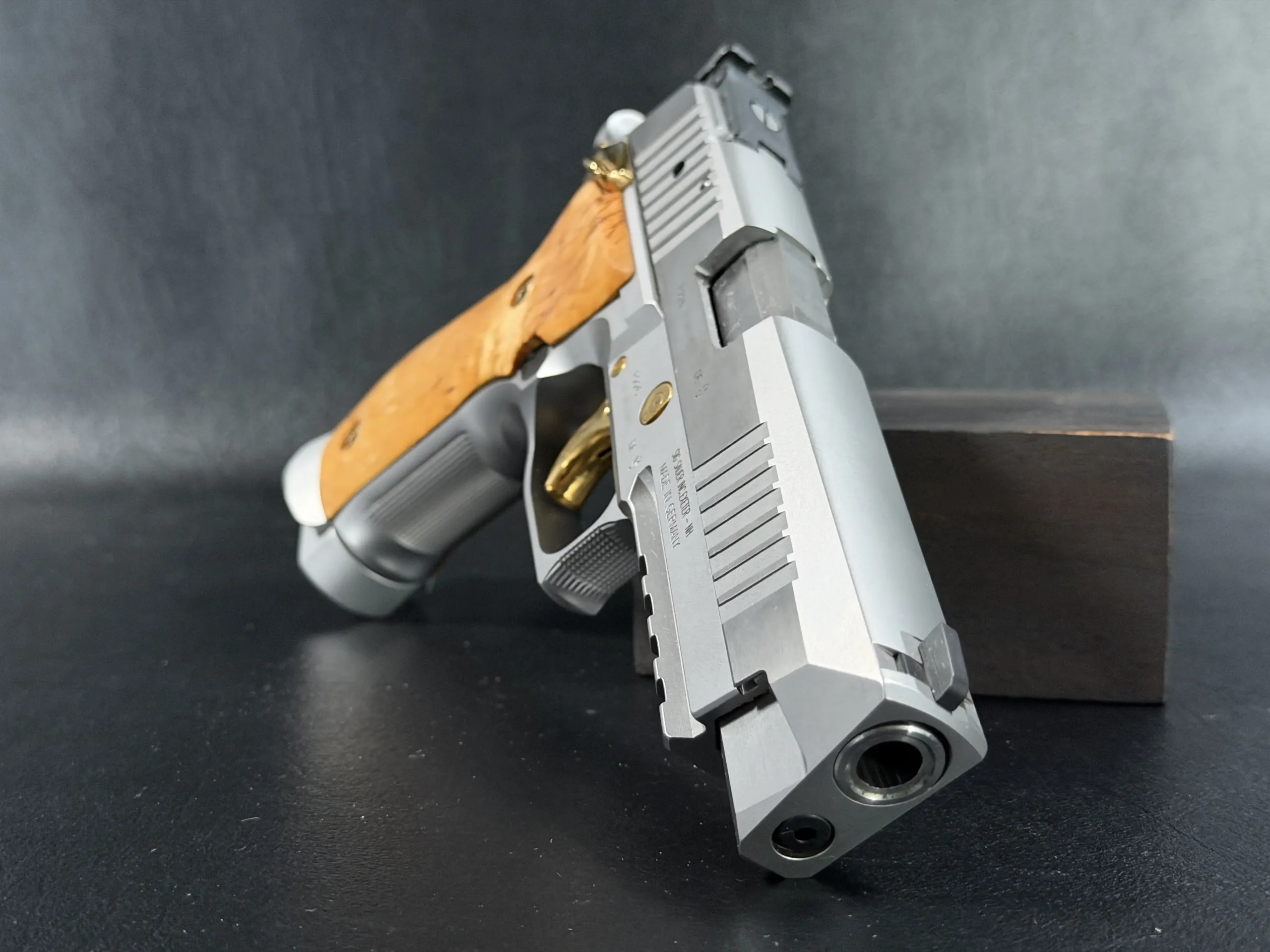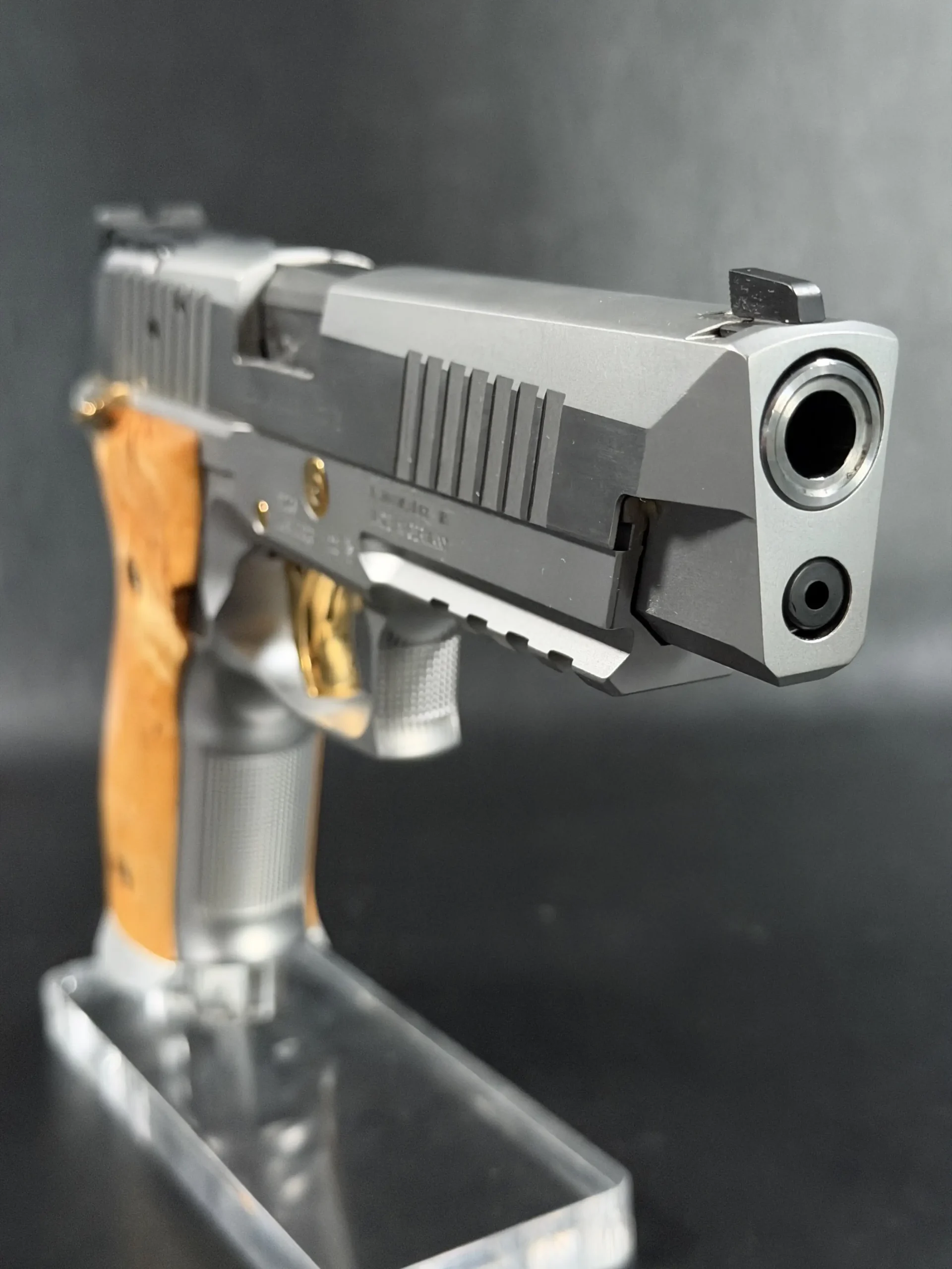 Natural wood grips complete the presentation, providing warmth and contrast against the metallic finishes while offering excellent ergonomics in the hand. Every control, surface, and transition reflects careful machining and hand-fitted precision, underscoring this pistol’s dual identity as both a serious shooter and a collector-grade piece.