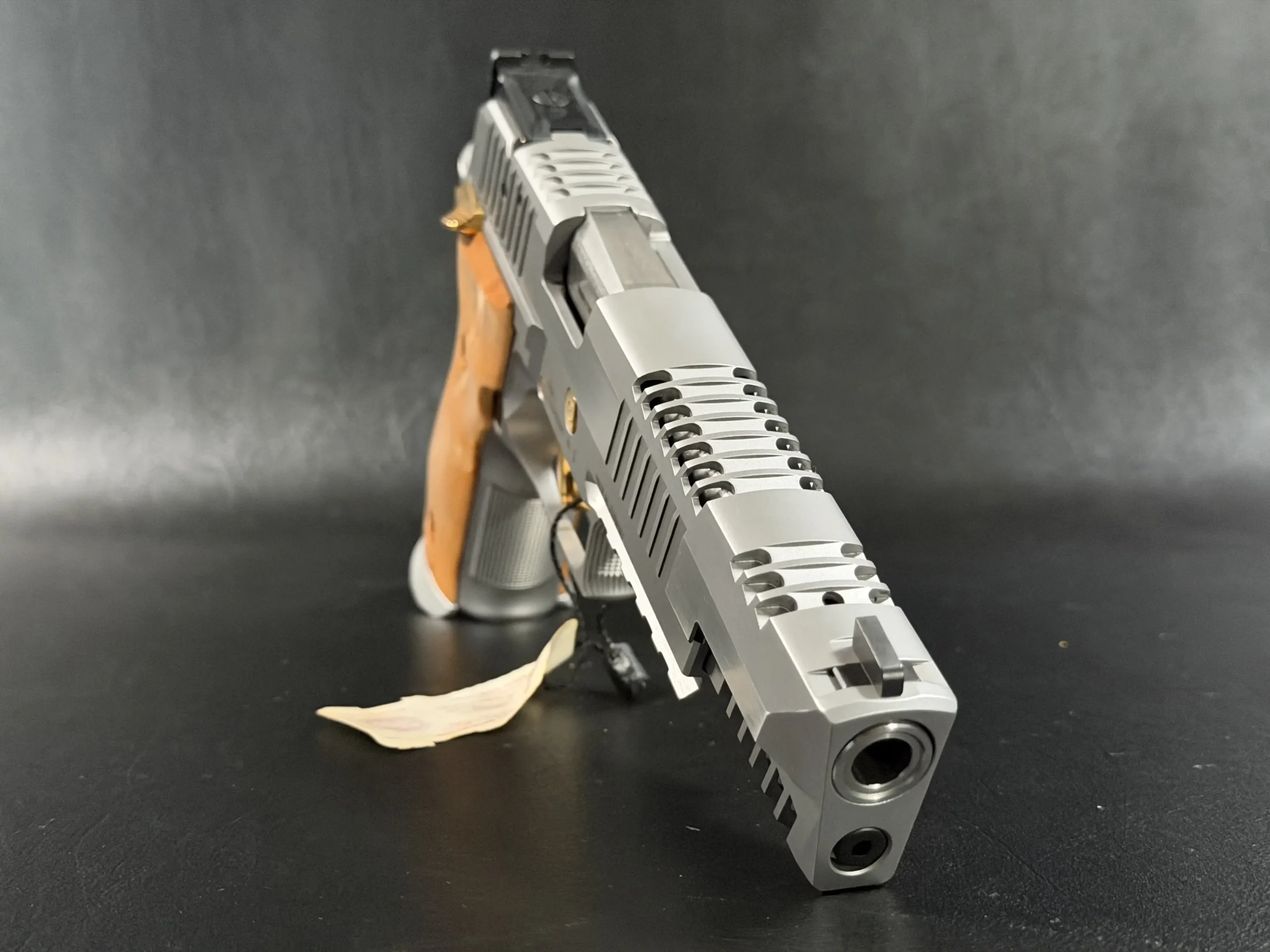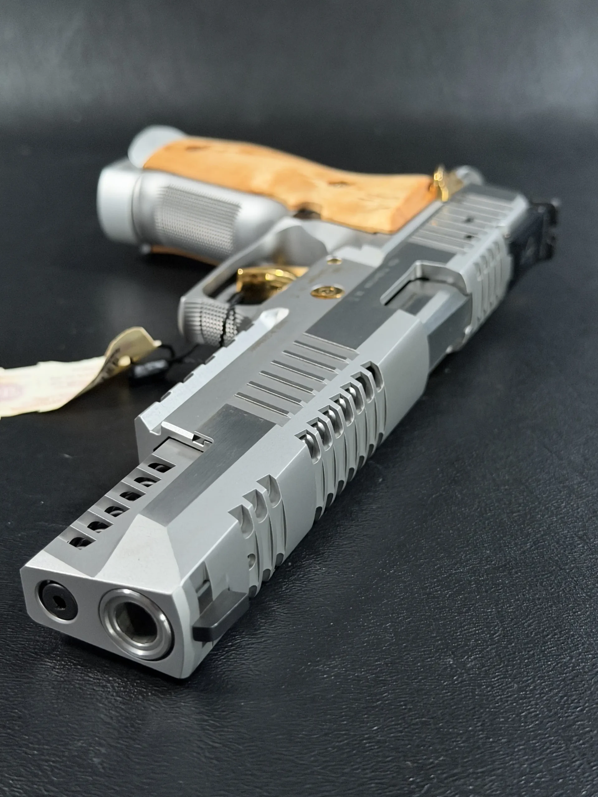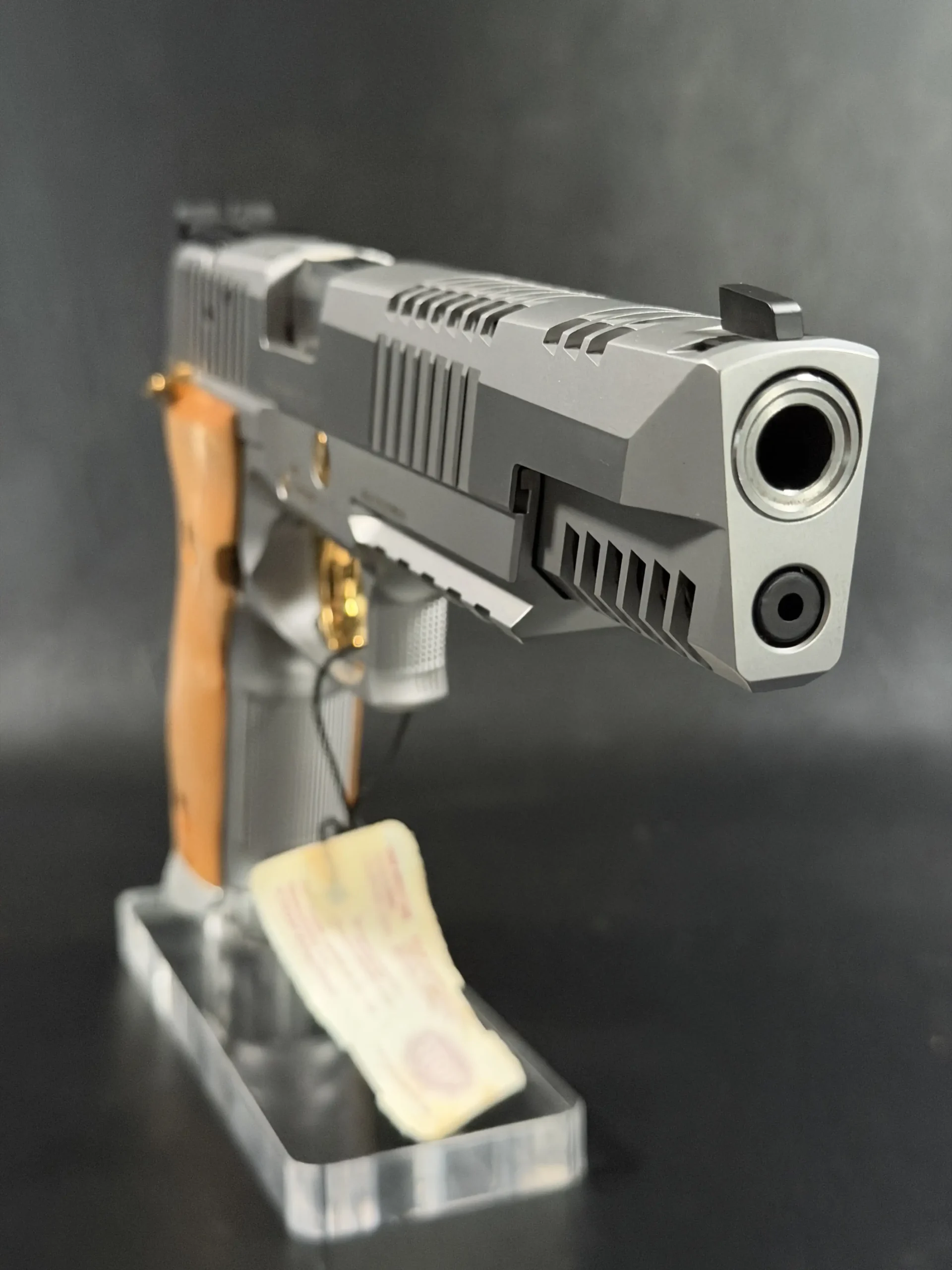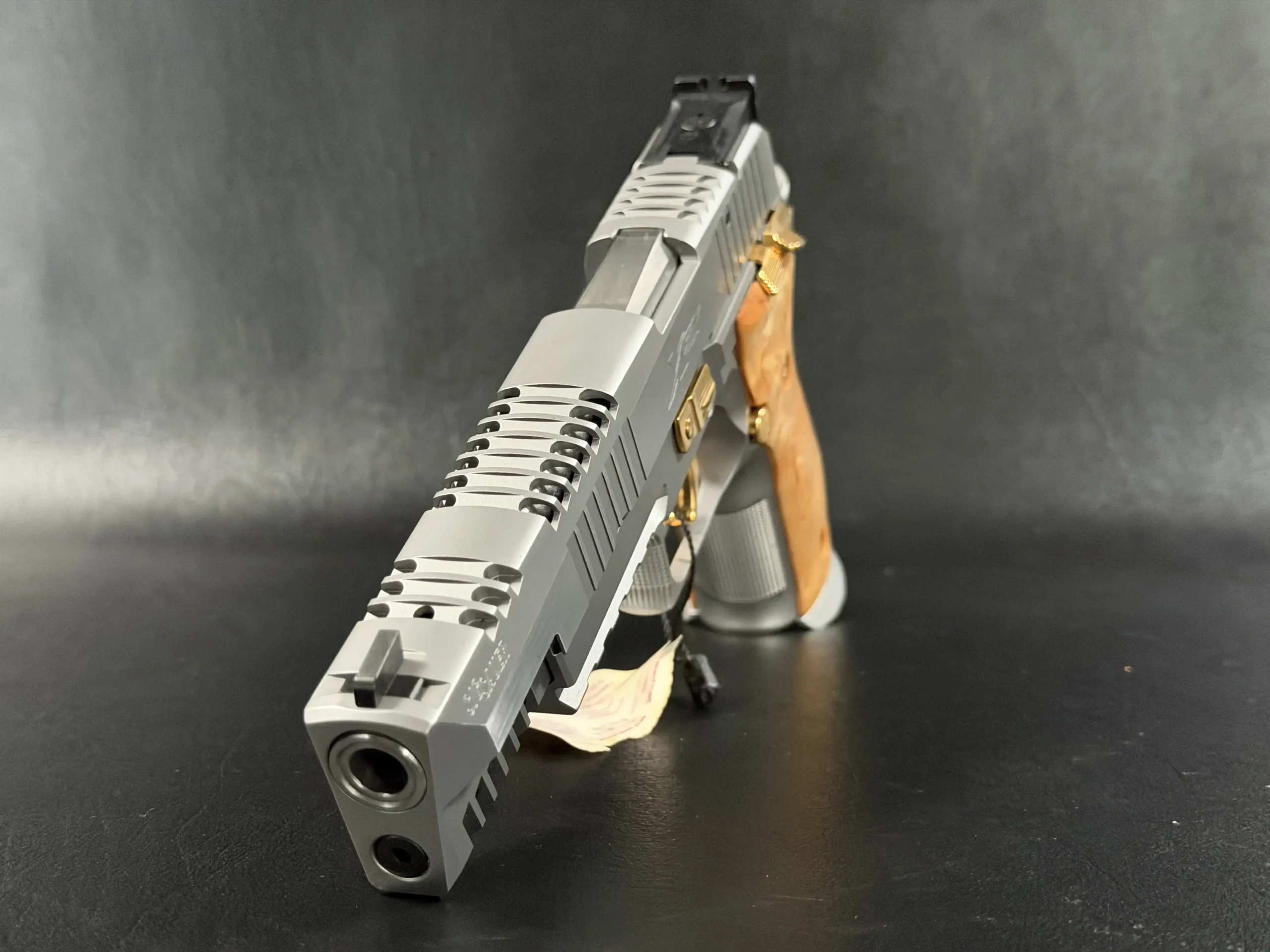 Gold-tone controls, including the trigger, safety, takedown lever, and hammer, provide a striking contrast against the matte stainless finish. These accents are not decorative afterthoughts; they are integral components, precisely fitted and perfectly balanced, reinforcing the pistol’s premium character.