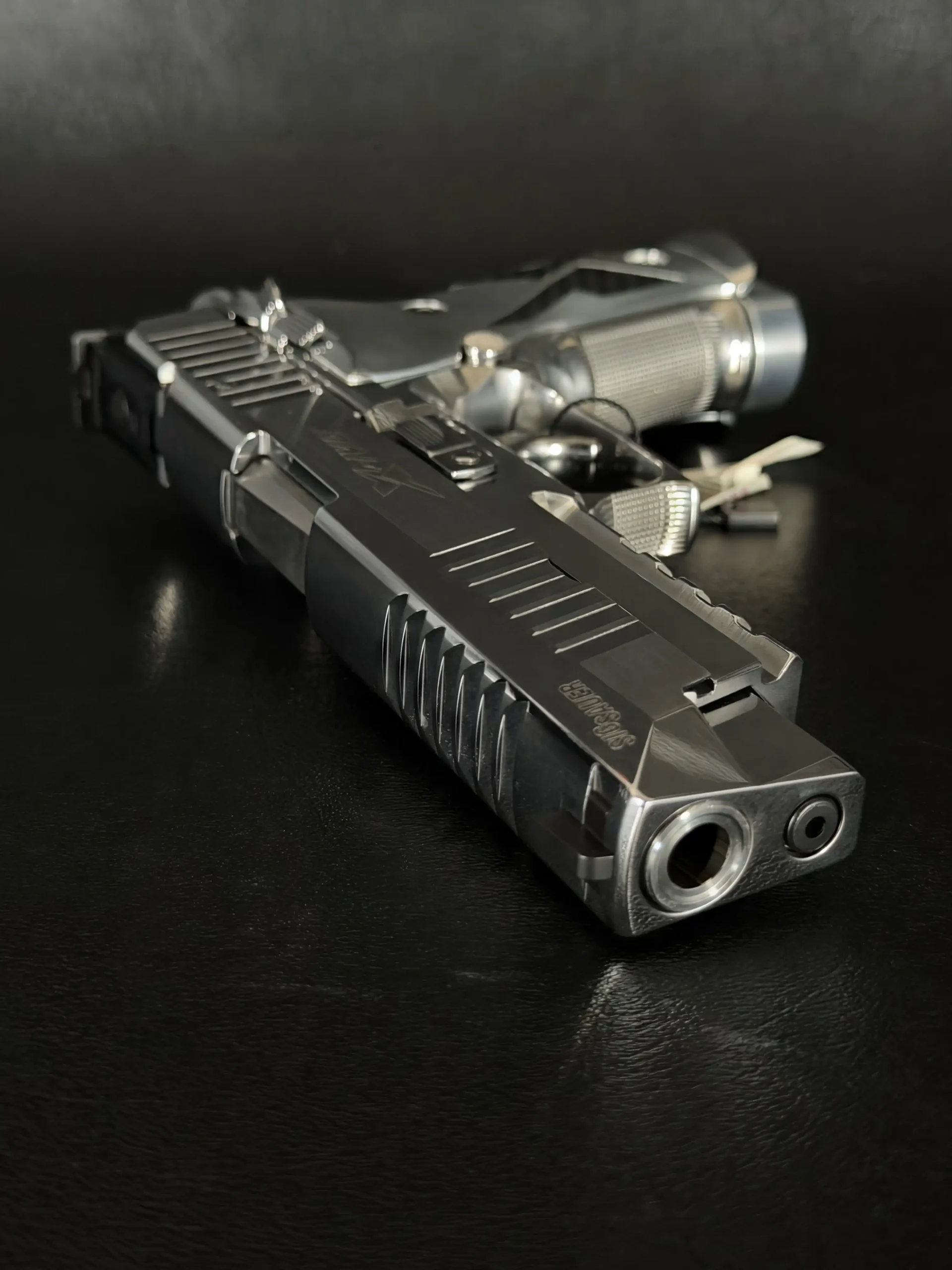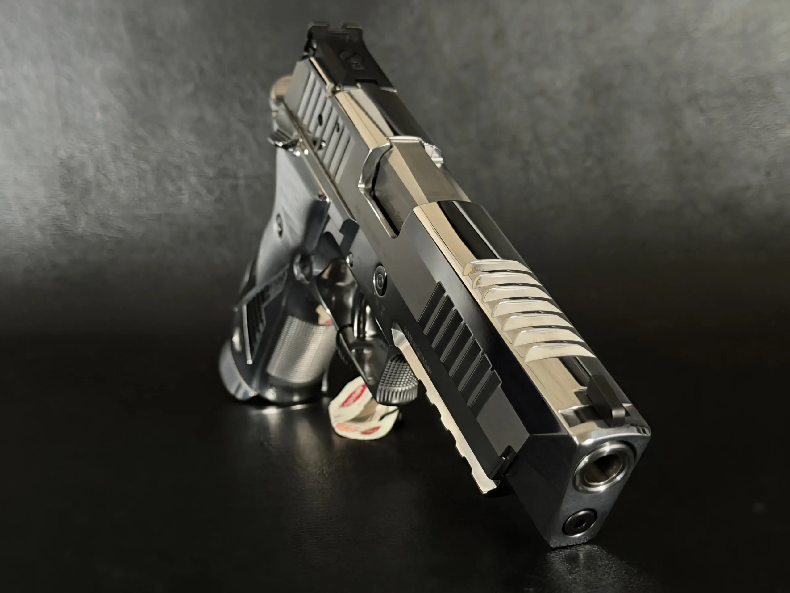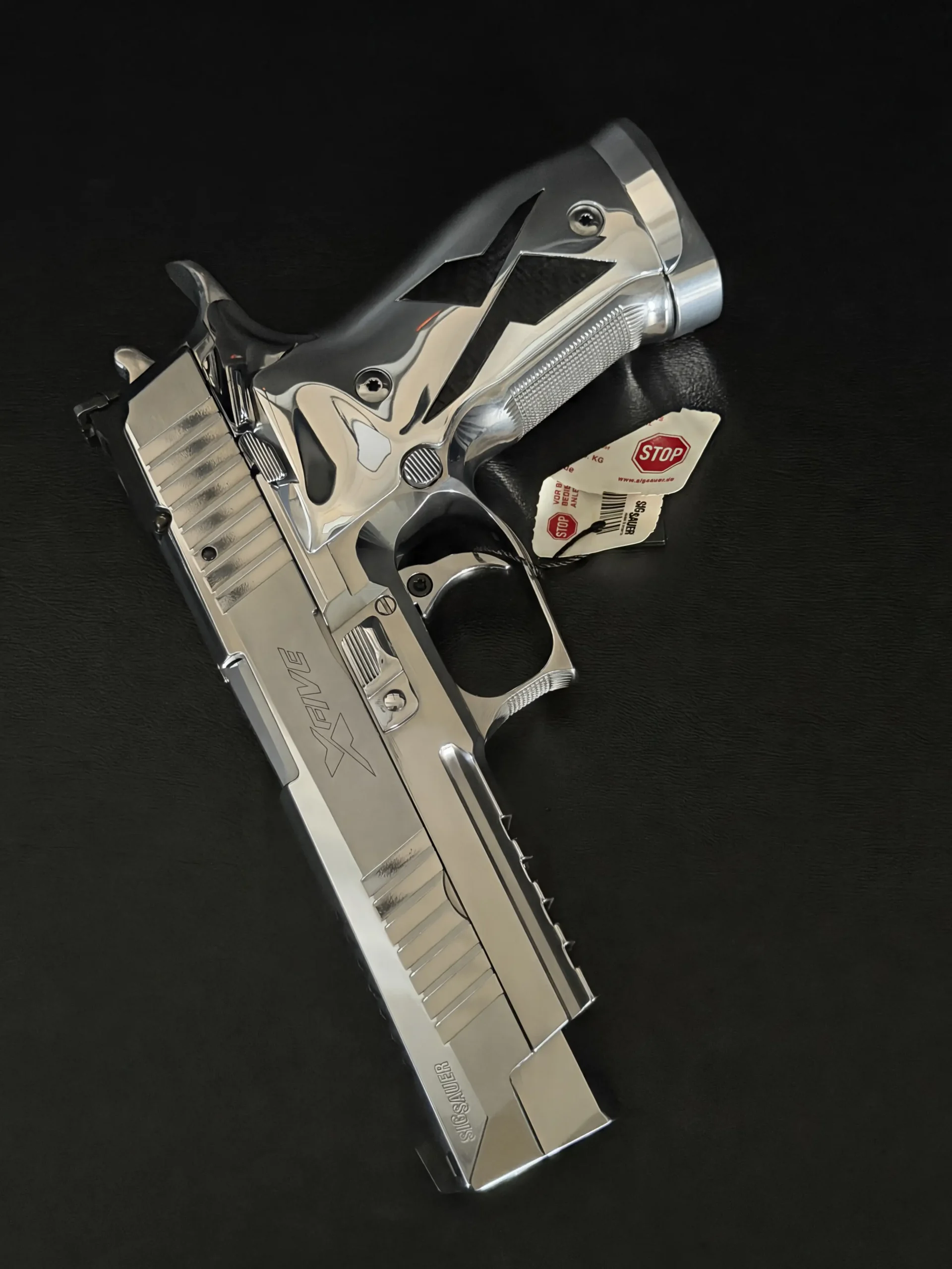 The polished chrome finish immediately sets the tone. Highly reflective yet impeccably controlled, it highlights the X-Five’s long slide, extended dust cover, and crisp machining lines without feeling excessive. Every surface transitions cleanly, reinforcing the sense that nothing here is accidental. The slide markings and engravings are sharp and well-defined, a testament to careful finishing rather than cosmetic plating.