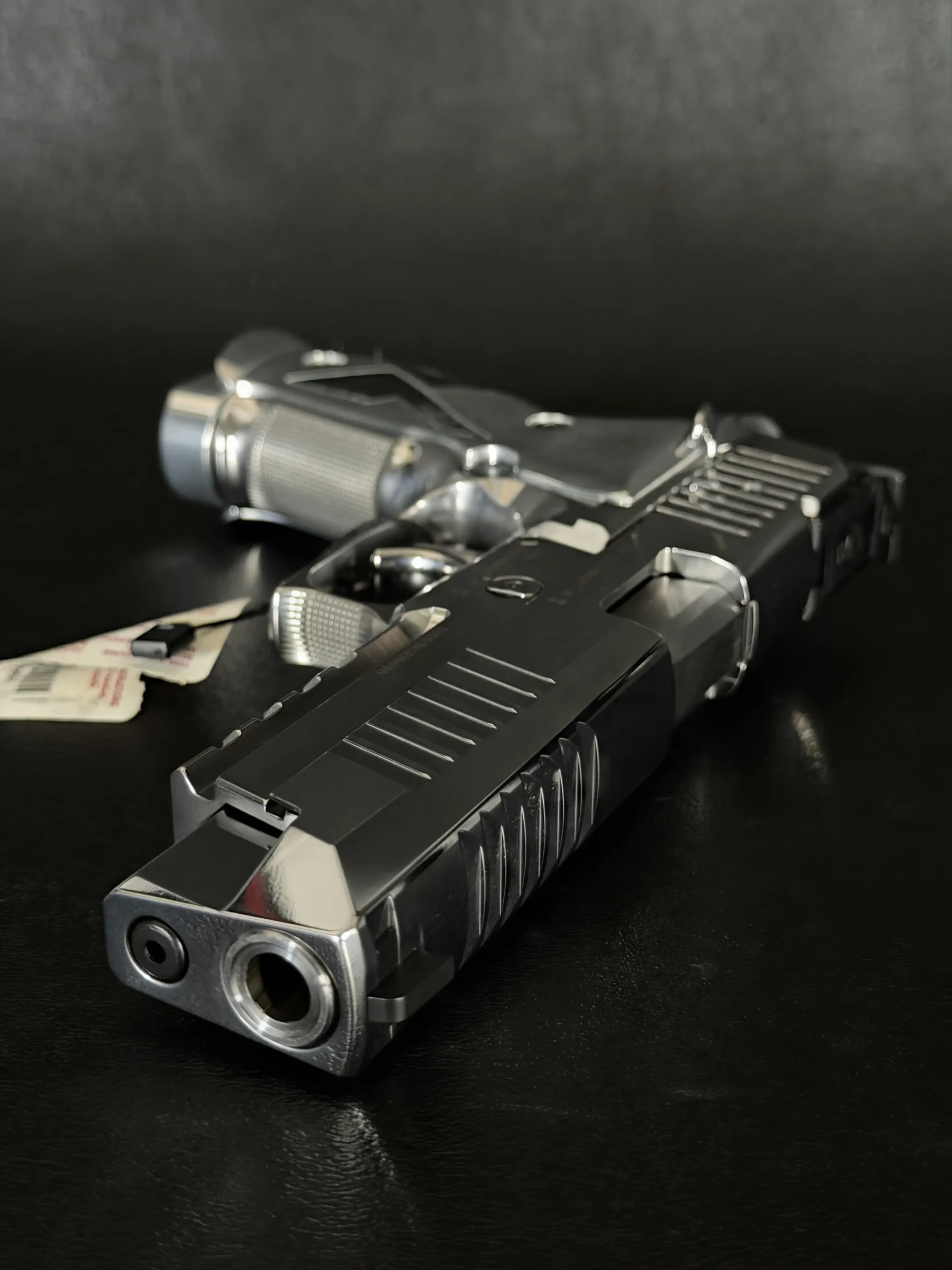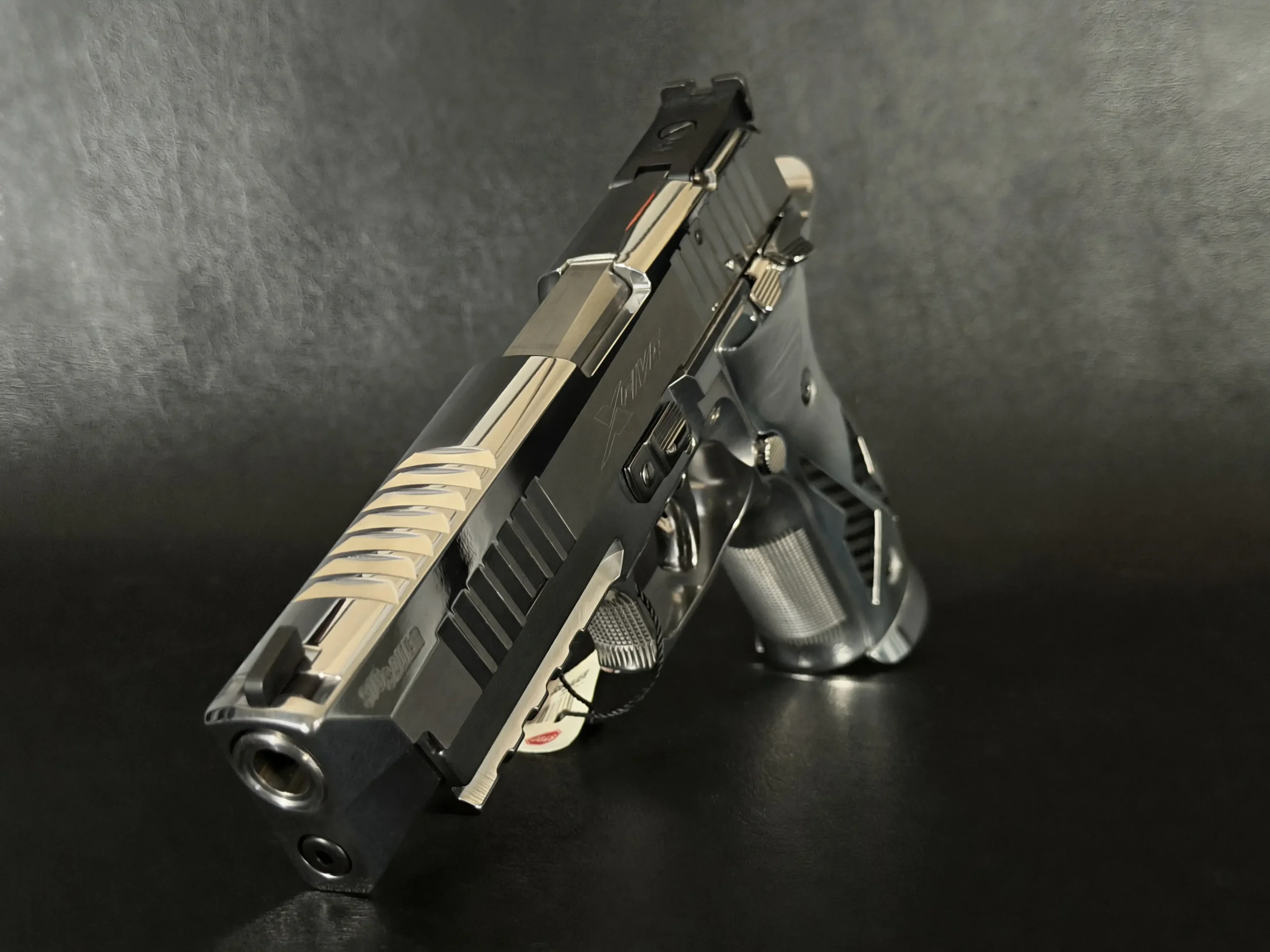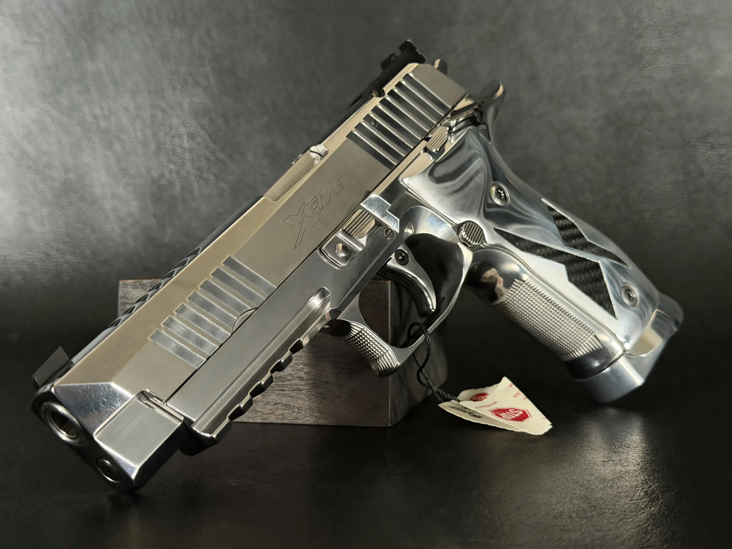 What truly elevates this example is the contrast provided by the carbon fiber grip panels. Set against the mirror-like chrome frame, they add depth and texture while reducing visual weight. The result is a pistol that feels purposeful in the hand and visually balanced on display. The ergonomic grip geometry, extended beavertail, and competition controls remain pure X-Five, designed for control, stability, and consistency shot after shot.