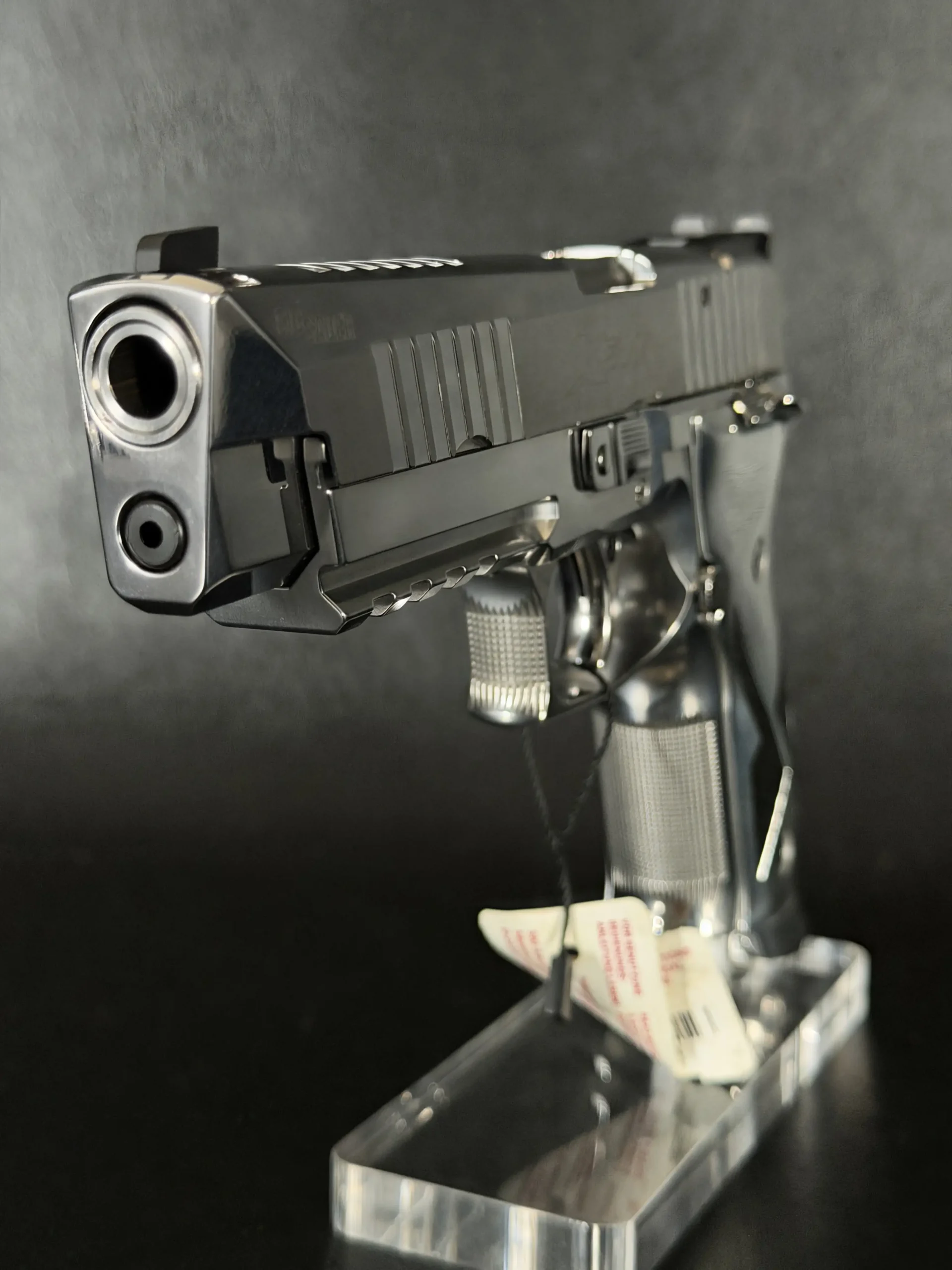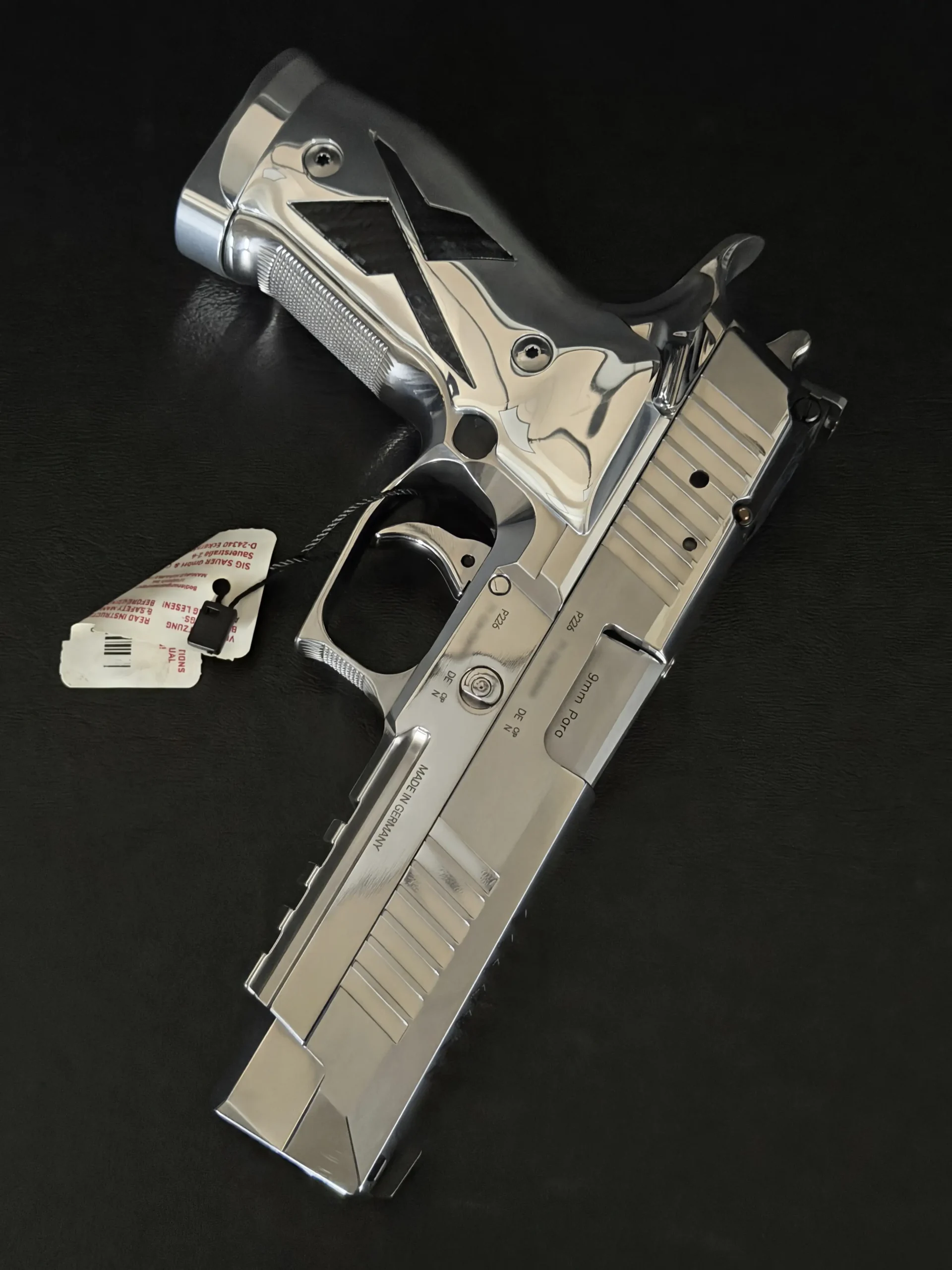 All visible components in this example are matching, reinforcing its integrity as a complete and correct presentation. For collectors who value craftsmanship, contrast, and the unmistakable presence of a Mastershop-era SIG, the P226 X-Five Chrome & Carbon stands as a refined and uncommon offering, equally at home in a curated collection or a high-end gallery display.
