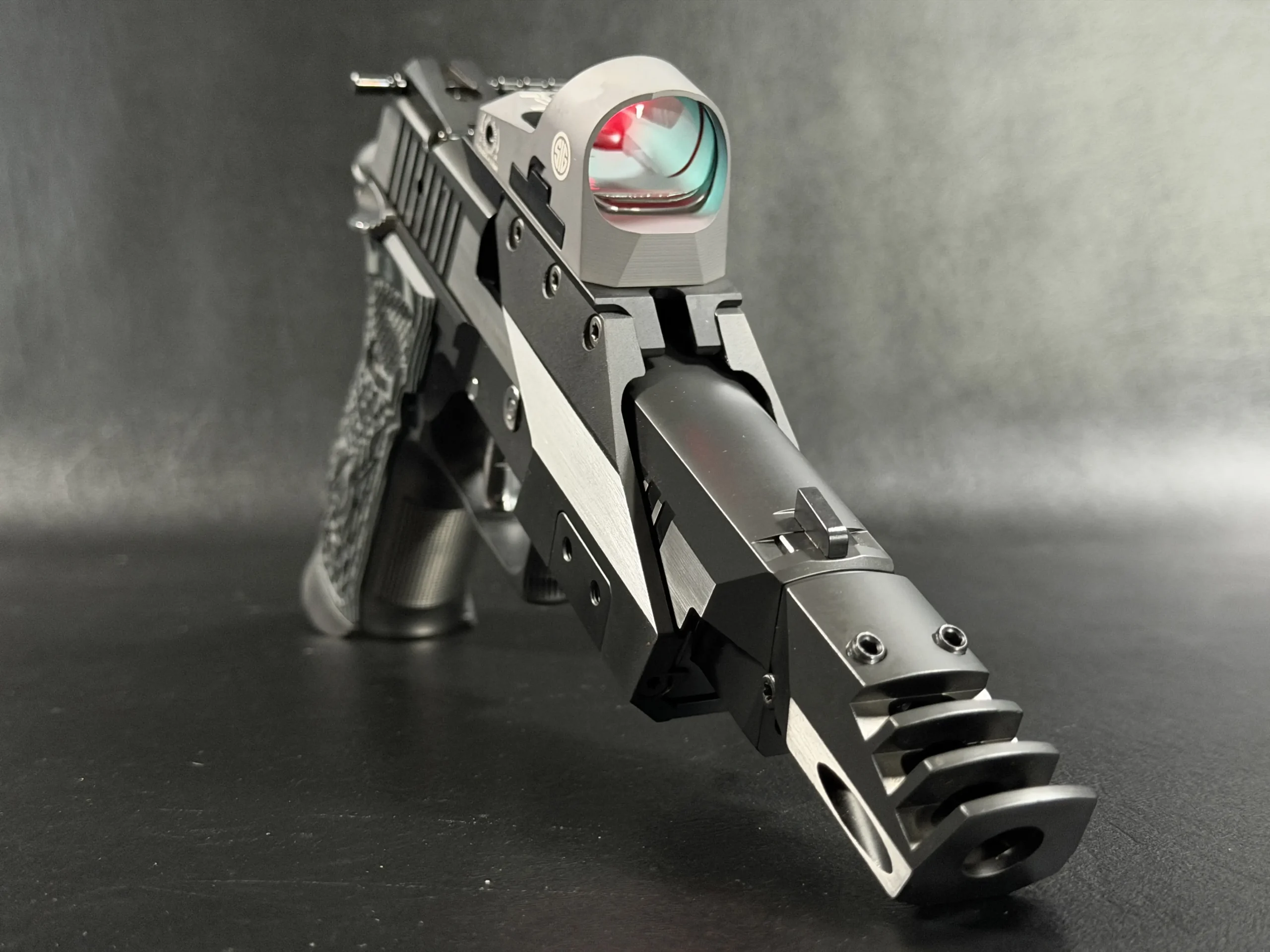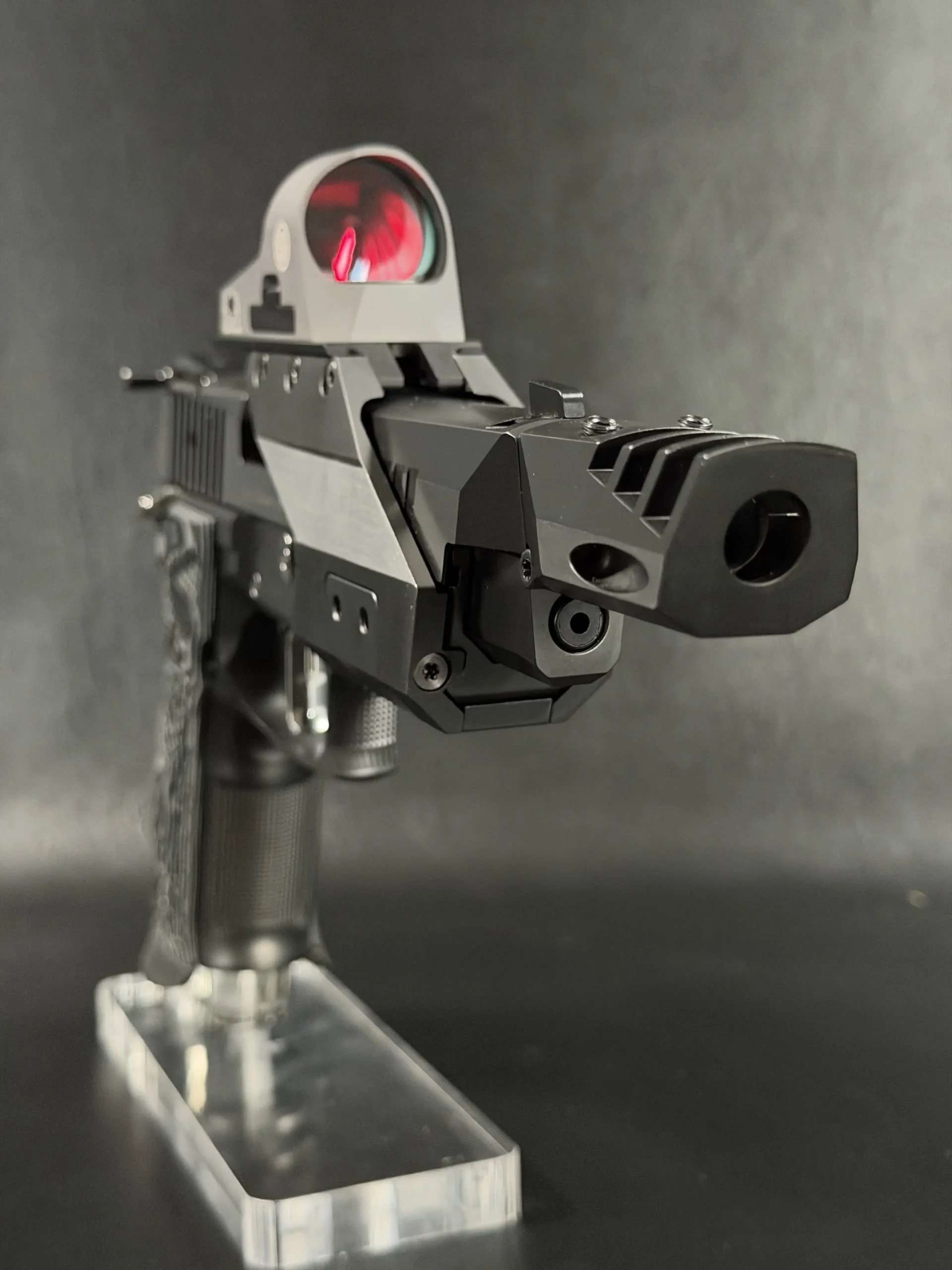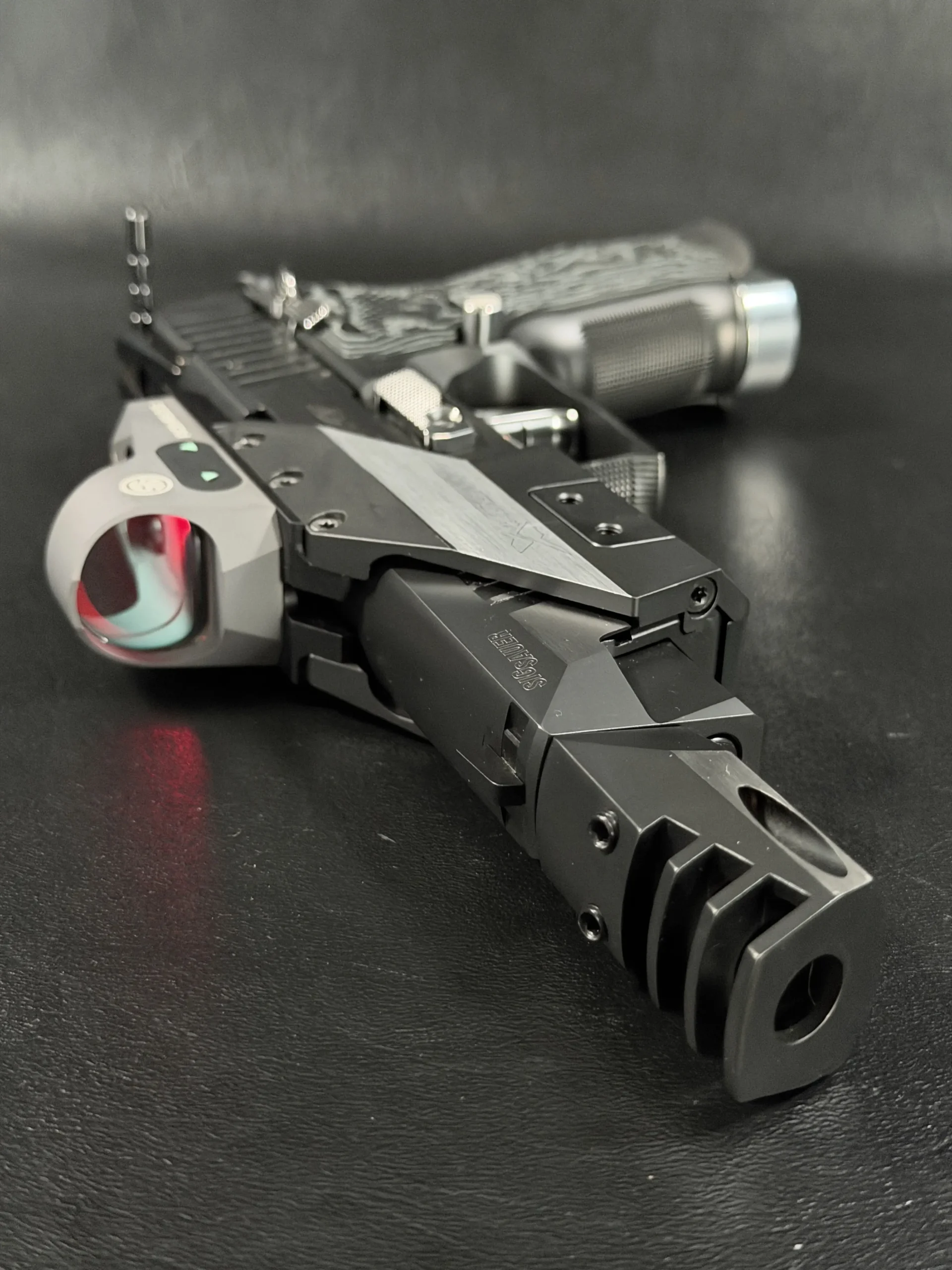 The contrasting black-and-white finish immediately sets the tone. It’s bold without being loud, technical without feeling sterile. Every surface feels deliberate, from the sculpted slide cuts to the precision-machined compensator, designed not just to manage recoil but to anchor the pistol’s forward presence visually. The result is a firearm that looks fast even at rest.