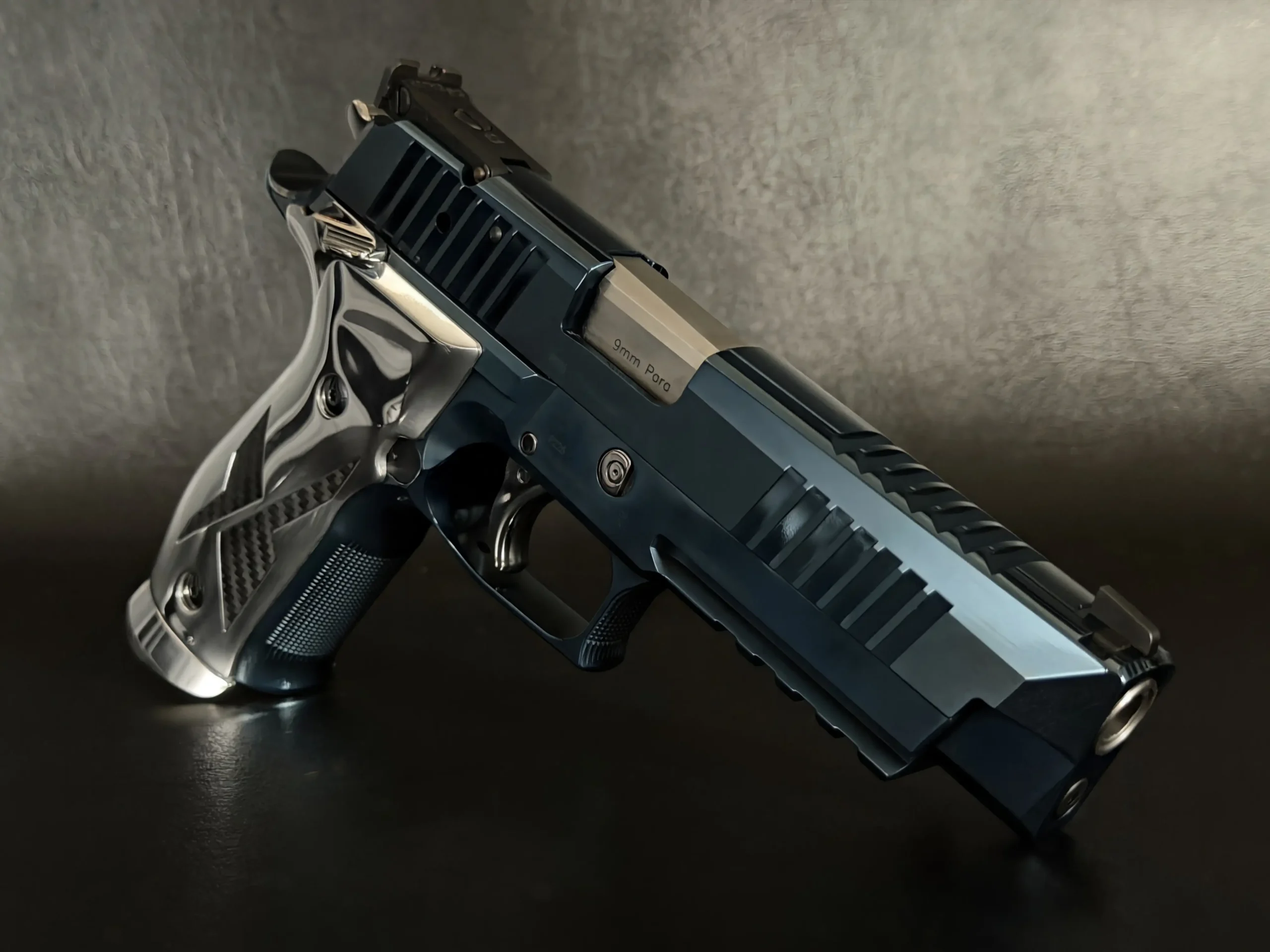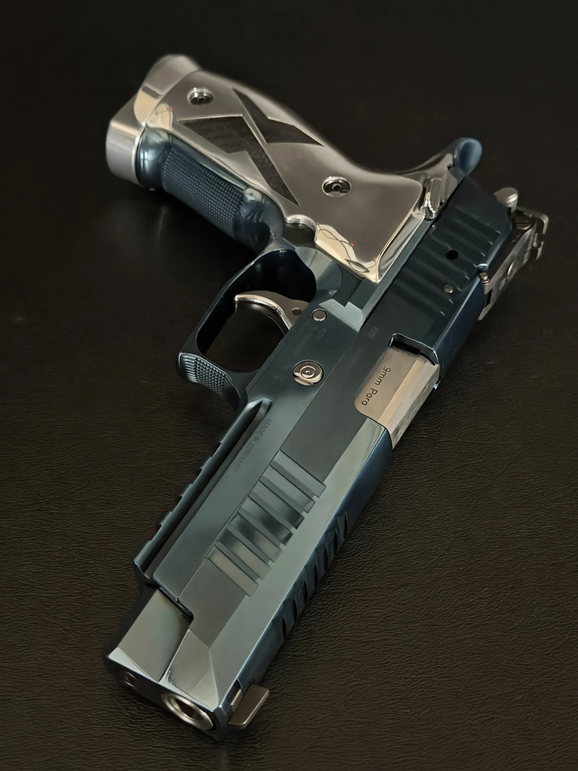 A true anomaly from the legendary SIG Sauer Mastershop, this P226 X-Five Titanium Blue stands as one of the rarest X-Series pistols ever produced, quite possibly the only example of its kind. Finished in a striking Titanium Blue slide paired with a mirror-polished stainless steel frame, the pistol offers a contrast that feels sculptural, almost automotive in its presence. Every surface has been carefully executed, from the deep metallic sheen of the slide to the reflective, multi-contoured frame panels that anchor the design.